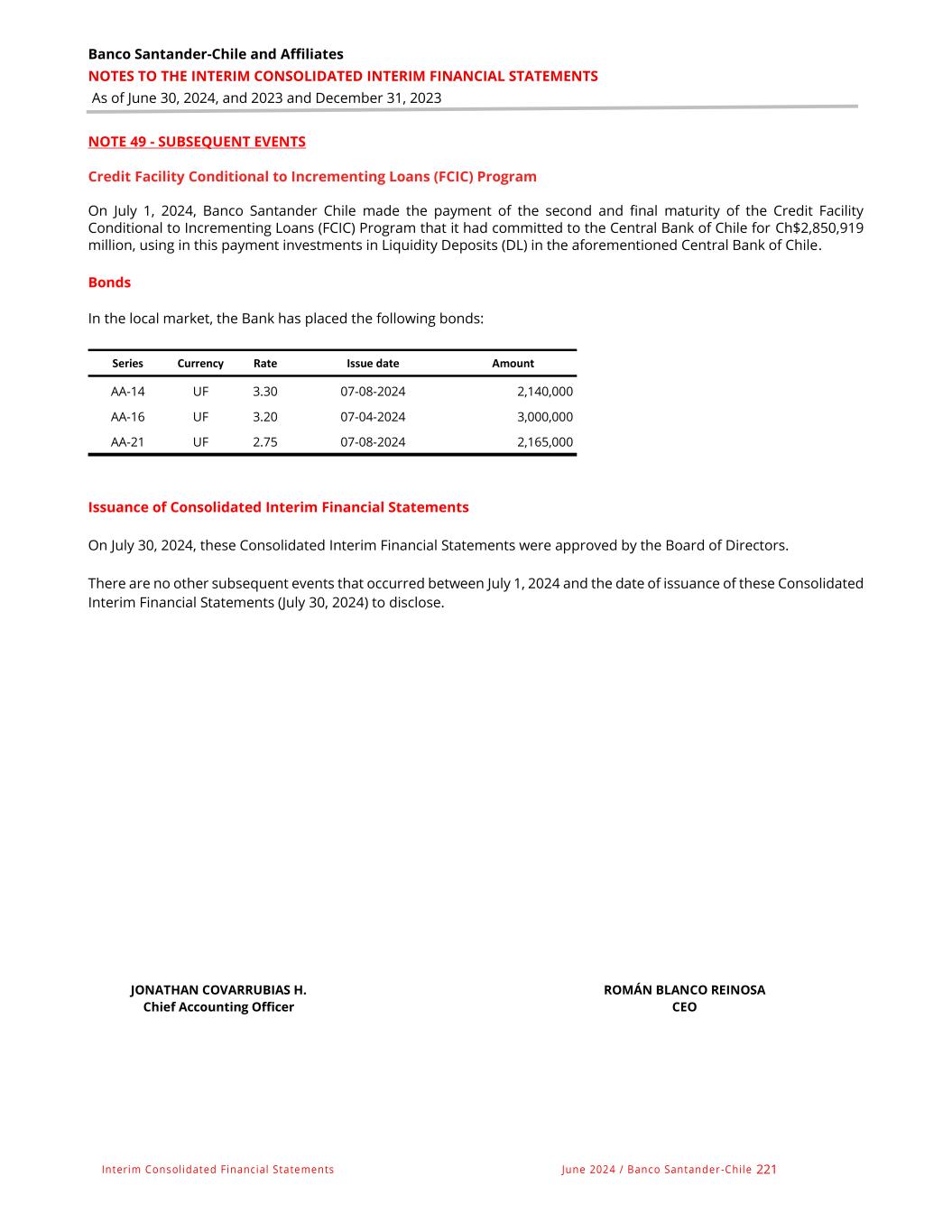 Banco Santander-Chile and Affiliates NOTES TO THE INTERIM CONSOLIDATED INTERIM FINANCIAL STATEMENTS As of June 30, 2024, and 2023 and December 31, 2023 Interim Consolidated Financial Statements June 2024 / Banco Santander -Chile 221 NOTE 49 - SUBSEQUENT EVENTS Credit Facility Conditional to Incrementing Loans (FCIC) Program On July 1, 2024, Banco Santander Chile made the payment of the second and final maturity of the Credit Facility Conditional to Incrementing Loans (FCIC) Program that it had committed to the Central Bank of Chile for Ch$2,850,919 million, using in this payment investments in Liquidity Deposits (DL) in the aforementioned Central Bank of Chile. Bonds In the local market, the Bank has placed the following bonds: Series Currency Rate Issue date Amount AA-14 UF 3.30 07-08-2024 2,140,000 AA-16 UF 3.20 07-04-2024 3,000,000 AA-21 UF 2.75 07-08-2024 2,165,000 Issuance of Consolidated Interim Financial Statements On July 30, 2024, these Consolidated Interim Financial Statements were approved by the Board of Directors. There are no other subsequent events that occurred between July 1, 2024 and the date of issuance of these Consolidated Interim Financial Statements (July 30, 2024) to disclose. JONATHAN COVARRUBIAS H. Chief Accounting Officer ROMÁN BLANCO REINOSA CEO