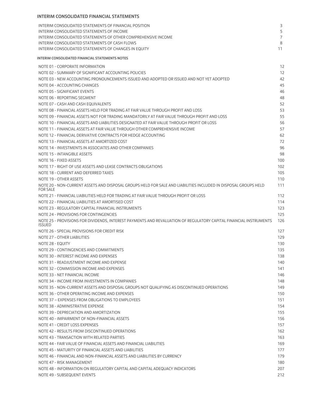 INTERIM CONSOLIDATED FINANCIAL STATEMENTS INTERIM CONSOLIDATED STATEMENTS OF INCOME 5 INTERIM CONSOLIDATED STATEMENTS OF OTHER COMPREHENSIVE INCOME 7 INTERIM CONSOLIDATED STATEMENTS OF CASH FLOWS 8 INTERIM CONSOLIDATED STATEMENTS OF CHANGES IN EQUITY 11 INTERIM CONSOLIDATED STATEMENTS OF FINANCIAL POSITION 3 INTERIM CONSOLIDATED FINANCIAL STATEMENTS NOTES NOTE 01 - CORPORATE INFORMATION 12 NOTE 02 - SUMMARY OF SIGNIFICANT ACCOUNTING POLICIES 12 NOTE 03 - NEW ACCOUNTING PRONOUNCEMENTS ISSUED AND ADOPTED OR ISSUED AND NOT YET ADOPTED 42 NOTE 04 - ACCOUNTING CHANGES 45 NOTE 05 - SIGNIFICANT EVENTS 46 NOTE 06 - REPORTING SEGMENT 48 NOTE 07 - CASH AND CASH EQUIVALENTS 52 NOTE 08 - FINANCIAL ASSETS HELD FOR TRADING AT FAIR VALUE THROUGH PROFIT AND LOSS 53 NOTE 09 - FINANCIAL ASSETS NOT FOR TRADING MANDATORILY AT FAIR VALUE THROUGH PROFIT AND LOSS 55 NOTE 10 - FINANCIAL ASSETS AND LIABILITIES DESIGNATED AT FAIR VALUE THROUGH PROFIT OR LOSS 56 NOTE 11 - FINANCIAL ASSETS AT FAIR VALUE THROUGH OTHER COMPREHENSIVE INCOME 57 NOTE 12 - FINANCIAL DERIVATIVE CONTRACTS FOR HEDGE ACCOUNTING 62 NOTE 13 - FINANCIAL ASSETS AT AMORTIZED COST 72 NOTE 14 - INVESTMENTS IN ASSOCIATES AND OTHER COMPANIES 96 NOTE 15 - INTANGIBLE ASSETS 98 NOTE 16 - FIXED ASSETS 100 NOTE 17 - RIGHT OF USE ASSETS AND LEASE CONTRACTS OBLIGATIONS 102 NOTE 18 - CURRENT AND DEFERRED TAXES 105 NOTE 19 - OTHER ASSETS 110 NOTE 20 - NON-CURRENT ASSETS AND DISPOSAL GROUPS HELD FOR SALE AND LIABILITIES INCLUDED IN DISPOSAL GROUPS HELD FOR SALE 111 NOTE 21 - FINANCIAL LIABILITIES HELD FOR TRADING AT FAIR VALUE THROUGH PROFIT OR LOSS 112 NOTE 22 - FINANCIAL LIABILITIES AT AMORTISED COST 114 NOTE 23 - REGULATORY CAPITAL FINANCIAL INSTRUMENTS 123 NOTE 24 - PROVISIONS FOR CONTINGENCIES 125 NOTE 25 - PROVISIONS FOR DIVIDENDS, INTEREST PAYMENTS AND REVALUATION OF REGULATORY CAPITAL FINANCIAL INSTRUMENTS ISSUED 126 NOTE 26 - SPECIAL PROVISIONS FOR CREDIT RISK 127 NOTE 27 - OTHER LIABILITIES 129 NOTE 28 - EQUITY 130 NOTE 29 - CONTINGENCIES AND COMMITMENTS 135 NOTE 30 - INTEREST INCOME AND EXPENSES 138 NOTE 31 - READJUSTMENT INCOME AND EXPENSE 140 NOTE 32 - COMMISSION INCOME AND EXPENSES 141 NOTE 33 - NET FINANCIAL INCOME 146 NOTE 34 - INCOME FROM INVESTMENTS IN COMPANIES 148 NOTE 35 - NON-CURRENT ASSETS AND DISPOSAL GROUPS NOT QUALIFYING AS DISCONTINUED OPERATIONS 149 NOTE 36 - OTHER OPERATING INCOME AND EXPENSES 150 NOTE 37 – EXPENSES FROM OBLIGATIONS TO EMPLOYEES 151 NOTE 38 - ADMINISTRATIVE EXPENSE 154 NOTE 39 - DEPRECIATION AND AMORTIZATION 155 NOTE 40 - IMPAIRMENT OF NON-FINANCIAL ASSETS 156 NOTE 41 - CREDIT LOSS EXPENSES 157 NOTE 42 - RESULTS FROM DISCONTINUED OPERATIONS 162 NOTE 43 - TRANSACTION WITH RELATED PARTIES 163 NOTE 44 - FAIR VALUE OF FINANCIAL ASSETS AND FINANCIAL LIABILITIES 169 NOTE 45 - MATURITY OF FINANCIAL ASSETS AND LIABILITIES 177 NOTE 46 - FINANCIAL AND NON-FINANCIAL ASSETS AND LIABILITIES BY CURRENCY 179 NOTE 47 - RISK MANAGEMENT 180 NOTE 48 - INFORMATION ON REGULATORY CAPITAL AND CAPITAL ADEQUACY INDICATORS 207 NOTE 49 - SUBSEQUENT EVENTS 212