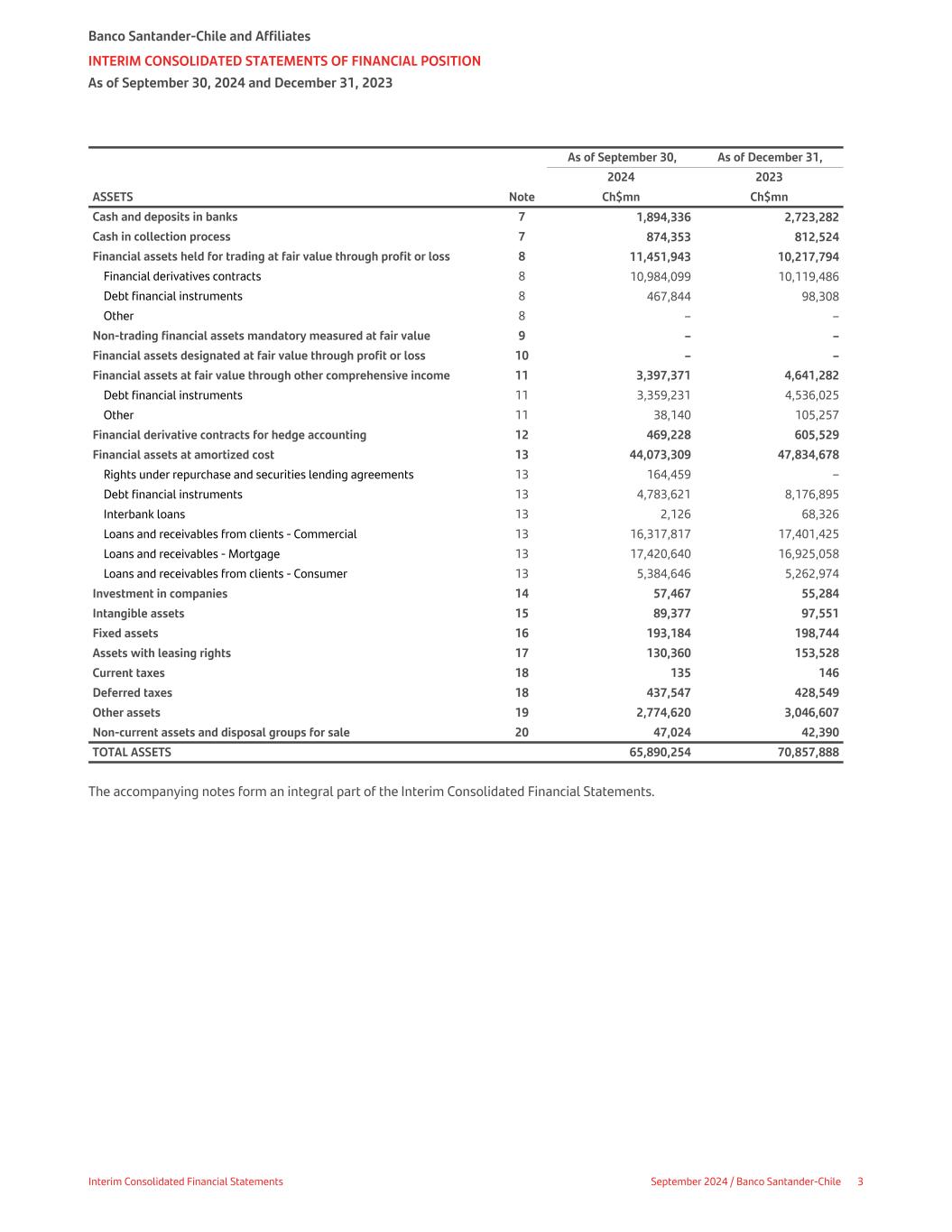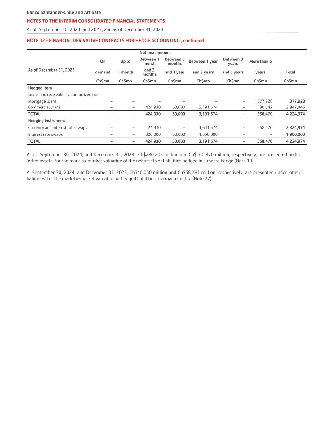 NOTE 12 - FINANCIAL DERIVATIVE CONTRACTS FOR HEDGE ACCOUNTING , continued   Notional amount       On Up to Between 1 month Between 3 months Between 1 year Between 3 years More than 5 As of December 31, 2023 demand 1 month and 3 months and 1 year and 3 years and 5 years years Total   Ch$mn Ch$mn Ch$mn Ch$mn Ch$mn Ch$mn Ch$mn Ch$mn Hedged item Loans and receivables at amortized cost Mortgage loans – – – – – – 377,928 377,928 Commercial loans – – 424,930 50,000 3,191,574 – 180,542 3,847,046 TOTAL – – 424,930 50,000 3,191,574 – 558,470 4,224,974 Hedging instrument Currency and interest rate swaps – – 124,930 – 1,641,574 – 558,470 2,324,974 Interest rate swaps – – 300,000 50,000 1,550,000 – – 1,900,000 TOTAL – – 424,930 50,000 3,191,574 – 558,470 4,224,974 As of September 30, 2024, and December 31, 2023, Ch$280,205 million and Ch$160,370 million, respectively, are presented under 'other assets' for the mark-to-market valuation of the net assets or liabilities hedged in a macro hedge (Note 19). Al September 30, 2024, and December 31, 2023, Ch$46,050 million and Ch$68,781 million, respectively, are presented under 'other liabilities' for the mark-to-market valuation of hedged liabilities in a macro hedge (Note 27). Banco Santander-Chile and Affiliate NOTES TO THE INTERIM CONSOLIDATED FINANCIAL STATEMENTS As of September 30, 2024, and 2023, and as of December 31, 2023
