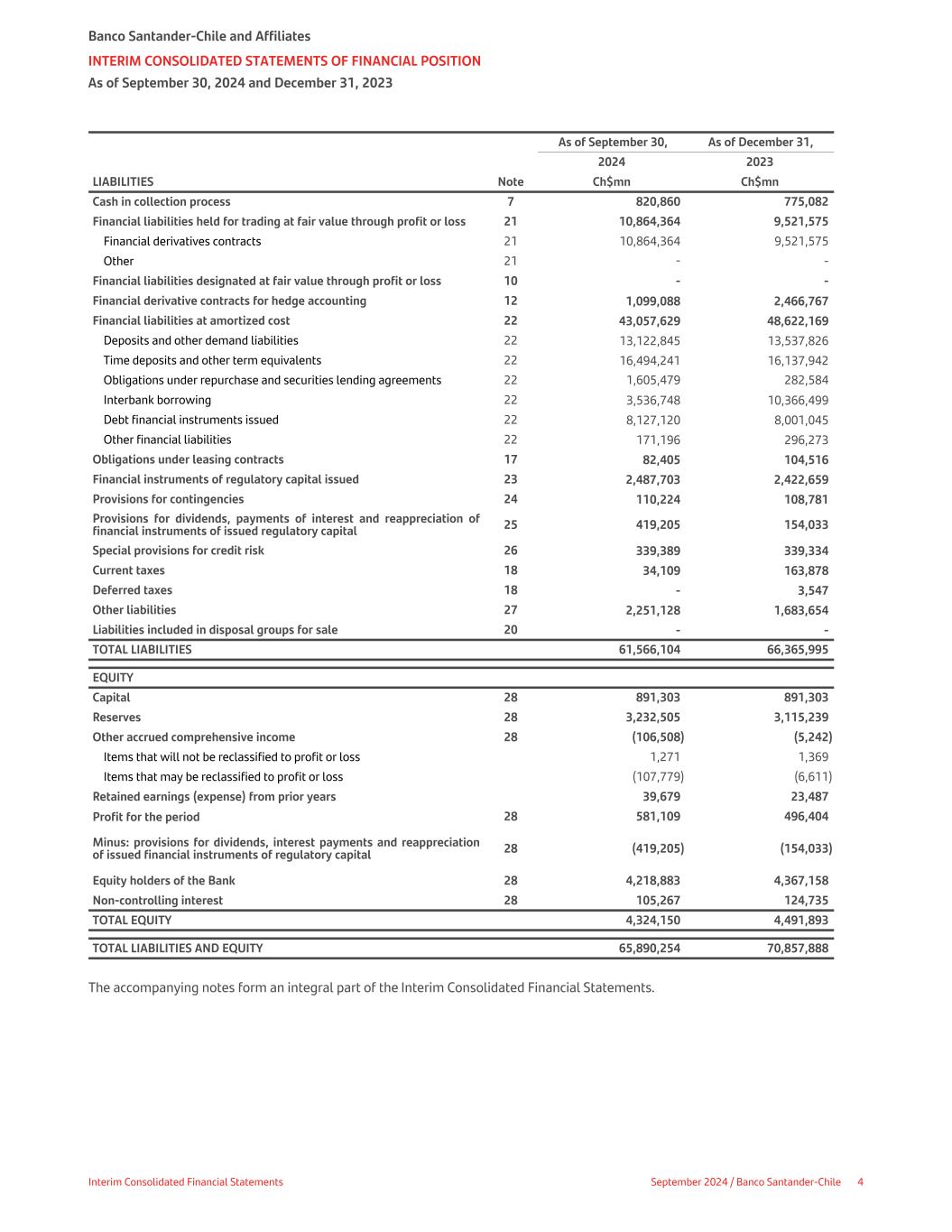 As of September 30, As of December 31, 2024 2023 LIABILITIES Note Ch$mn Ch$mn Cash in collection process 7 820,860 775,082 Financial liabilities held for trading at fair value through profit or loss 21 10,864,364 9,521,575 Financial derivatives contracts 21 10,864,364 9,521,575 Other 21 - - Financial liabilities designated at fair value through profit or loss 10 - - Financial derivative contracts for hedge accounting 12 1,099,088 2,466,767 Financial liabilities at amortized cost 22 43,057,629 48,622,169 Deposits and other demand liabilities 22 13,122,845 13,537,826 Time deposits and other term equivalents 22 16,494,241 16,137,942 Obligations under repurchase and securities lending agreements 22 1,605,479 282,584 Interbank borrowing 22 3,536,748 10,366,499 Debt financial instruments issued 22 8,127,120 8,001,045 Other financial liabilities 22 171,196 296,273 Obligations under leasing contracts 17 82,405 104,516 Financial instruments of regulatory capital issued 23 2,487,703 2,422,659 Provisions for contingencies 24 110,224 108,781 Provisions for dividends, payments of interest and reappreciation of financial instruments of issued regulatory capital 25 419,205 154,033 Special provisions for credit risk 26 339,389 339,334 Current taxes 18 34,109 163,878 Deferred taxes 18 - 3,547 Other liabilities 27 2,251,128 1,683,654 Liabilities included in disposal groups for sale 20 - - TOTAL LIABILITIES 61,566,104 66,365,995 EQUITY Capital 28 891,303 891,303 Reserves 28 3,232,505 3,115,239 Other accrued comprehensive income 28 (106,508) (5,242) Items that will not be reclassified to profit or loss 1,271 1,369 Items that may be reclassified to profit or loss (107,779) (6,611) Retained earnings (expense) from prior years 39,679 23,487 Profit for the period 28 581,109 496,404 Minus: provisions for dividends, interest payments and reappreciation of issued financial instruments of regulatory capital 28 (419,205) (154,033) Equity holders of the Bank 28 4,218,883 4,367,158 Non-controlling interest 28 105,267 124,735 TOTAL EQUITY 4,324,150 4,491,893 TOTAL LIABILITIES AND EQUITY 65,890,254 70,857,888 The accompanying notes form an integral part of the Interim Consolidated Financial Statements. Banco Santander-Chile and Affiliates INTERIM CONSOLIDATED STATEMENTS OF FINANCIAL POSITION As of September 30, 2024 and December 31, 2023 Interim Consolidated Financial Statements September 2024 / Banco Santander-Chile 4