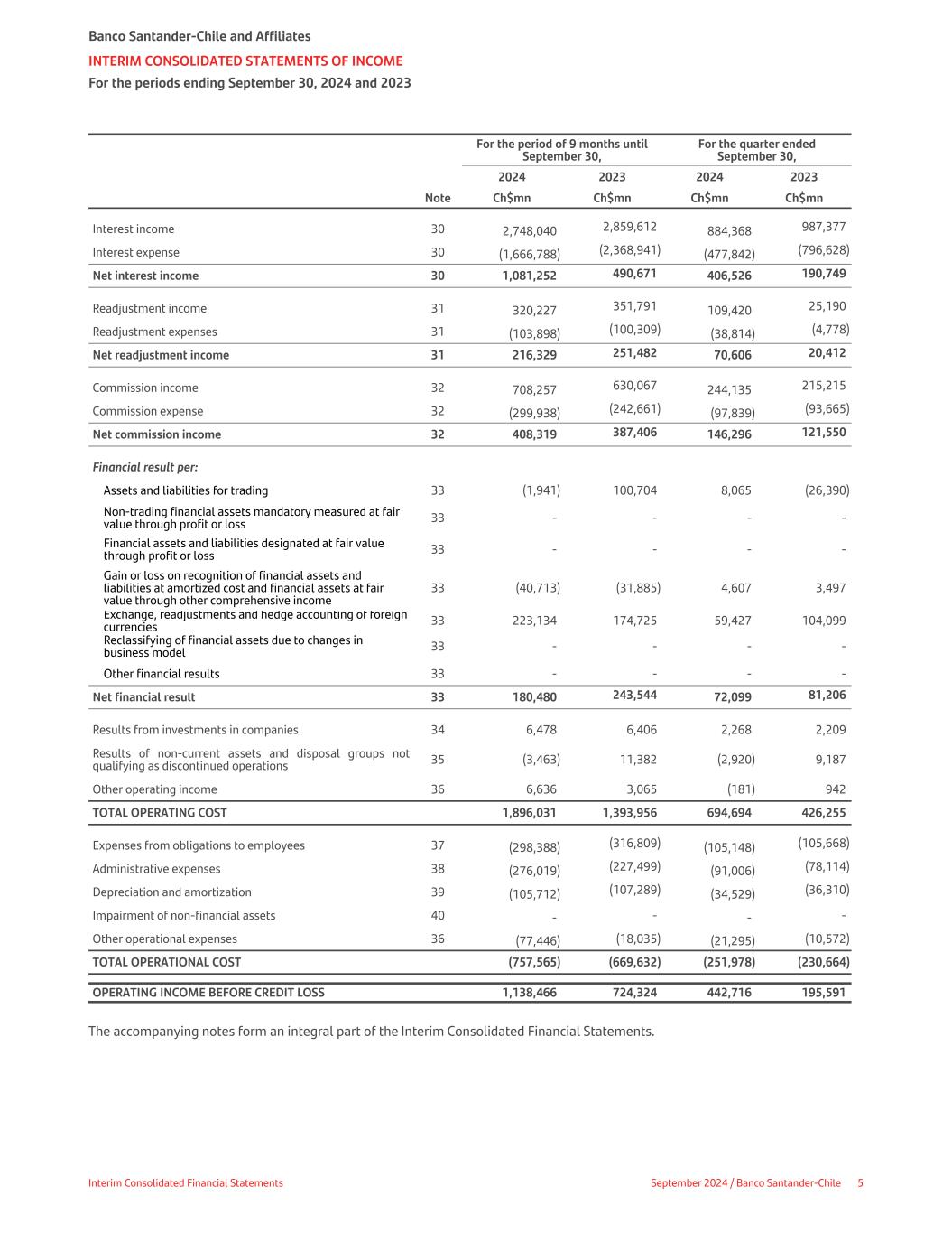 For the period of 9 months until September 30, For the quarter ended September 30, 2024 2023 2024 2023 Note Ch$mn Ch$mn Ch$mn Ch$mn Interest income 30 2,748,040 2,859,612 884,368 987,377 Interest expense 30 (1,666,788) (2,368,941) (477,842) (796,628) Net interest income 30 1,081,252 490,671 406,526 190,749 Readjustment income 31 320,227 351,791 109,420 25,190 Readjustment expenses 31 (103,898) (100,309) (38,814) (4,778) Net readjustment income 31 216,329 251,482 70,606 20,412 Commission income 32 708,257 630,067 244,135 215,215 Commission expense 32 (299,938) (242,661) (97,839) (93,665) Net commission income 32 408,319 387,406 146,296 121,550 Financial result per: Assets and liabilities for trading 33 (1,941) 100,704 8,065 (26,390) Non-trading financial assets mandatory measured at fair value through profit or loss 33 - - - - Financial assets and liabilities designated at fair value through profit or loss 33 - - - - Gain or loss on recognition of financial assets and liabilities at amortized cost and financial assets at fair value through other comprehensive income 33 (40,713) (31,885) 4,607 3,497 Exchange, readjustments and hedge accounting of foreign currencies 33 223,134 174,725 59,427 104,099 Reclassifying of financial assets due to changes in business model 33 - - - - Other financial results 33 - - - - Net financial result 33 180,480 243,544 72,099 81,206 Results from investments in companies 34 6,478 6,406 2,268 2,209 Results of non-current assets and disposal groups not qualifying as discontinued operations 35 (3,463) 11,382 (2,920) 9,187 Other operating income 36 6,636 3,065 (181) 942 TOTAL OPERATING COST 1,896,031 1,393,956 694,694 426,255 Expenses from obligations to employees 37 (298,388) (316,809) (105,148) (105,668) Administrative expenses 38 (276,019) (227,499) (91,006) (78,114) Depreciation and amortization 39 (105,712) (107,289) (34,529) (36,310) Impairment of non-financial assets 40 - - - - Other operational expenses 36 (77,446) (18,035) (21,295) (10,572) TOTAL OPERATIONAL COST (757,565) (669,632) (251,978) (230,664) OPERATING INCOME BEFORE CREDIT LOSS 1,138,466 724,324 442,716 195,591 The accompanying notes form an integral part of the Interim Consolidated Financial Statements. Banco Santander-Chile and Affiliates INTERIM CONSOLIDATED STATEMENTS OF INCOME For the periods ending September 30, 2024 and 2023 Interim Consolidated Financial Statements September 2024 / Banco Santander-Chile 5