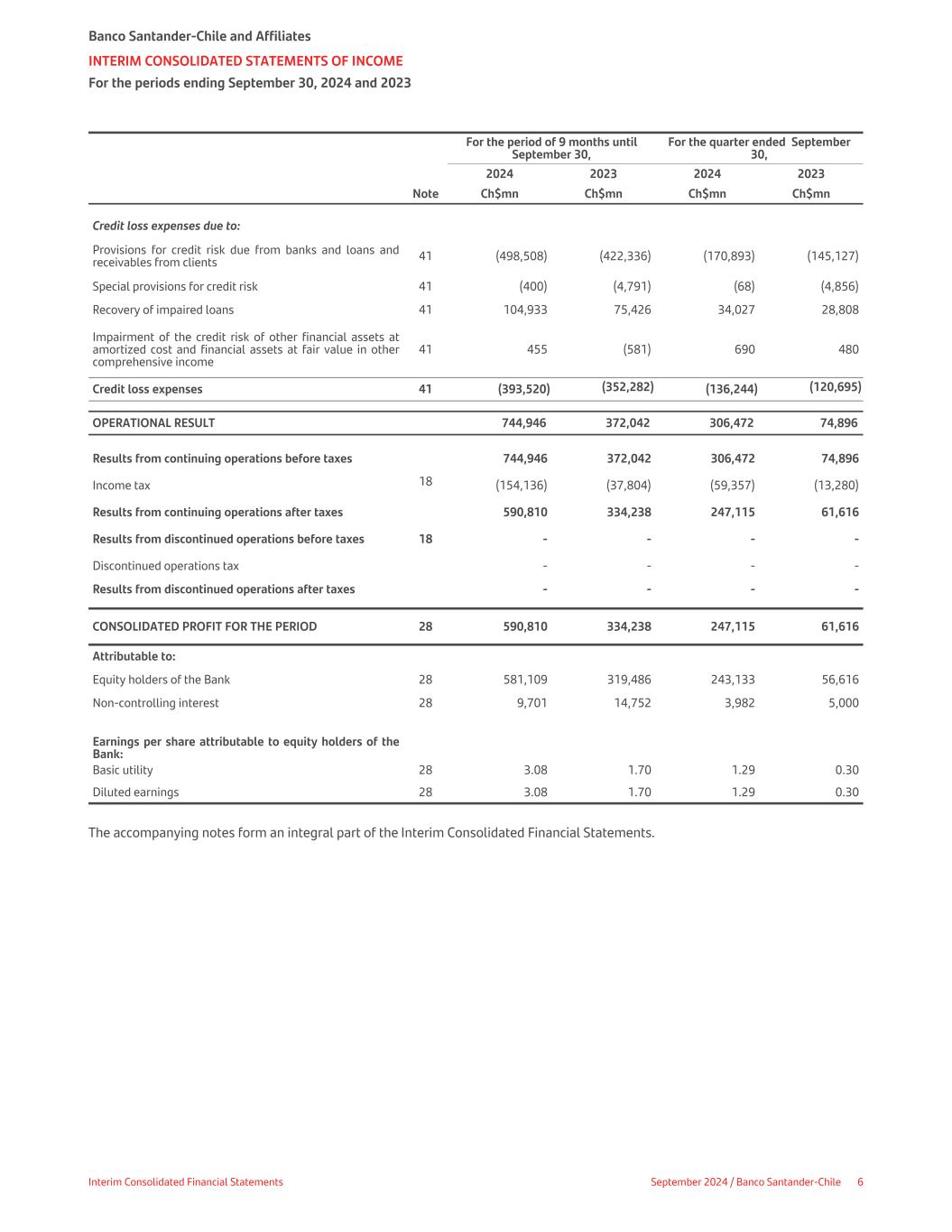 For the period of 9 months until September 30, For the quarter ended September 30, 2024 2023 2024 2023 Note Ch$mn Ch$mn Ch$mn Ch$mn Credit loss expenses due to: Provisions for credit risk due from banks and loans and receivables from clients 41 (498,508) (422,336) (170,893) (145,127) Special provisions for credit risk 41 (400) (4,791) (68) (4,856) Recovery of impaired loans 41 104,933 75,426 34,027 28,808 Impairment of the credit risk of other financial assets at amortized cost and financial assets at fair value in other comprehensive income 41 455 (581) 690 480 Credit loss expenses 41 (393,520) (352,282) (136,244) (120,695) OPERATIONAL RESULT 744,946 372,042 306,472 74,896 Results from continuing operations before taxes 744,946 372,042 306,472 74,896 Income tax 18 (154,136) (37,804) (59,357) (13,280) Results from continuing operations after taxes 590,810 334,238 247,115 61,616 Results from discontinued operations before taxes 18 - - - - Discontinued operations tax - - - - Results from discontinued operations after taxes - - - - CONSOLIDATED PROFIT FOR THE PERIOD 28 590,810 334,238 247,115 61,616 Attributable to: Equity holders of the Bank 28 581,109 319,486 243,133 56,616 Non-controlling interest 28 9,701 14,752 3,982 5,000 Earnings per share attributable to equity holders of the Bank: Basic utility 28 3.08 1.70 1.29 0.30 Diluted earnings 28 3.08 1.70 1.29 0.30 The accompanying notes form an integral part of the Interim Consolidated Financial Statements. Banco Santander-Chile and Affiliates INTERIM CONSOLIDATED STATEMENTS OF INCOME For the periods ending September 30, 2024 and 2023 Interim Consolidated Financial Statements September 2024 / Banco Santander-Chile 6