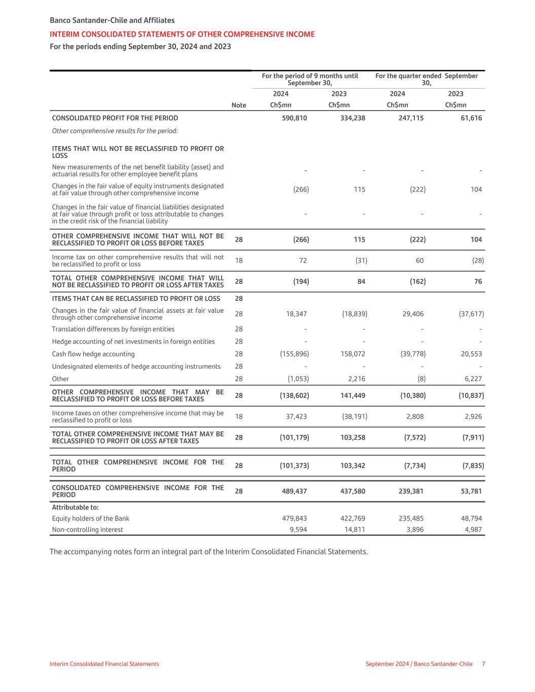 For the period of 9 months until September 30, For the quarter ended September 30, 2024 2023 2024 2023   Note Ch$mn Ch$mn Ch$mn Ch$mn CONSOLIDATED PROFIT FOR THE PERIOD 590,810 334,238 247,115 61,616 Other comprehensive results for the period: ITEMS THAT WILL NOT BE RECLASSIFIED TO PROFIT OR LOSS New measurements of the net benefit liability (asset) and actuarial results for other employee benefit plans - - - - Changes in the fair value of equity instruments designated at fair value through other comprehensive income (266) 115 (222) 104 Changes in the fair value of financial liabilities designated at fair value through profit or loss attributable to changes in the credit risk of the financial liability - - - - OTHER COMPREHENSIVE INCOME THAT WILL NOT BE RECLASSIFIED TO PROFIT OR LOSS BEFORE TAXES 28 (266) 115 (222) 104 Income tax on other comprehensive results that will not be reclassified to profit or loss 18 72 (31) 60 (28) TOTAL OTHER COMPREHENSIVE INCOME THAT WILL NOT BE RECLASSIFIED TO PROFIT OR LOSS AFTER TAXES 28 (194) 84 (162) 76 ITEMS THAT CAN BE RECLASSIFIED TO PROFIT OR LOSS 28 Changes in the fair value of financial assets at fair value through other comprehensive income 28 18,347 (18,839) 29,406 (37,617) Translation differences by foreign entities 28 - - - - Hedge accounting of net investments in foreign entities 28 - - - - Cash flow hedge accounting 28 (155,896) 158,072 (39,778) 20,553 Undesignated elements of hedge accounting instruments 28 - - - - Other 28 (1,053) 2,216 (8) 6,227 OTHER COMPREHENSIVE INCOME THAT MAY BE RECLASSIFIED TO PROFIT OR LOSS BEFORE TAXES 28 (138,602) 141,449 (10,380) (10,837) Income taxes on other comprehensive income that may be reclassified to profit or loss 18 37,423 (38,191) 2,808 2,926 TOTAL OTHER COMPREHENSIVE INCOME THAT MAY BE RECLASSIFIED TO PROFIT OR LOSS AFTER TAXES 28 (101,179) 103,258 (7,572) (7,911) TOTAL OTHER COMPREHENSIVE INCOME FOR THE PERIOD 28 (101,373) 103,342 (7,734) (7,835) CONSOLIDATED COMPREHENSIVE INCOME FOR THE PERIOD 28 489,437 437,580 239,381 53,781 Attributable to: Equity holders of the Bank 479,843 422,769 235,485 48,794 Non-controlling interest 9,594 14,811 3,896 4,987 The accompanying notes form an integral part of the Interim Consolidated Financial Statements. Banco Santander-Chile and Affiliates INTERIM CONSOLIDATED STATEMENTS OF OTHER COMPREHENSIVE INCOME For the periods ending September 30, 2024 and 2023 Interim Consolidated Financial Statements September 2024 / Banco Santander-Chile 7