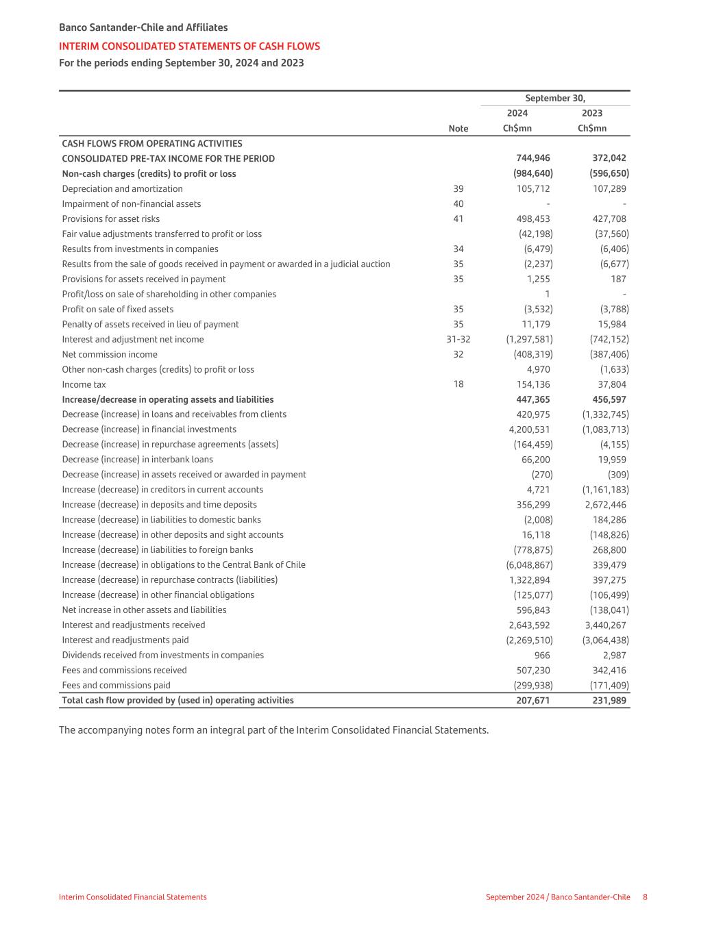 September 30, 2024 2023    Note Ch$mn Ch$mn CASH FLOWS FROM OPERATING ACTIVITIES CONSOLIDATED PRE-TAX INCOME FOR THE PERIOD 744,946 372,042 Non-cash charges (credits) to profit or loss (984,640) (596,650) Depreciation and amortization 39 105,712 107,289 Impairment of non-financial assets 40 - - Provisions for asset risks 41 498,453 427,708 Fair value adjustments transferred to profit or loss (42,198) (37,560) Results from investments in companies 34 (6,479) (6,406) Results from the sale of goods received in payment or awarded in a judicial auction 35 (2,237) (6,677) Provisions for assets received in payment 35 1,255 187 Profit/loss on sale of shareholding in other companies 1 - Profit on sale of fixed assets 35 (3,532) (3,788) Penalty of assets received in lieu of payment 35 11,179 15,984 Interest and adjustment net income 31-32 (1,297,581) (742,152) Net commission income 32 (408,319) (387,406) Other non-cash charges (credits) to profit or loss 4,970 (1,633) Income tax 18 154,136 37,804 Increase/decrease in operating assets and liabilities 447,365 456,597 Decrease (increase) in loans and receivables from clients 420,975 (1,332,745) Decrease (increase) in financial investments 4,200,531 (1,083,713) Decrease (increase) in repurchase agreements (assets) (164,459) (4,155) Decrease (increase) in interbank loans 66,200 19,959 Decrease (increase) in assets received or awarded in payment (270) (309) Increase (decrease) in creditors in current accounts 4,721 (1,161,183) Increase (decrease) in deposits and time deposits 356,299 2,672,446 Increase (decrease) in liabilities to domestic banks (2,008) 184,286 Increase (decrease) in other deposits and sight accounts 16,118 (148,826) Increase (decrease) in liabilities to foreign banks (778,875) 268,800 Increase (decrease) in obligations to the Central Bank of Chile (6,048,867) 339,479 Increase (decrease) in repurchase contracts (liabilities) 1,322,894 397,275 Increase (decrease) in other financial obligations (125,077) (106,499) Net increase in other assets and liabilities 596,843 (138,041) Interest and readjustments received 2,643,592 3,440,267 Interest and readjustments paid (2,269,510) (3,064,438) Dividends received from investments in companies 966 2,987 Fees and commissions received 507,230 342,416 Fees and commissions paid (299,938) (171,409) Total cash flow provided by (used in) operating activities 207,671 231,989 The accompanying notes form an integral part of the Interim Consolidated Financial Statements. Banco Santander-Chile and Affiliates INTERIM CONSOLIDATED STATEMENTS OF CASH FLOWS For the periods ending September 30, 2024 and 2023 Interim Consolidated Financial Statements September 2024 / Banco Santander-Chile 8