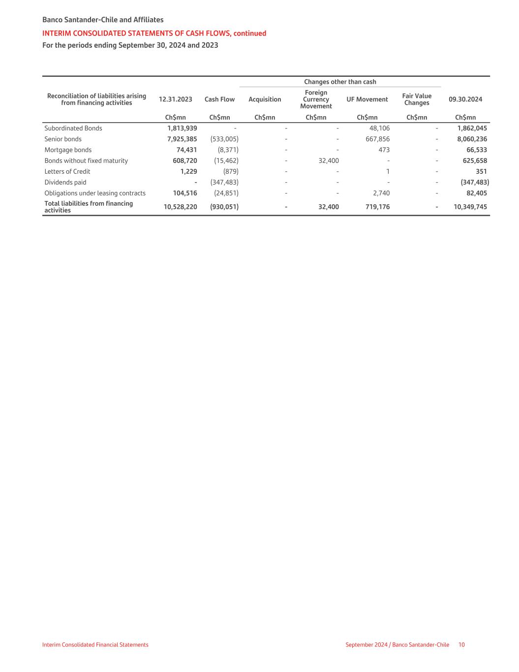 Changes other than cash Reconciliation of liabilities arising from financing activities 12.31.2023 Cash Flow Acquisition Foreign Currency Movement UF Movement Fair Value Changes 09.30.2024 Ch$mn Ch$mn Ch$mn Ch$mn Ch$mn Ch$mn Ch$mn Subordinated Bonds 1,813,939 - - - 48,106 - 1,862,045 Senior bonds 7,925,385 (533,005) - - 667,856 - 8,060,236 Mortgage bonds 74,431 (8,371) - - 473 - 66,533 Bonds without fixed maturity 608,720 (15,462) - 32,400 - - 625,658 Letters of Credit 1,229 (879) - - 1 - 351 Dividends paid - (347,483) - - - - (347,483) Obligations under leasing contracts 104,516 (24,851) - - 2,740 - 82,405 Total liabilities from financing activities 10,528,220 (930,051) - 32,400 719,176 - 10,349,745 Banco Santander-Chile and Affiliates INTERIM CONSOLIDATED STATEMENTS OF CASH FLOWS, continued For the periods ending September 30, 2024 and 2023 Interim Consolidated Financial Statements September 2024 / Banco Santander-Chile 10