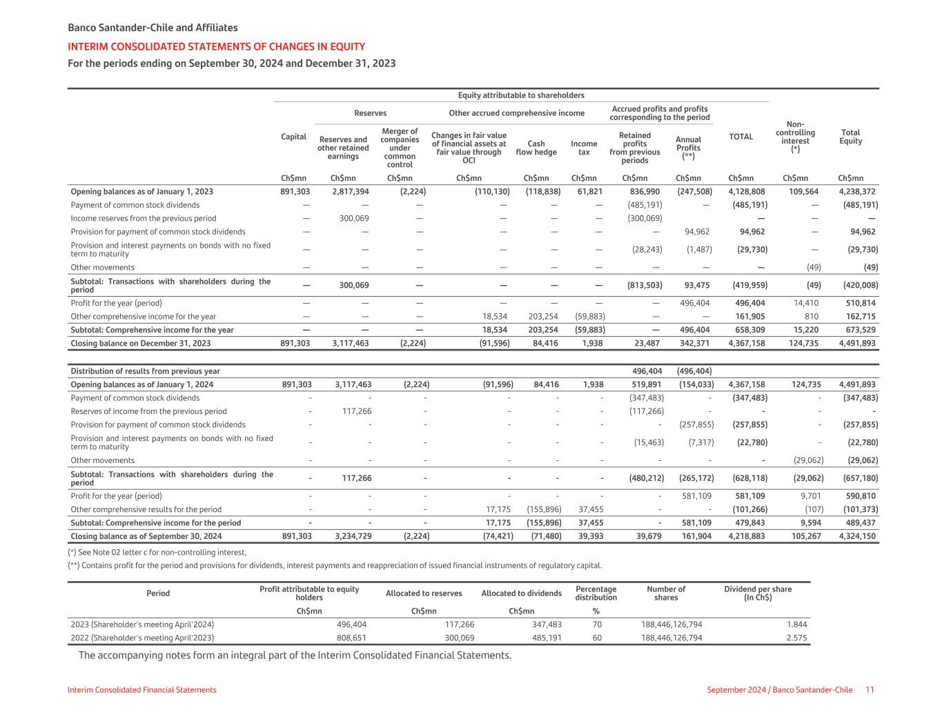 Equity attributable to shareholders Capital Reserves Other accrued comprehensive income Accrued profits and profits corresponding to the period TOTAL Non- controlling interest (*) Total EquityReserves and other retained earnings Merger of companies under common control Changes in fair value of financial assets at fair value through OCI Cash flow hedge Income tax Retained profits from previous periods Annual Profits (**) Ch$mn Ch$mn Ch$mn Ch$mn Ch$mn Ch$mn Ch$mn Ch$mn Ch$mn Ch$mn Ch$mn Opening balances as of January 1, 2023 891,303 2,817,394 (2,224) (110,130) (118,838) 61,821 836,990 (247,508) 4,128,808 109,564 4,238,372 Payment of common stock dividends — — — — — — (485,191) — (485,191) — (485,191) Income reserves from the previous period — 300,069 — — — — (300,069) — — — Provision for payment of common stock dividends — — — — — — — 94,962 94,962 — 94,962 Provision and interest payments on bonds with no fixed term to maturity — — — — — — (28,243) (1,487) (29,730) — (29,730) Other movements — — — — — — — — — (49) (49) Subtotal: Transactions with shareholders during the period — 300,069 — — — — (813,503) 93,475 (419,959) (49) (420,008) Profit for the year (period) — — — — — — — 496,404 496,404 14,410 510,814 Other comprehensive income for the year — — — 18,534 203,254 (59,883) — — 161,905 810 162,715 Subtotal: Comprehensive income for the year — — — 18,534 203,254 (59,883) — 496,404 658,309 15,220 673,529 Closing balance on December 31, 2023 891,303 3,117,463 (2,224) (91,596) 84,416 1,938 23,487 342,371 4,367,158 124,735 4,491,893 Distribution of results from previous year 496,404 (496,404) Opening balances as of January 1, 2024 891,303 3,117,463 (2,224) (91,596) 84,416 1,938 519,891 (154,033) 4,367,158 124,735 4,491,893 Payment of common stock dividends - - - - - - (347,483) - (347,483) - (347,483) Reserves of income from the previous period - 117,266 - - - - (117,266) - - - - Provision for payment of common stock dividends - - - - - - - (257,855) (257,855) - (257,855) Provision and interest payments on bonds with no fixed term to maturity - - - - - - (15,463) (7,317) (22,780) - (22,780) Other movements - - - - - - - - - (29,062) (29,062) Subtotal: Transactions with shareholders during the period - 117,266 - - - - (480,212) (265,172) (628,118) (29,062) (657,180) Profit for the year (period) - - - - - - - 581,109 581,109 9,701 590,810 Other comprehensive results for the period - - - 17,175 (155,896) 37,455 - - (101,266) (107) (101,373) Subtotal: Comprehensive income for the period - - - 17,175 (155,896) 37,455 - 581,109 479,843 9,594 489,437 Closing balance as of September 30, 2024 891,303 3,234,729 (2,224) (74,421) (71,480) 39,393 39,679 161,904 4,218,883 105,267 4,324,150 (*) See Note 02 letter c for non-controlling interest, (**) Contains profit for the period and provisions for dividends, interest payments and reappreciation of issued financial instruments of regulatory capital. Period Profit attributable to equity holders Allocated to reserves Allocated to dividends Percentage distribution Number of shares Dividend per share (In Ch$) Ch$mn Ch$mn Ch$mn % 2023 (Shareholder's meeting April'2024) 496,404 117,266 347,483 70 188,446,126,794 1.844 2022 (Shareholder's meeting April'2023) 808,651 300,069 485,191 60 188,446,126,794 2.575 The accompanying notes form an integral part of the Interim Consolidated Financial Statements. Banco Santander-Chile and Affiliates INTERIM CONSOLIDATED STATEMENTS OF CHANGES IN EQUITY For the periods ending on September 30, 2024 and December 31, 2023 Interim Consolidated Financial Statements September 2024 / Banco Santander-Chile 11