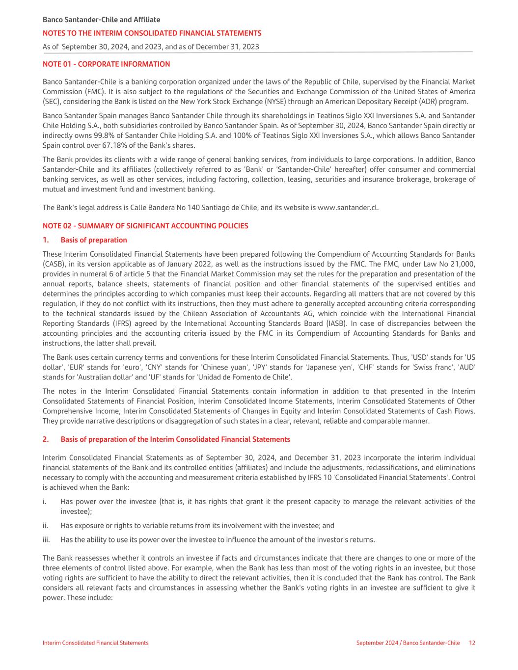 NOTE 01 - CORPORATE INFORMATION Banco Santander-Chile is a banking corporation organized under the laws of the Republic of Chile, supervised by the Financial Market Commission (FMC). It is also subject to the regulations of the Securities and Exchange Commission of the United States of America (SEC), considering the Bank is listed on the New York Stock Exchange (NYSE) through an American Depositary Receipt (ADR) program. Banco Santander Spain manages Banco Santander Chile through its shareholdings in Teatinos Siglo XXI Inversiones S.A. and Santander Chile Holding S.A., both subsidiaries controlled by Banco Santander Spain. As of September 30, 2024, Banco Santander Spain directly or indirectly owns 99.8% of Santander Chile Holding S.A. and 100% of Teatinos Siglo XXI Inversiones S.A., which allows Banco Santander Spain control over 67.18% of the Bank's shares. The Bank provides its clients with a wide range of general banking services, from individuals to large corporations. In addition, Banco Santander-Chile and its affiliates (collectively referred to as 'Bank' or 'Santander-Chile' hereafter) offer consumer and commercial banking services, as well as other services, including factoring, collection, leasing, securities and insurance brokerage, brokerage of mutual and investment fund and investment banking. The Bank's legal address is Calle Bandera No 140 Santiago de Chile, and its website is www.santander.cl. NOTE 02 - SUMMARY OF SIGNIFICANT ACCOUNTING POLICIES 1. Basis of preparation These Interim Consolidated Financial Statements have been prepared following the Compendium of Accounting Standards for Banks (CASB), in its version applicable as of January 2022, as well as the instructions issued by the FMC. The FMC, under Law No 21,000, provides in numeral 6 of article 5 that the Financial Market Commission may set the rules for the preparation and presentation of the annual reports, balance sheets, statements of financial position and other financial statements of the supervised entities and determines the principles according to which companies must keep their accounts. Regarding all matters that are not covered by this regulation, if they do not conflict with its instructions, then they must adhere to generally accepted accounting criteria corresponding to the technical standards issued by the Chilean Association of Accountants AG, which coincide with the International Financial Reporting Standards (IFRS) agreed by the International Accounting Standards Board (IASB). In case of discrepancies between the accounting principles and the accounting criteria issued by the FMC in its Compendium of Accounting Standards for Banks and instructions, the latter shall prevail. The Bank uses certain currency terms and conventions for these Interim Consolidated Financial Statements. Thus, 'USD' stands for 'US dollar', 'EUR' stands for 'euro', 'CNY' stands for 'Chinese yuan', 'JPY' stands for 'Japanese yen', 'CHF' stands for 'Swiss franc', 'AUD' stands for 'Australian dollar' and 'UF' stands for 'Unidad de Fomento de Chile'. The notes in the Interim Consolidated Financial Statements contain information in addition to that presented in the Interim Consolidated Statements of Financial Position, Interim Consolidated Income Statements, Interim Consolidated Statements of Other Comprehensive Income, Interim Consolidated Statements of Changes in Equity and Interim Consolidated Statements of Cash Flows. They provide narrative descriptions or disaggregation of such states in a clear, relevant, reliable and comparable manner. 2. Basis of preparation of the Interim Consolidated Financial Statements Interim Consolidated Financial Statements as of September 30, 2024, and December 31, 2023 incorporate the interim individual financial statements of the Bank and its controlled entities (affiliates) and include the adjustments, reclassifications, and eliminations necessary to comply with the accounting and measurement criteria established by IFRS 10 'Consolidated Financial Statements'. Control is achieved when the Bank: i. Has power over the investee (that is, it has rights that grant it the present capacity to manage the relevant activities of the investee); ii. Has exposure or rights to variable returns from its involvement with the investee; and iii. Has the ability to use its power over the investee to influence the amount of the investor's returns. The Bank reassesses whether it controls an investee if facts and circumstances indicate that there are changes to one or more of the three elements of control listed above. For example, when the Bank has less than most of the voting rights in an investee, but those voting rights are sufficient to have the ability to direct the relevant activities, then it is concluded that the Bank has control. The Bank considers all relevant facts and circumstances in assessing whether the Bank's voting rights in an investee are sufficient to give it power. These include: Banco Santander-Chile and Affiliate NOTES TO THE INTERIM CONSOLIDATED FINANCIAL STATEMENTS As of September 30, 2024, and 2023, and as of December 31, 2023 Interim Consolidated Financial Statements September 2024 / Banco Santander-Chile 12