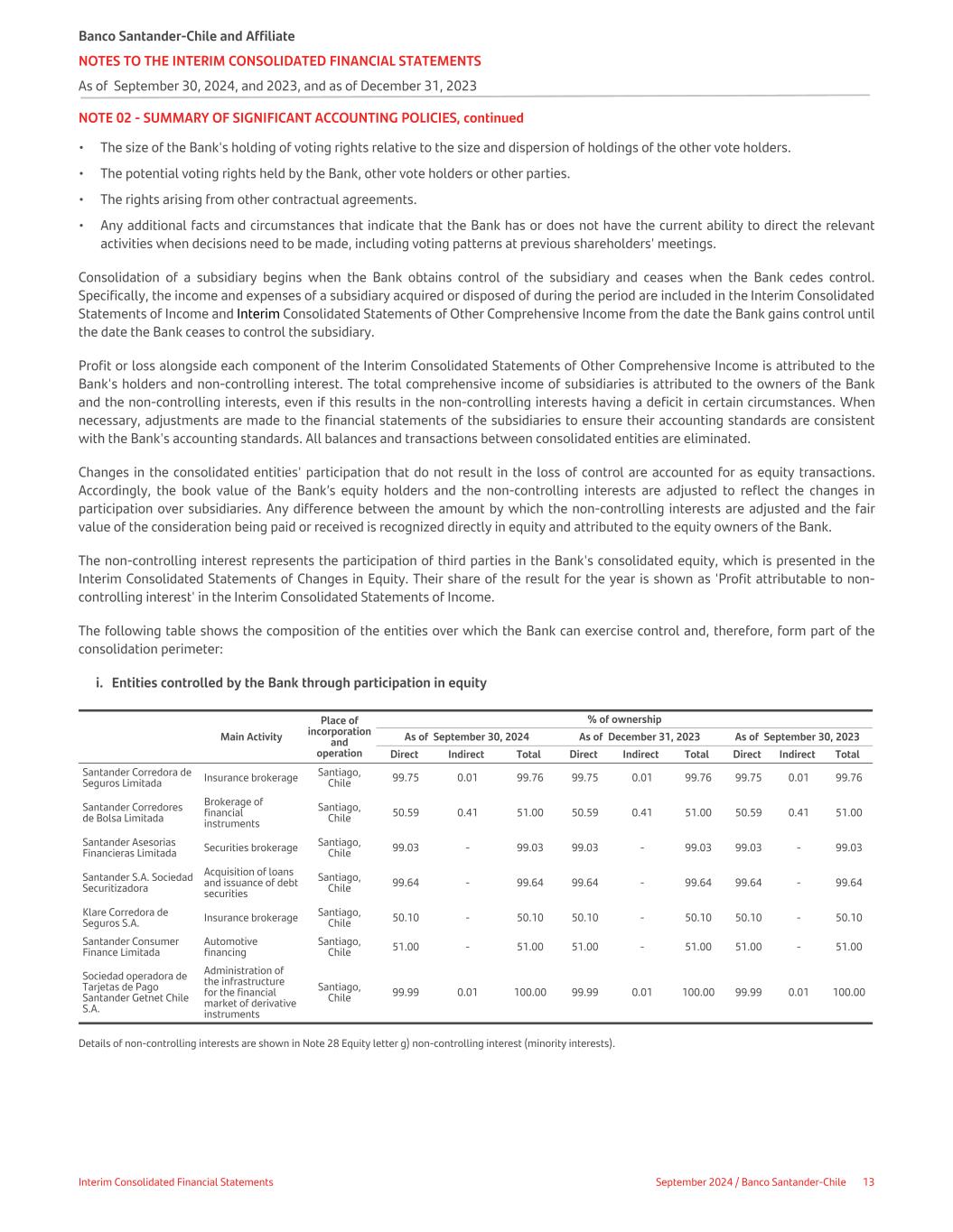NOTE 02 - SUMMARY OF SIGNIFICANT ACCOUNTING POLICIES, continued • The size of the Bank's holding of voting rights relative to the size and dispersion of holdings of the other vote holders. • The potential voting rights held by the Bank, other vote holders or other parties. • The rights arising from other contractual agreements. • Any additional facts and circumstances that indicate that the Bank has or does not have the current ability to direct the relevant activities when decisions need to be made, including voting patterns at previous shareholders' meetings. Consolidation of a subsidiary begins when the Bank obtains control of the subsidiary and ceases when the Bank cedes control. Specifically, the income and expenses of a subsidiary acquired or disposed of during the period are included in the Interim Consolidated Statements of Income and Interim Consolidated Statements of Other Comprehensive Income from the date the Bank gains control until the date the Bank ceases to control the subsidiary. Profit or loss alongside each component of the Interim Consolidated Statements of Other Comprehensive Income is attributed to the Bank's holders and non-controlling interest. The total comprehensive income of subsidiaries is attributed to the owners of the Bank and the non-controlling interests, even if this results in the non-controlling interests having a deficit in certain circumstances. When necessary, adjustments are made to the financial statements of the subsidiaries to ensure their accounting standards are consistent with the Bank's accounting standards. All balances and transactions between consolidated entities are eliminated. Changes in the consolidated entities' participation that do not result in the loss of control are accounted for as equity transactions. Accordingly, the book value of the Bank’s equity holders and the non-controlling interests are adjusted to reflect the changes in participation over subsidiaries. Any difference between the amount by which the non-controlling interests are adjusted and the fair value of the consideration being paid or received is recognized directly in equity and attributed to the equity owners of the Bank. The non-controlling interest represents the participation of third parties in the Bank's consolidated equity, which is presented in the Interim Consolidated Statements of Changes in Equity. Their share of the result for the year is shown as 'Profit attributable to non- controlling interest' in the Interim Consolidated Statements of Income. The following table shows the composition of the entities over which the Bank can exercise control and, therefore, form part of the consolidation perimeter: i. Entities controlled by the Bank through participation in equity Place of incorporation and operation % of ownership Main Activity As of September 30, 2024 As of December 31, 2023 As of September 30, 2023 Direct Indirect Total Direct Indirect Total Direct Indirect Total Santander Corredora de Seguros Limitada Insurance brokerage Santiago, Chile 99.75 0.01 99.76 99.75 0.01 99.76 99.75 0.01 99.76 Santander Corredores de Bolsa Limitada Brokerage of financial instruments Santiago, Chile 50.59 0.41 51.00 50.59 0.41 51.00 50.59 0.41 51.00 Santander Asesorias Financieras Limitada Securities brokerage Santiago, Chile 99.03 - 99.03 99.03 - 99.03 99.03 - 99.03 Santander S.A. Sociedad Securitizadora Acquisition of loans and issuance of debt securities Santiago, Chile 99.64 - 99.64 99.64 - 99.64 99.64 - 99.64 Klare Corredora de Seguros S.A. Insurance brokerage Santiago, Chile 50.10 - 50.10 50.10 - 50.10 50.10 - 50.10 Santander Consumer Finance Limitada Automotive financing Santiago, Chile 51.00 - 51.00 51.00 - 51.00 51.00 - 51.00 Sociedad operadora de Tarjetas de Pago Santander Getnet Chile S.A. Administration of the infrastructure for the financial market of derivative instruments Santiago, Chile 99.99 0.01 100.00 99.99 0.01 100.00 99.99 0.01 100.00 Details of non-controlling interests are shown in Note 28 Equity letter g) non-controlling interest (minority interests). Banco Santander-Chile and Affiliate NOTES TO THE INTERIM CONSOLIDATED FINANCIAL STATEMENTS As of September 30, 2024, and 2023, and as of December 31, 2023 Interim Consolidated Financial Statements September 2024 / Banco Santander-Chile 13