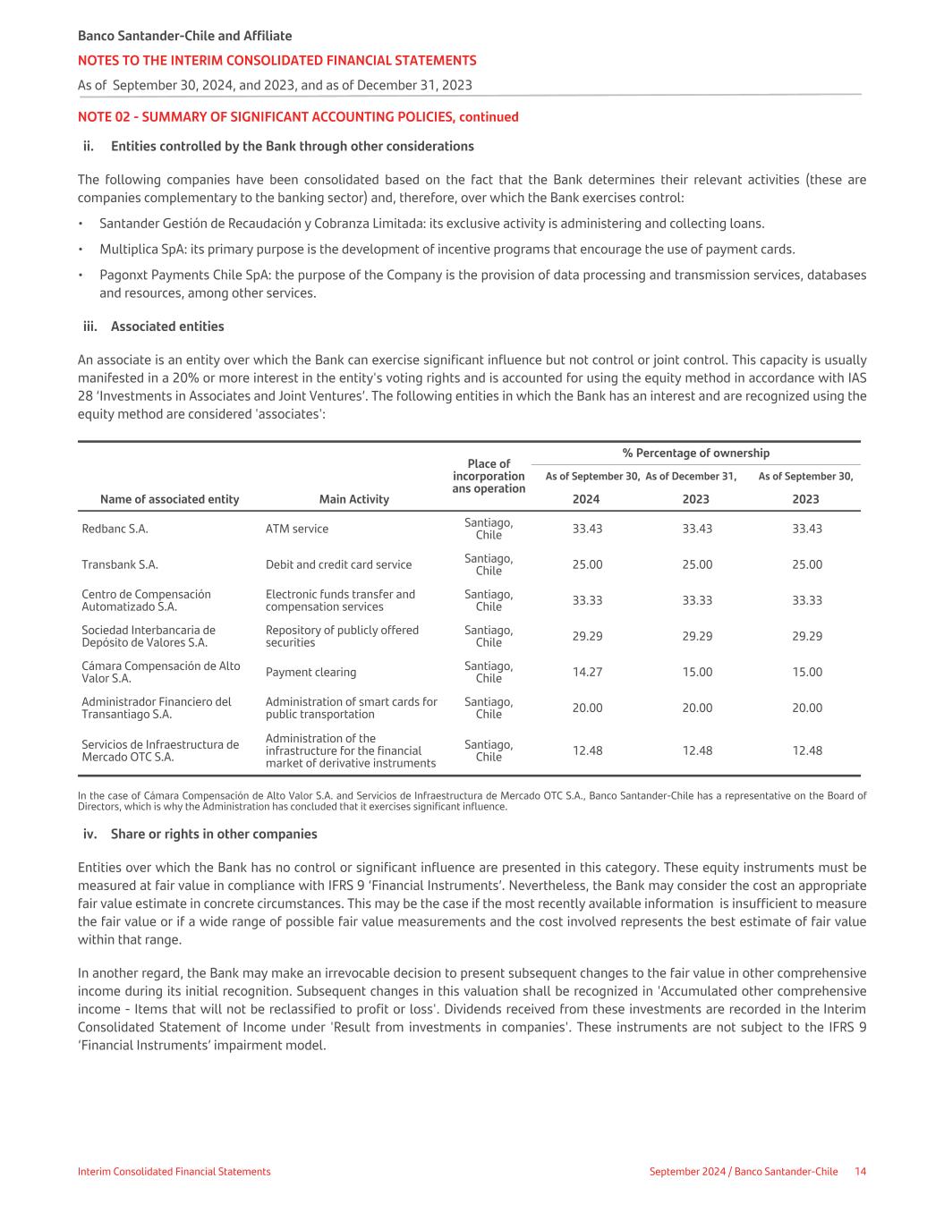 NOTE 02 - SUMMARY OF SIGNIFICANT ACCOUNTING POLICIES, continued ii. Entities controlled by the Bank through other considerations The following companies have been consolidated based on the fact that the Bank determines their relevant activities (these are companies complementary to the banking sector) and, therefore, over which the Bank exercises control: • Santander Gestión de Recaudación y Cobranza Limitada: its exclusive activity is administering and collecting loans. • Multiplica SpA: its primary purpose is the development of incentive programs that encourage the use of payment cards. • Pagonxt Payments Chile SpA: the purpose of the Company is the provision of data processing and transmission services, databases and resources, among other services. iii. Associated entities An associate is an entity over which the Bank can exercise significant influence but not control or joint control. This capacity is usually manifested in a 20% or more interest in the entity's voting rights and is accounted for using the equity method in accordance with IAS 28 ‘Investments in Associates and Joint Ventures’. The following entities in which the Bank has an interest and are recognized using the equity method are considered 'associates':     Place of incorporation ans operation % Percentage of ownership As of September 30, As of December 31, As of September 30, Name of associated entity Main Activity 2024 2023 2023 Redbanc S.A. ATM service Santiago, Chile 33.43 33.43 33.43 Transbank S.A. Debit and credit card service Santiago, Chile 25.00 25.00 25.00 Centro de Compensación Automatizado S.A. Electronic funds transfer and compensation services Santiago, Chile 33.33 33.33 33.33 Sociedad Interbancaria de Depósito de Valores S.A. Repository of publicly offered securities Santiago, Chile 29.29 29.29 29.29 Cámara Compensación de Alto Valor S.A. Payment clearing Santiago, Chile 14.27 15.00 15.00 Administrador Financiero del Transantiago S.A. Administration of smart cards for public transportation Santiago, Chile 20.00 20.00 20.00 Servicios de Infraestructura de Mercado OTC S.A. Administration of the infrastructure for the financial market of derivative instruments Santiago, Chile 12.48 12.48 12.48 In the case of Cámara Compensación de Alto Valor S.A. and Servicios de Infraestructura de Mercado OTC S.A., Banco Santander-Chile has a representative on the Board of Directors, which is why the Administration has concluded that it exercises significant influence. iv. Share or rights in other companies Entities over which the Bank has no control or significant influence are presented in this category. These equity instruments must be measured at fair value in compliance with IFRS 9 ‘Financial Instruments’. Nevertheless, the Bank may consider the cost an appropriate fair value estimate in concrete circumstances. This may be the case if the most recently available information is insufficient to measure the fair value or if a wide range of possible fair value measurements and the cost involved represents the best estimate of fair value within that range. In another regard, the Bank may make an irrevocable decision to present subsequent changes to the fair value in other comprehensive income during its initial recognition. Subsequent changes in this valuation shall be recognized in 'Accumulated other comprehensive income - Items that will not be reclassified to profit or loss'. Dividends received from these investments are recorded in the Interim Consolidated Statement of Income under 'Result from investments in companies'. These instruments are not subject to the IFRS 9 ‘Financial Instruments’ impairment model. Banco Santander-Chile and Affiliate NOTES TO THE INTERIM CONSOLIDATED FINANCIAL STATEMENTS As of September 30, 2024, and 2023, and as of December 31, 2023 Interim Consolidated Financial Statements September 2024 / Banco Santander-Chile 14