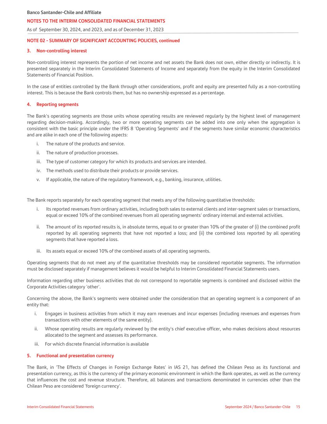 NOTE 02 - SUMMARY OF SIGNIFICANT ACCOUNTING POLICIES, continued 3. Non-controlling interest Non-controlling interest represents the portion of net income and net assets the Bank does not own, either directly or indirectly. It is presented separately in the Interim Consolidated Statements of Income and separately from the equity in the Interim Consolidated Statements of Financial Position. In the case of entities controlled by the Bank through other considerations, profit and equity are presented fully as a non-controlling interest. This is because the Bank controls them, but has no ownership expressed as a percentage. 4. Reporting segments The Bank's operating segments are those units whose operating results are reviewed regularly by the highest level of management regarding decision-making. Accordingly, two or more operating segments can be added into one only when the aggregation is consistent with the basic principle under the IFRS 8 'Operating Segments' and if the segments have similar economic characteristics and are alike in each one of the following aspects: i. The nature of the products and service. ii. The nature of production processes. iii. The type of customer category for which its products and services are intended. iv. The methods used to distribute their products or provide services. v. If applicable, the nature of the regulatory framework, e.g., banking, insurance, utilities. The Bank reports separately for each operating segment that meets any of the following quantitative thresholds: i. Its reported revenues from ordinary activities, including both sales to external clients and inter-segment sales or transactions, equal or exceed 10% of the combined revenues from all operating segments' ordinary internal and external activities. ii. The amount of its reported results is, in absolute terms, equal to or greater than 10% of the greater of (i) the combined profit reported by all operating segments that have not reported a loss; and (ii) the combined loss reported by all operating segments that have reported a loss. iii. Its assets equal or exceed 10% of the combined assets of all operating segments. Operating segments that do not meet any of the quantitative thresholds may be considered reportable segments. The information must be disclosed separately if management believes it would be helpful to Interim Consolidated Financial Statements users. Information regarding other business activities that do not correspond to reportable segments is combined and disclosed within the Corporate Activities category 'other'. Concerning the above, the Bank's segments were obtained under the consideration that an operating segment is a component of an entity that: i. Engages in business activities from which it may earn revenues and incur expenses (including revenues and expenses from transactions with other elements of the same entity). ii. Whose operating results are regularly reviewed by the entity's chief executive officer, who makes decisions about resources allocated to the segment and assesses its performance. iii. For which discrete financial information is available 5. Functional and presentation currency The Bank, in 'The Effects of Changes in Foreign Exchange Rates' in IAS 21, has defined the Chilean Peso as its functional and presentation currency, as this is the currency of the primary economic environment in which the Bank operates, as well as the currency that influences the cost and revenue structure. Therefore, all balances and transactions denominated in currencies other than the Chilean Peso are considered 'foreign currency'. Banco Santander-Chile and Affiliate NOTES TO THE INTERIM CONSOLIDATED FINANCIAL STATEMENTS As of September 30, 2024, and 2023, and as of December 31, 2023 Interim Consolidated Financial Statements September 2024 / Banco Santander-Chile 15