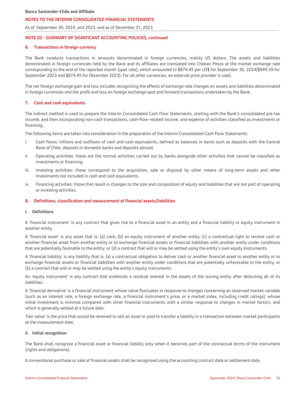 NOTE 02 - SUMMARY OF SIGNIFICANT ACCOUNTING POLICIES, continued 6. Transactions in foreign currency The Bank conducts transactions in amounts denominated in foreign currencies, mainly US dollars. The assets and liabilities denominated in foreign currencies held by the Bank and its affiliates are translated into Chilean Pesos at the market exchange rate corresponding to the end of the reported month (spot rate), which amounted to $874.45 per US$ for September 30, 2024($849.59 for September 2023 and $874,45 for December 2023). For all other currencies, an external price provider is used. The net foreign exchange gain and loss includes recognizing the effects of exchange rate changes on assets and liabilities denominated in foreign currencies and the profit and loss on foreign exchange spot and forward transactions undertaken by the Bank. 7. Cash and cash equivalents The indirect method is used to prepare the Interim Consolidated Cash Flow Statements, starting with the Bank's consolidated pre-tax income, and then incorporating non-cash transactions, cash-flow-related income, and expense of activities classified as investments or financing. The following items are taken into consideration in the preparation of the Interim Consolidated Cash Flow Statements: i. Cash flows: inflows and outflows of cash and cash equivalents, defined as balances in items such as deposits with the Central Bank of Chile, deposits in domestic banks and deposits abroad. ii. Operating activities: these are the normal activities carried out by banks alongside other activities that cannot be classified as investments or financing. iii. Investing activities: these correspond to the acquisition, sale or disposal by other means of long-term assets and other investments not included in cash and cash equivalents. iv. Financing activities: those that result in changes to the size and composition of equity and liabilities that are not part of operating or investing activities. 8. Definitions, classification and measurement of financial assets/liabilities i. Definitions A 'financial instrument' is any contract that gives rise to a financial asset in an entity and a financial liability or equity instrument in another entity. A 'financial asset' is any asset that is: (a) cash; (b) an equity instrument of another entity; (c) a contractual right to receive cash or another financial asset from another entity or to exchange financial assets or financial liabilities with another entity under conditions that are potentially favorable to the entity; or (d) a contract that will or may be settled using the entity's own equity instruments. A 'financial liability' is any liability that is: (a) a contractual obligation to deliver cash or another financial asset to another entity or to exchange financial assets or financial liabilities with another entity under conditions that are potentially unfavorable to the entity; or (b) a contract that will or may be settled using the entity's equity instruments. An 'equity instrument' is any contract that evidences a residual interest in the assets of the issuing entity after deducting all of its liabilities. A 'financial derivative' is a financial instrument whose value fluctuates in response to changes concerning an observed market variable (such as an interest rate, a foreign exchange rate, a financial instrument's price, or a market index, including credit ratings), whose initial investment is minimal compared with other financial instruments with a similar response to changes in market factors, and which is generally settled at a future date. 'Fair value' is the price that would be received to sell an asset or paid to transfer a liability in a transaction between market participants at the measurement date. ii. Initial recognition The Bank shall recognize a financial asset or financial liability only when it becomes part of the contractual terms of the instrument (rights and obligations). A conventional purchase or sale of financial assets shall be recognized using the accounting contract date or settlement date. Banco Santander-Chile and Affiliate NOTES TO THE INTERIM CONSOLIDATED FINANCIAL STATEMENTS As of September 30, 2024, and 2023, and as of December 31, 2023 Interim Consolidated Financial Statements September 2024 / Banco Santander-Chile 16