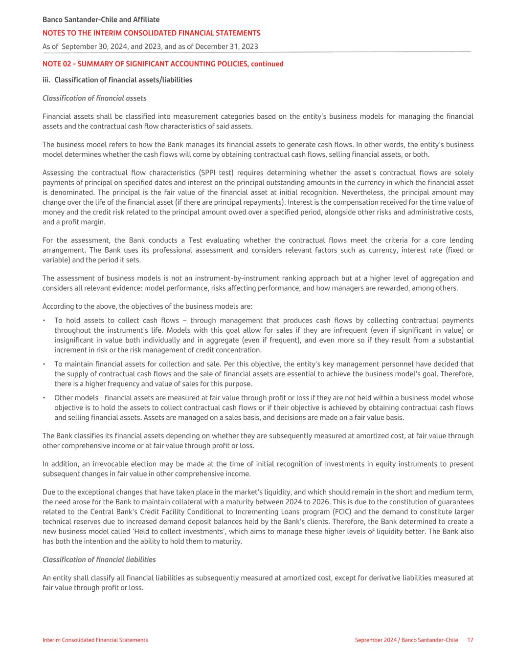 NOTE 02 - SUMMARY OF SIGNIFICANT ACCOUNTING POLICIES, continued iii. Classification of financial assets/liabilities Classification of financial assets Financial assets shall be classified into measurement categories based on the entity's business models for managing the financial assets and the contractual cash flow characteristics of said assets. The business model refers to how the Bank manages its financial assets to generate cash flows. In other words, the entity's business model determines whether the cash flows will come by obtaining contractual cash flows, selling financial assets, or both. Assessing the contractual flow characteristics (SPPI test) requires determining whether the asset's contractual flows are solely payments of principal on specified dates and interest on the principal outstanding amounts in the currency in which the financial asset is denominated. The principal is the fair value of the financial asset at initial recognition. Nevertheless, the principal amount may change over the life of the financial asset (if there are principal repayments). Interest is the compensation received for the time value of money and the credit risk related to the principal amount owed over a specified period, alongside other risks and administrative costs, and a profit margin. For the assessment, the Bank conducts a Test evaluating whether the contractual flows meet the criteria for a core lending arrangement. The Bank uses its professional assessment and considers relevant factors such as currency, interest rate (fixed or variable) and the period it sets. The assessment of business models is not an instrument-by-instrument ranking approach but at a higher level of aggregation and considers all relevant evidence: model performance, risks affecting performance, and how managers are rewarded, among others. According to the above, the objectives of the business models are: • To hold assets to collect cash flows – through management that produces cash flows by collecting contractual payments throughout the instrument's life. Models with this goal allow for sales if they are infrequent (even if significant in value) or insignificant in value both individually and in aggregate (even if frequent), and even more so if they result from a substantial increment in risk or the risk management of credit concentration. • To maintain financial assets for collection and sale. Per this objective, the entity's key management personnel have decided that the supply of contractual cash flows and the sale of financial assets are essential to achieve the business model's goal. Therefore, there is a higher frequency and value of sales for this purpose. • Other models - financial assets are measured at fair value through profit or loss if they are not held within a business model whose objective is to hold the assets to collect contractual cash flows or if their objective is achieved by obtaining contractual cash flows and selling financial assets. Assets are managed on a sales basis, and decisions are made on a fair value basis. The Bank classifies its financial assets depending on whether they are subsequently measured at amortized cost, at fair value through other comprehensive income or at fair value through profit or loss. In addition, an irrevocable election may be made at the time of initial recognition of investments in equity instruments to present subsequent changes in fair value in other comprehensive income. Due to the exceptional changes that have taken place in the market's liquidity, and which should remain in the short and medium term, the need arose for the Bank to maintain collateral with a maturity between 2024 to 2026. This is due to the constitution of guarantees related to the Central Bank's Credit Facility Conditional to Incrementing Loans program (FCIC) and the demand to constitute larger technical reserves due to increased demand deposit balances held by the Bank's clients. Therefore, the Bank determined to create a new business model called 'Held to collect investments', which aims to manage these higher levels of liquidity better. The Bank also has both the intention and the ability to hold them to maturity. Classification of financial liabilities An entity shall classify all financial liabilities as subsequently measured at amortized cost, except for derivative liabilities measured at fair value through profit or loss. Banco Santander-Chile and Affiliate NOTES TO THE INTERIM CONSOLIDATED FINANCIAL STATEMENTS As of September 30, 2024, and 2023, and as of December 31, 2023 Interim Consolidated Financial Statements September 2024 / Banco Santander-Chile 17