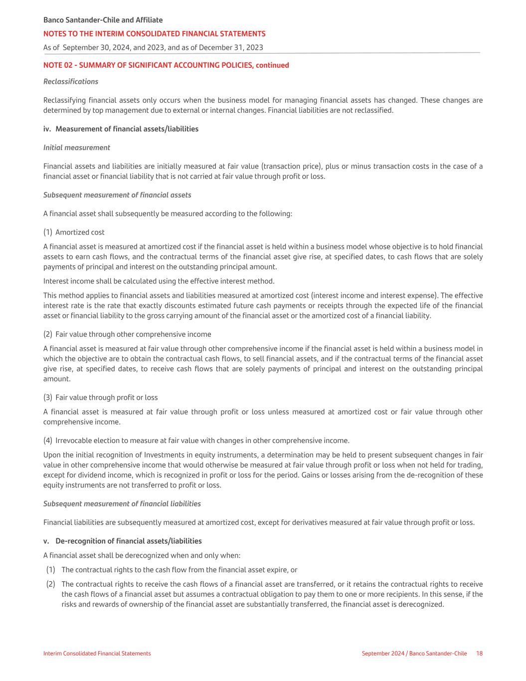 NOTE 02 - SUMMARY OF SIGNIFICANT ACCOUNTING POLICIES, continued Reclassifications Reclassifying financial assets only occurs when the business model for managing financial assets has changed. These changes are determined by top management due to external or internal changes. Financial liabilities are not reclassified. iv. Measurement of financial assets/liabilities Initial measurement Financial assets and liabilities are initially measured at fair value (transaction price), plus or minus transaction costs in the case of a financial asset or financial liability that is not carried at fair value through profit or loss. Subsequent measurement of financial assets A financial asset shall subsequently be measured according to the following: (1) Amortized cost A financial asset is measured at amortized cost if the financial asset is held within a business model whose objective is to hold financial assets to earn cash flows, and the contractual terms of the financial asset give rise, at specified dates, to cash flows that are solely payments of principal and interest on the outstanding principal amount. Interest income shall be calculated using the effective interest method. This method applies to financial assets and liabilities measured at amortized cost (interest income and interest expense). The effective interest rate is the rate that exactly discounts estimated future cash payments or receipts through the expected life of the financial asset or financial liability to the gross carrying amount of the financial asset or the amortized cost of a financial liability. (2) Fair value through other comprehensive income A financial asset is measured at fair value through other comprehensive income if the financial asset is held within a business model in which the objective are to obtain the contractual cash flows, to sell financial assets, and if the contractual terms of the financial asset give rise, at specified dates, to receive cash flows that are solely payments of principal and interest on the outstanding principal amount. (3) Fair value through profit or loss A financial asset is measured at fair value through profit or loss unless measured at amortized cost or fair value through other comprehensive income. (4) Irrevocable election to measure at fair value with changes in other comprehensive income. Upon the initial recognition of Investments in equity instruments, a determination may be held to present subsequent changes in fair value in other comprehensive income that would otherwise be measured at fair value through profit or loss when not held for trading, except for dividend income, which is recognized in profit or loss for the period. Gains or losses arising from the de-recognition of these equity instruments are not transferred to profit or loss. Subsequent measurement of financial liabilities Financial liabilities are subsequently measured at amortized cost, except for derivatives measured at fair value through profit or loss. v. De-recognition of financial assets/liabilities A financial asset shall be derecognized when and only when: (1) The contractual rights to the cash flow from the financial asset expire, or (2) The contractual rights to receive the cash flows of a financial asset are transferred, or it retains the contractual rights to receive the cash flows of a financial asset but assumes a contractual obligation to pay them to one or more recipients. In this sense, if the risks and rewards of ownership of the financial asset are substantially transferred, the financial asset is derecognized. Banco Santander-Chile and Affiliate NOTES TO THE INTERIM CONSOLIDATED FINANCIAL STATEMENTS As of September 30, 2024, and 2023, and as of December 31, 2023 Interim Consolidated Financial Statements September 2024 / Banco Santander-Chile 18