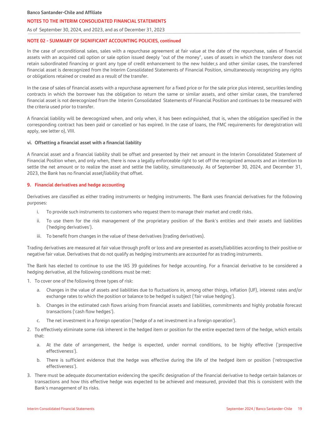 NOTE 02 - SUMMARY OF SIGNIFICANT ACCOUNTING POLICIES, continued In the case of unconditional sales, sales with a repurchase agreement at fair value at the date of the repurchase, sales of financial assets with an acquired call option or sale option issued deeply "out of the money", uses of assets in which the transferor does not retain subordinated financing or grant any type of credit enhancement to the new holder,s and other similar cases, the transferred financial asset is derecognized from the Interim Consolidated Statements of Financial Position, simultaneously recognizing any rights or obligations retained or created as a result of the transfer. In the case of sales of financial assets with a repurchase agreement for a fixed price or for the sale price plus interest, securities lending contracts in which the borrower has the obligation to return the same or similar assets, and other similar cases, the transferred financial asset is not derecognized from the Interim Consolidated Statements of Financial Position and continues to be measured with the criteria used prior to transfer. A financial liability will be derecognized when, and only when, it has been extinguished, that is, when the obligation specified in the corresponding contract has been paid or cancelled or has expired. In the case of loans, the FMC requirements for deregistration will apply, see letter o), VIII. vi. Offsetting a financial asset with a financial liability A financial asset and a financial liability shall be offset and presented by their net amount in the Interim Consolidated Statement of Financial Position when, and only when, there is now a legally enforceable right to set off the recognized amounts and an intention to settle the net amount or to realize the asset and settle the liability, simultaneously. As of September 30, 2024, and December 31, 2023, the Bank has no financial asset/liability that offset. 9. Financial derivatives and hedge accounting Derivatives are classified as either trading instruments or hedging instruments. The Bank uses financial derivatives for the following purposes: i. To provide such instruments to customers who request them to manage their market and credit risks. ii. To use them for the risk management of the proprietary position of the Bank's entities and their assets and liabilities ('hedging derivatives'). iii. To benefit from changes in the value of these derivatives (trading derivatives). Trading derivatives are measured at fair value through profit or loss and are presented as assets/liabilities according to their positive or negative fair value. Derivatives that do not qualify as hedging instruments are accounted for as trading instruments. The Bank has elected to continue to use the IAS 39 guidelines for hedge accounting. For a financial derivative to be considered a hedging derivative, all the following conditions must be met: 1. To cover one of the following three types of risk: a. Changes in the value of assets and liabilities due to fluctuations in, among other things, inflation (UF), interest rates and/or exchange rates to which the position or balance to be hedged is subject ('fair value hedging'). b. Changes in the estimated cash flows arising from financial assets and liabilities, commitments and highly probable forecast transactions ('cash flow hedges'). c. The net investment in a foreign operation ('hedge of a net investment in a foreign operation'). 2. To effectively eliminate some risk inherent in the hedged item or position for the entire expected term of the hedge, which entails that: a. At the date of arrangement, the hedge is expected, under normal conditions, to be highly effective ('prospective effectiveness'). b. There is sufficient evidence that the hedge was effective during the life of the hedged item or position ('retrospective effectiveness'). 3. There must be adequate documentation evidencing the specific designation of the financial derivative to hedge certain balances or transactions and how this effective hedge was expected to be achieved and measured, provided that this is consistent with the Bank's management of its risks. Banco Santander-Chile and Affiliate NOTES TO THE INTERIM CONSOLIDATED FINANCIAL STATEMENTS As of September 30, 2024, and 2023, and as of December 31, 2023 Interim Consolidated Financial Statements September 2024 / Banco Santander-Chile 19