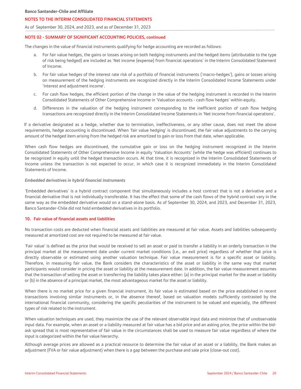 NOTE 02 - SUMMARY OF SIGNIFICANT ACCOUNTING POLICIES, continued The changes in the value of financial instruments qualifying for hedge accounting are recorded as follows: a. For fair value hedges, the gains or losses arising on both hedging instruments and the hedged items (attributable to the type of risk being hedged) are included as 'Net income (expense) from financial operations' in the Interim Consolidated Statement of Income. b. For fair value hedges of the interest rate risk of a portfolio of financial instruments ('macro-hedges'), gains or losses arising on measurement of the hedging instruments are recognized directly in the Interim Consolidated Income Statements under 'Interest and adjustment income'. c. For cash flow hedges, the efficient portion of the change in the value of the hedging instrument is recorded in the Interim Consolidated Statements of Other Comprehensive Income in 'Valuation accounts - cash flow hedges' within equity. d. Differences in the valuation of the hedging instrument corresponding to the inefficient portion of cash flow hedging transactions are recognized directly in the Interim Consolidated Income Statements in 'Net income from financial operations'. If a derivative designated as a hedge, whether due to termination, ineffectiveness, or any other cause, does not meet the above requirements, hedge accounting is discontinued. When 'fair value hedging' is discontinued, the fair value adjustments to the carrying amount of the hedged item arising from the hedged risk are amortized to gain or loss from that date, when applicable. When cash flow hedges are discontinued, the cumulative gain or loss on the hedging instrument recognized in the Interim Consolidated Statements of Other Comprehensive Income in equity 'Valuation Accounts' (while the hedge was efficient) continues to be recognized in equity until the hedged transaction occurs. At that time, it is recognized in the Interim Consolidated Statements of Income unless the transaction is not expected to occur, in which case it is recognized immediately in the Interim Consolidated Statements of Income. Embedded derivatives in hybrid financial instruments 'Embedded derivatives' is a hybrid contract component that simultaneously includes a host contract that is not a derivative and a financial derivative that is not individually transferable. It has the effect that some of the cash flows of the hybrid contract vary in the same way as the embedded derivative would on a stand-alone basis. As of September 30, 2024, and 2023, and December 31, 2023, Banco Santander-Chile did not hold embedded derivatives in its portfolio. 10. Fair value of financial assets and liabilities No transaction costs are deducted when financial assets and liabilities are measured at fair value. Assets and liabilities subsequently measured at amortized cost are not required to be measured at fair value. 'Fair value' is defined as the price that would be received to sell an asset or paid to transfer a liability in an orderly transaction in the principal market at the measurement date under current market conditions (i.e., an exit price) regardless of whether that price is directly observable or estimated using another valuation technique. Fair value measurement is for a specific asset or liability. Therefore, in measuring fair value, the Bank considers the characteristics of the asset or liability in the same way that market participants would consider in pricing the asset or liability at the measurement date. In addition, the fair value measurement assumes that the transaction of selling the asset or transferring the liability takes place either: (a) in the principal market for the asset or liability or (b) in the absence of a principal market, the most advantageous market for the asset or liability. When there is no market price for a given financial instrument, its fair value is estimated based on the price established in recent transactions involving similar instruments or, in the absence thereof, based on valuation models sufficiently contrasted by the international financial community, considering the specific peculiarities of the instrument to be valued and especially, the different types of risk related to the instrument. When valuation techniques are used, they maximize the use of the relevant observable input data and minimize that of unobservable input data. For example, when an asset or a liability measured at fair value has a bid price and an asking price, the price within the bid- ask spread that is most representative of fair value in the circumstances shall be used to measure fair value regardless of where the input is categorized within the fair value hierarchy. Although average prices are allowed as a practical resource to determine the fair value of an asset or a liability, the Bank makes an adjustment (FVA or fair value adjustment) when there is a gap between the purchase and sale price (close-out cost). Banco Santander-Chile and Affiliate NOTES TO THE INTERIM CONSOLIDATED FINANCIAL STATEMENTS As of September 30, 2024, and 2023, and as of December 31, 2023 Interim Consolidated Financial Statements September 2024 / Banco Santander-Chile 20