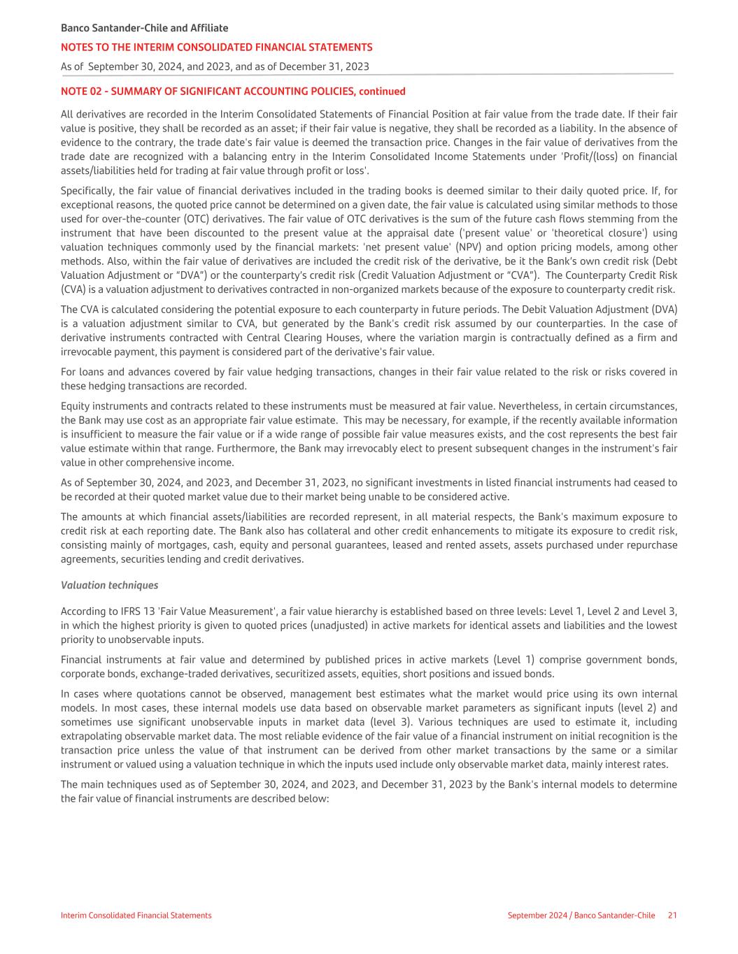 NOTE 02 - SUMMARY OF SIGNIFICANT ACCOUNTING POLICIES, continued All derivatives are recorded in the Interim Consolidated Statements of Financial Position at fair value from the trade date. If their fair value is positive, they shall be recorded as an asset; if their fair value is negative, they shall be recorded as a liability. In the absence of evidence to the contrary, the trade date's fair value is deemed the transaction price. Changes in the fair value of derivatives from the trade date are recognized with a balancing entry in the Interim Consolidated Income Statements under 'Profit/(loss) on financial assets/liabilities held for trading at fair value through profit or loss'. Specifically, the fair value of financial derivatives included in the trading books is deemed similar to their daily quoted price. If, for exceptional reasons, the quoted price cannot be determined on a given date, the fair value is calculated using similar methods to those used for over-the-counter (OTC) derivatives. The fair value of OTC derivatives is the sum of the future cash flows stemming from the instrument that have been discounted to the present value at the appraisal date ('present value' or 'theoretical closure') using valuation techniques commonly used by the financial markets: 'net present value' (NPV) and option pricing models, among other methods. Also, within the fair value of derivatives are included the credit risk of the derivative, be it the Bank’s own credit risk (Debt Valuation Adjustment or “DVA”) or the counterparty’s credit risk (Credit Valuation Adjustment or “CVA”). The Counterparty Credit Risk (CVA) is a valuation adjustment to derivatives contracted in non-organized markets because of the exposure to counterparty credit risk. The CVA is calculated considering the potential exposure to each counterparty in future periods. The Debit Valuation Adjustment (DVA) is a valuation adjustment similar to CVA, but generated by the Bank's credit risk assumed by our counterparties. In the case of derivative instruments contracted with Central Clearing Houses, where the variation margin is contractually defined as a firm and irrevocable payment, this payment is considered part of the derivative's fair value. For loans and advances covered by fair value hedging transactions, changes in their fair value related to the risk or risks covered in these hedging transactions are recorded. Equity instruments and contracts related to these instruments must be measured at fair value. Nevertheless, in certain circumstances, the Bank may use cost as an appropriate fair value estimate. This may be necessary, for example, if the recently available information is insufficient to measure the fair value or if a wide range of possible fair value measures exists, and the cost represents the best fair value estimate within that range. Furthermore, the Bank may irrevocably elect to present subsequent changes in the instrument's fair value in other comprehensive income. As of September 30, 2024, and 2023, and December 31, 2023, no significant investments in listed financial instruments had ceased to be recorded at their quoted market value due to their market being unable to be considered active. The amounts at which financial assets/liabilities are recorded represent, in all material respects, the Bank's maximum exposure to credit risk at each reporting date. The Bank also has collateral and other credit enhancements to mitigate its exposure to credit risk, consisting mainly of mortgages, cash, equity and personal guarantees, leased and rented assets, assets purchased under repurchase agreements, securities lending and credit derivatives. Valuation techniques According to IFRS 13 'Fair Value Measurement', a fair value hierarchy is established based on three levels: Level 1, Level 2 and Level 3, in which the highest priority is given to quoted prices (unadjusted) in active markets for identical assets and liabilities and the lowest priority to unobservable inputs. Financial instruments at fair value and determined by published prices in active markets (Level 1) comprise government bonds, corporate bonds, exchange-traded derivatives, securitized assets, equities, short positions and issued bonds. In cases where quotations cannot be observed, management best estimates what the market would price using its own internal models. In most cases, these internal models use data based on observable market parameters as significant inputs (level 2) and sometimes use significant unobservable inputs in market data (level 3). Various techniques are used to estimate it, including extrapolating observable market data. The most reliable evidence of the fair value of a financial instrument on initial recognition is the transaction price unless the value of that instrument can be derived from other market transactions by the same or a similar instrument or valued using a valuation technique in which the inputs used include only observable market data, mainly interest rates. The main techniques used as of September 30, 2024, and 2023, and December 31, 2023 by the Bank's internal models to determine the fair value of financial instruments are described below: Banco Santander-Chile and Affiliate NOTES TO THE INTERIM CONSOLIDATED FINANCIAL STATEMENTS As of September 30, 2024, and 2023, and as of December 31, 2023 Interim Consolidated Financial Statements September 2024 / Banco Santander-Chile 21
