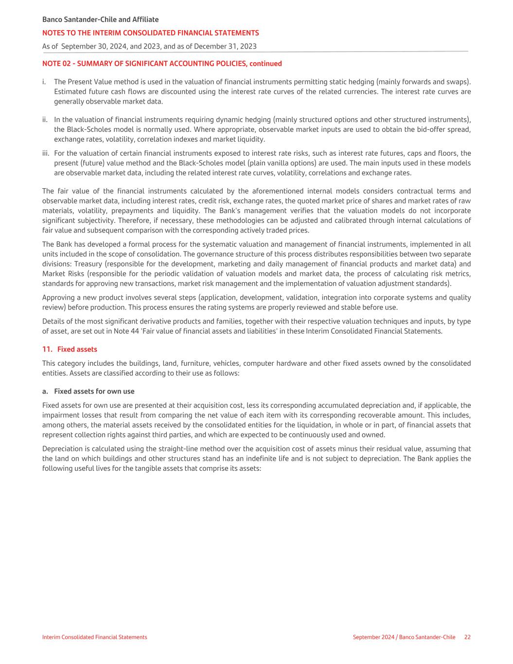 NOTE 02 - SUMMARY OF SIGNIFICANT ACCOUNTING POLICIES, continued i. The Present Value method is used in the valuation of financial instruments permitting static hedging (mainly forwards and swaps). Estimated future cash flows are discounted using the interest rate curves of the related currencies. The interest rate curves are generally observable market data. ii. In the valuation of financial instruments requiring dynamic hedging (mainly structured options and other structured instruments), the Black-Scholes model is normally used. Where appropriate, observable market inputs are used to obtain the bid-offer spread, exchange rates, volatility, correlation indexes and market liquidity. iii. For the valuation of certain financial instruments exposed to interest rate risks, such as interest rate futures, caps and floors, the present (future) value method and the Black-Scholes model (plain vanilla options) are used. The main inputs used in these models are observable market data, including the related interest rate curves, volatility, correlations and exchange rates. The fair value of the financial instruments calculated by the aforementioned internal models considers contractual terms and observable market data, including interest rates, credit risk, exchange rates, the quoted market price of shares and market rates of raw materials, volatility, prepayments and liquidity. The Bank's management verifies that the valuation models do not incorporate significant subjectivity. Therefore, if necessary, these methodologies can be adjusted and calibrated through internal calculations of fair value and subsequent comparison with the corresponding actively traded prices. The Bank has developed a formal process for the systematic valuation and management of financial instruments, implemented in all units included in the scope of consolidation. The governance structure of this process distributes responsibilities between two separate divisions: Treasury (responsible for the development, marketing and daily management of financial products and market data) and Market Risks (responsible for the periodic validation of valuation models and market data, the process of calculating risk metrics, standards for approving new transactions, market risk management and the implementation of valuation adjustment standards). Approving a new product involves several steps (application, development, validation, integration into corporate systems and quality review) before production. This process ensures the rating systems are properly reviewed and stable before use. Details of the most significant derivative products and families, together with their respective valuation techniques and inputs, by type of asset, are set out in Note 44 'Fair value of financial assets and liabilities' in these Interim Consolidated Financial Statements. 11. Fixed assets This category includes the buildings, land, furniture, vehicles, computer hardware and other fixed assets owned by the consolidated entities. Assets are classified according to their use as follows: a. Fixed assets for own use Fixed assets for own use are presented at their acquisition cost, less its corresponding accumulated depreciation and, if applicable, the impairment losses that result from comparing the net value of each item with its corresponding recoverable amount. This includes, among others, the material assets received by the consolidated entities for the liquidation, in whole or in part, of financial assets that represent collection rights against third parties, and which are expected to be continuously used and owned. Depreciation is calculated using the straight-line method over the acquisition cost of assets minus their residual value, assuming that the land on which buildings and other structures stand has an indefinite life and is not subject to depreciation. The Bank applies the following useful lives for the tangible assets that comprise its assets: Banco Santander-Chile and Affiliate NOTES TO THE INTERIM CONSOLIDATED FINANCIAL STATEMENTS As of September 30, 2024, and 2023, and as of December 31, 2023 Interim Consolidated Financial Statements September 2024 / Banco Santander-Chile 22