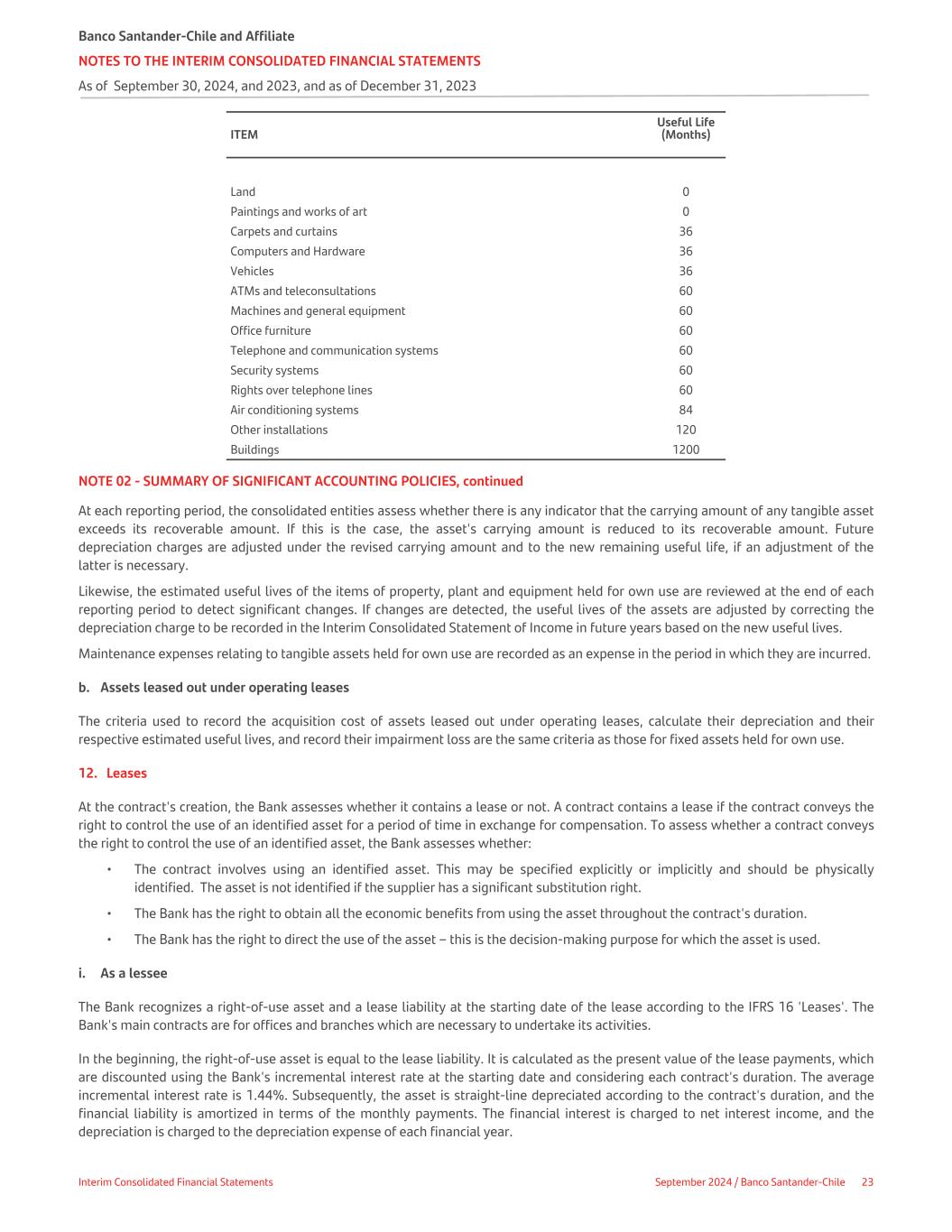 ITEM Useful Life (Months) Land 0 Paintings and works of art 0 Carpets and curtains 36 Computers and Hardware 36 Vehicles 36 ATMs and teleconsultations 60 Machines and general equipment 60 Office furniture 60 Telephone and communication systems 60 Security systems 60 Rights over telephone lines 60 Air conditioning systems 84 Other installations 120 Buildings 1200 NOTE 02 - SUMMARY OF SIGNIFICANT ACCOUNTING POLICIES, continued At each reporting period, the consolidated entities assess whether there is any indicator that the carrying amount of any tangible asset exceeds its recoverable amount. If this is the case, the asset's carrying amount is reduced to its recoverable amount. Future depreciation charges are adjusted under the revised carrying amount and to the new remaining useful life, if an adjustment of the latter is necessary. Likewise, the estimated useful lives of the items of property, plant and equipment held for own use are reviewed at the end of each reporting period to detect significant changes. If changes are detected, the useful lives of the assets are adjusted by correcting the depreciation charge to be recorded in the Interim Consolidated Statement of Income in future years based on the new useful lives. Maintenance expenses relating to tangible assets held for own use are recorded as an expense in the period in which they are incurred. b. Assets leased out under operating leases The criteria used to record the acquisition cost of assets leased out under operating leases, calculate their depreciation and their respective estimated useful lives, and record their impairment loss are the same criteria as those for fixed assets held for own use. 12. Leases At the contract's creation, the Bank assesses whether it contains a lease or not. A contract contains a lease if the contract conveys the right to control the use of an identified asset for a period of time in exchange for compensation. To assess whether a contract conveys the right to control the use of an identified asset, the Bank assesses whether: • The contract involves using an identified asset. This may be specified explicitly or implicitly and should be physically identified. The asset is not identified if the supplier has a significant substitution right. • The Bank has the right to obtain all the economic benefits from using the asset throughout the contract's duration. • The Bank has the right to direct the use of the asset – this is the decision-making purpose for which the asset is used. i. As a lessee The Bank recognizes a right-of-use asset and a lease liability at the starting date of the lease according to the IFRS 16 'Leases'. The Bank's main contracts are for offices and branches which are necessary to undertake its activities. In the beginning, the right-of-use asset is equal to the lease liability. It is calculated as the present value of the lease payments, which are discounted using the Bank's incremental interest rate at the starting date and considering each contract's duration. The average incremental interest rate is 1.44%. Subsequently, the asset is straight-line depreciated according to the contract's duration, and the financial liability is amortized in terms of the monthly payments. The financial interest is charged to net interest income, and the depreciation is charged to the depreciation expense of each financial year. Banco Santander-Chile and Affiliate NOTES TO THE INTERIM CONSOLIDATED FINANCIAL STATEMENTS As of September 30, 2024, and 2023, and as of December 31, 2023 Interim Consolidated Financial Statements September 2024 / Banco Santander-Chile 23