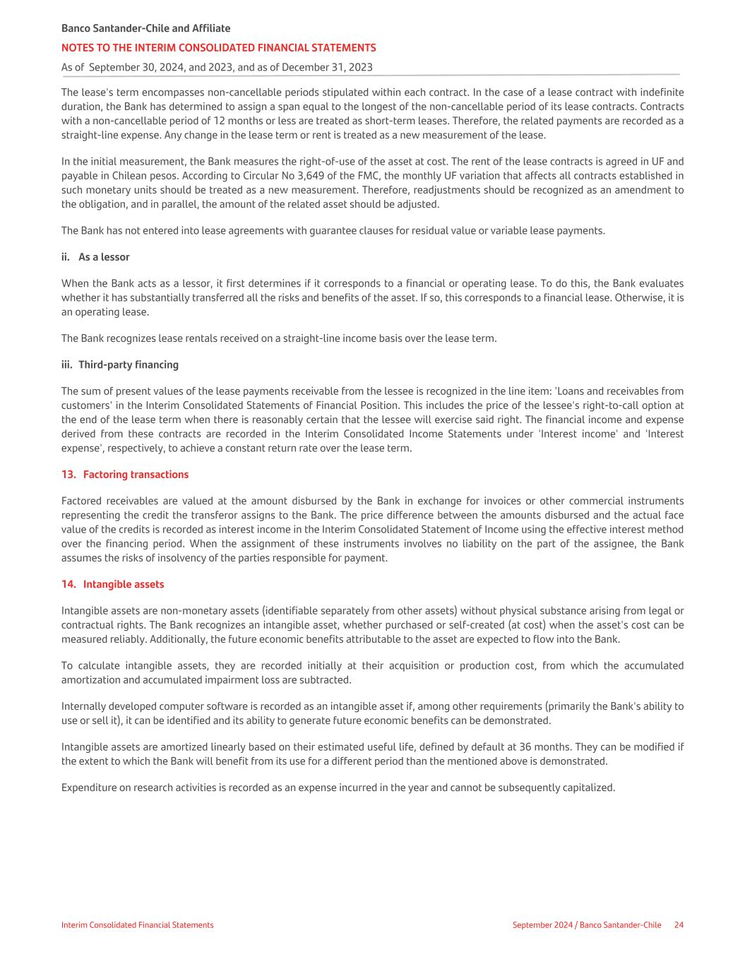 The lease's term encompasses non-cancellable periods stipulated within each contract. In the case of a lease contract with indefinite duration, the Bank has determined to assign a span equal to the longest of the non-cancellable period of its lease contracts. Contracts with a non-cancellable period of 12 months or less are treated as short-term leases. Therefore, the related payments are recorded as a straight-line expense. Any change in the lease term or rent is treated as a new measurement of the lease. In the initial measurement, the Bank measures the right-of-use of the asset at cost. The rent of the lease contracts is agreed in UF and payable in Chilean pesos. According to Circular No 3,649 of the FMC, the monthly UF variation that affects all contracts established in such monetary units should be treated as a new measurement. Therefore, readjustments should be recognized as an amendment to the obligation, and in parallel, the amount of the related asset should be adjusted. The Bank has not entered into lease agreements with guarantee clauses for residual value or variable lease payments. ii. As a lessor When the Bank acts as a lessor, it first determines if it corresponds to a financial or operating lease. To do this, the Bank evaluates whether it has substantially transferred all the risks and benefits of the asset. If so, this corresponds to a financial lease. Otherwise, it is an operating lease. The Bank recognizes lease rentals received on a straight-line income basis over the lease term. iii. Third-party financing The sum of present values of the lease payments receivable from the lessee is recognized in the line item: 'Loans and receivables from customers' in the Interim Consolidated Statements of Financial Position. This includes the price of the lessee's right-to-call option at the end of the lease term when there is reasonably certain that the lessee will exercise said right. The financial income and expense derived from these contracts are recorded in the Interim Consolidated Income Statements under 'Interest income' and 'Interest expense', respectively, to achieve a constant return rate over the lease term. 13. Factoring transactions Factored receivables are valued at the amount disbursed by the Bank in exchange for invoices or other commercial instruments representing the credit the transferor assigns to the Bank. The price difference between the amounts disbursed and the actual face value of the credits is recorded as interest income in the Interim Consolidated Statement of Income using the effective interest method over the financing period. When the assignment of these instruments involves no liability on the part of the assignee, the Bank assumes the risks of insolvency of the parties responsible for payment. 14. Intangible assets Intangible assets are non-monetary assets (identifiable separately from other assets) without physical substance arising from legal or contractual rights. The Bank recognizes an intangible asset, whether purchased or self-created (at cost) when the asset's cost can be measured reliably. Additionally, the future economic benefits attributable to the asset are expected to flow into the Bank. To calculate intangible assets, they are recorded initially at their acquisition or production cost, from which the accumulated amortization and accumulated impairment loss are subtracted. Internally developed computer software is recorded as an intangible asset if, among other requirements (primarily the Bank's ability to use or sell it), it can be identified and its ability to generate future economic benefits can be demonstrated. Intangible assets are amortized linearly based on their estimated useful life, defined by default at 36 months. They can be modified if the extent to which the Bank will benefit from its use for a different period than the mentioned above is demonstrated. Expenditure on research activities is recorded as an expense incurred in the year and cannot be subsequently capitalized. Banco Santander-Chile and Affiliate NOTES TO THE INTERIM CONSOLIDATED FINANCIAL STATEMENTS As of September 30, 2024, and 2023, and as of December 31, 2023 Interim Consolidated Financial Statements September 2024 / Banco Santander-Chile 24