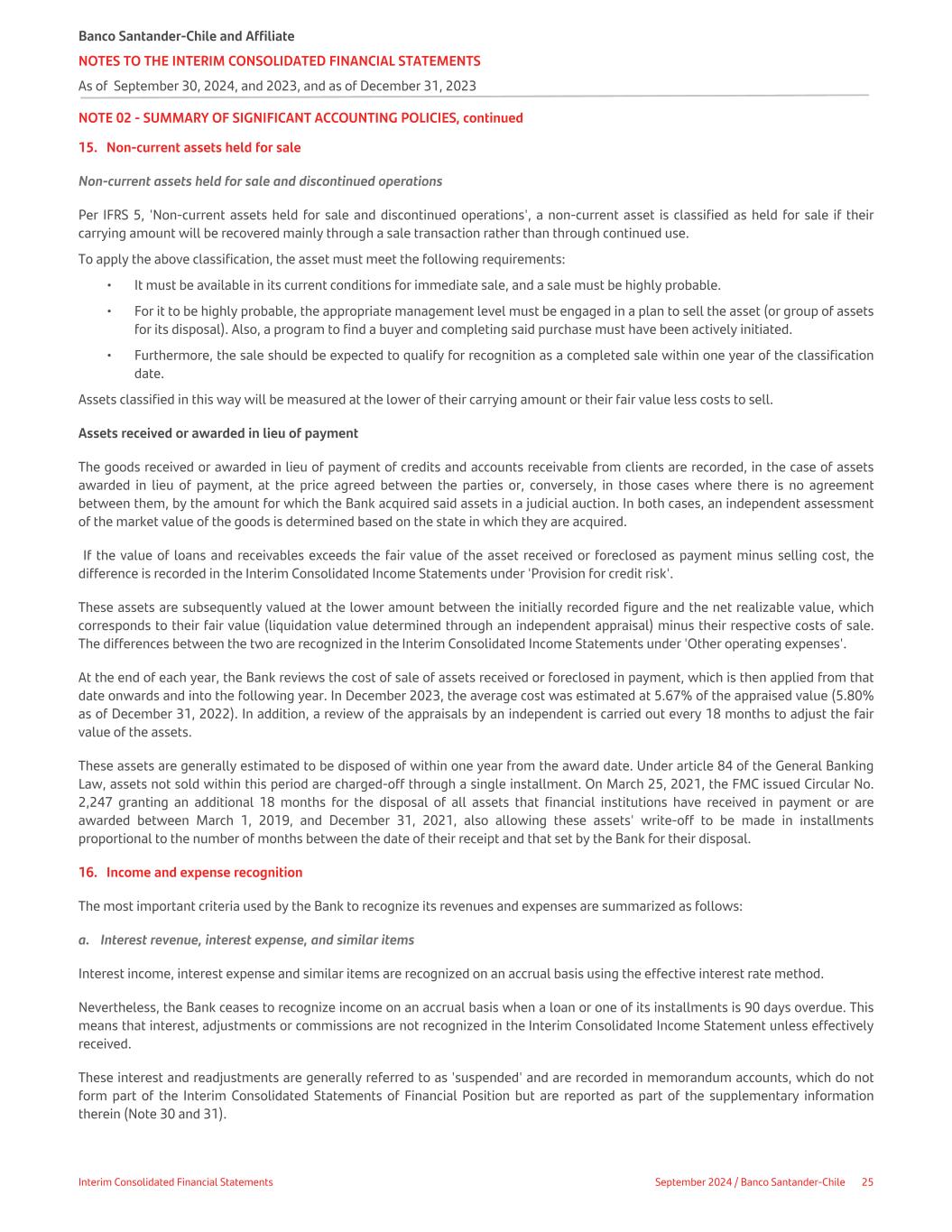 NOTE 02 - SUMMARY OF SIGNIFICANT ACCOUNTING POLICIES, continued 15. Non-current assets held for sale Non-current assets held for sale and discontinued operations Per IFRS 5, 'Non-current assets held for sale and discontinued operations', a non-current asset is classified as held for sale if their carrying amount will be recovered mainly through a sale transaction rather than through continued use. To apply the above classification, the asset must meet the following requirements: • It must be available in its current conditions for immediate sale, and a sale must be highly probable. • For it to be highly probable, the appropriate management level must be engaged in a plan to sell the asset (or group of assets for its disposal). Also, a program to find a buyer and completing said purchase must have been actively initiated. • Furthermore, the sale should be expected to qualify for recognition as a completed sale within one year of the classification date. Assets classified in this way will be measured at the lower of their carrying amount or their fair value less costs to sell. Assets received or awarded in lieu of payment The goods received or awarded in lieu of payment of credits and accounts receivable from clients are recorded, in the case of assets awarded in lieu of payment, at the price agreed between the parties or, conversely, in those cases where there is no agreement between them, by the amount for which the Bank acquired said assets in a judicial auction. In both cases, an independent assessment of the market value of the goods is determined based on the state in which they are acquired. If the value of loans and receivables exceeds the fair value of the asset received or foreclosed as payment minus selling cost, the difference is recorded in the Interim Consolidated Income Statements under 'Provision for credit risk'. These assets are subsequently valued at the lower amount between the initially recorded figure and the net realizable value, which corresponds to their fair value (liquidation value determined through an independent appraisal) minus their respective costs of sale. The differences between the two are recognized in the Interim Consolidated Income Statements under 'Other operating expenses'. At the end of each year, the Bank reviews the cost of sale of assets received or foreclosed in payment, which is then applied from that date onwards and into the following year. In December 2023, the average cost was estimated at 5.67% of the appraised value (5.80% as of December 31, 2022). In addition, a review of the appraisals by an independent is carried out every 18 months to adjust the fair value of the assets. These assets are generally estimated to be disposed of within one year from the award date. Under article 84 of the General Banking Law, assets not sold within this period are charged-off through a single installment. On March 25, 2021, the FMC issued Circular No. 2,247 granting an additional 18 months for the disposal of all assets that financial institutions have received in payment or are awarded between March 1, 2019, and December 31, 2021, also allowing these assets' write-off to be made in installments proportional to the number of months between the date of their receipt and that set by the Bank for their disposal. 16. Income and expense recognition The most important criteria used by the Bank to recognize its revenues and expenses are summarized as follows: a. Interest revenue, interest expense, and similar items Interest income, interest expense and similar items are recognized on an accrual basis using the effective interest rate method. Nevertheless, the Bank ceases to recognize income on an accrual basis when a loan or one of its installments is 90 days overdue. This means that interest, adjustments or commissions are not recognized in the Interim Consolidated Income Statement unless effectively received. These interest and readjustments are generally referred to as 'suspended' and are recorded in memorandum accounts, which do not form part of the Interim Consolidated Statements of Financial Position but are reported as part of the supplementary information therein (Note 30 and 31). Banco Santander-Chile and Affiliate NOTES TO THE INTERIM CONSOLIDATED FINANCIAL STATEMENTS As of September 30, 2024, and 2023, and as of December 31, 2023 Interim Consolidated Financial Statements September 2024 / Banco Santander-Chile 25