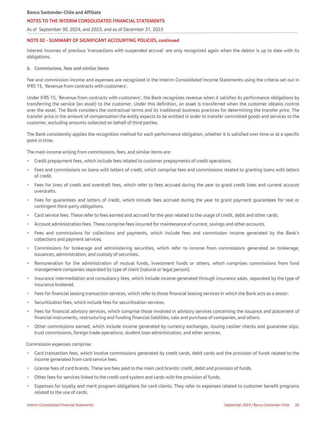 NOTE 02 - SUMMARY OF SIGNIFICANT ACCOUNTING POLICIES, continued Interest incomes of previous 'transactions with suspended accrual' are only recognized again when the debtor is up to date with its obligations. b. Commissions, fees and similar items Fee and commission income and expenses are recognized in the Interim Consolidated Income Statements using the criteria set out in IFRS 15, ‘Revenue from contracts with customers'. Under IFRS 15, 'Revenue from contracts with customers', the Bank recognizes revenue when it satisfies its performance obligations by transferring the service (an asset) to the customer. Under this definition, an asset is transferred when the customer obtains control over the asset. The Bank considers the contractual terms and its traditional business practices for determining the transfer price. The transfer price is the amount of compensation the entity expects to be entitled in order to transfer committed goods and services to the customer, excluding amounts collected on behalf of third parties. The Bank consistently applies the recognition method for each performance obligation, whether it is satisfied over time or at a specific point in time. The main income arising from commissions, fees, and similar items are: • Credit prepayment fees, which include fees related to customer prepayments of credit operations. • Fees and commissions on loans with letters of credit, which comprise fees and commissions related to granting loans with letters of credit. • Fees for lines of credit and overdraft fees, which refer to fees accrued during the year to grant credit lines and current account overdrafts. • Fees for guarantees and letters of credit, which include fees accrued during the year to grant payment guarantees for real or contingent third-party obligations. • Card service fees. These refer to fees earned and accrued for the year related to the usage of credit, debit and other cards. • Account administration fees. These comprise fees incurred for maintenance of current, savings and other accounts. • Fees and commissions for collections and payments, which include fees and commission income generated by the Bank's collections and payment services. • Commissions for brokerage and administering securities, which refer to income from commissions generated on brokerage, issuances, administration, and custody of securities. • Remuneration for the administration of mutual funds, investment funds or others, which comprises commissions from fund management companies separated by type of client (natural or legal person). • Insurance intermediation and consultancy fees, which include income generated through insurance sales, separated by the type of insurance brokered. • Fees for financial leasing transaction services, which refer to those financial leasing services in which the Bank acts as a lessor. • Securitization fees, which include fees for securitization services. • Fees for financial advisory services, which comprise those involved in advisory services concerning the issuance and placement of financial instruments, restructuring and funding financial liabilities, sale and purchase of companies, and others. • Other commissions earned, which include income generated by currency exchanges, issuing cashier checks and guarantee slips, trust commissions, foreign trade operations, student loan administration, and other services. Commission expenses comprise: • Card transaction fees, which involve commissions generated by credit cards, debit cards and the provision of funds related to the income generated from card service fees. • License fees of card brands. These are fees paid to the main card brands: credit, debit and provision of funds. • Other fees for services linked to the credit card system and cards with the provision of funds. • Expenses for loyalty and merit program obligations for card clients. They refer to expenses related to customer benefit programs related to the use of cards. Banco Santander-Chile and Affiliate NOTES TO THE INTERIM CONSOLIDATED FINANCIAL STATEMENTS As of September 30, 2024, and 2023, and as of December 31, 2023 Interim Consolidated Financial Statements September 2024 / Banco Santander-Chile 26