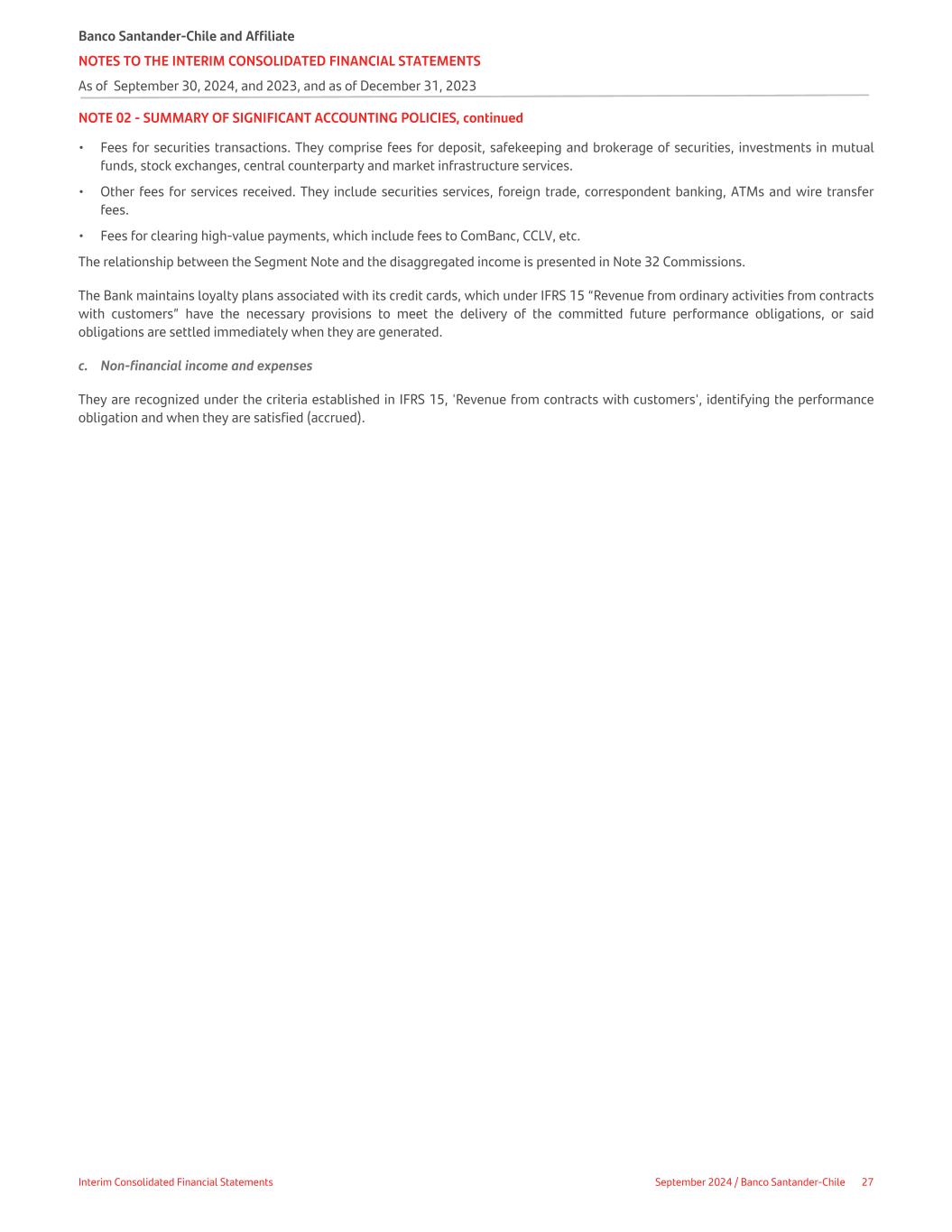 NOTE 02 - SUMMARY OF SIGNIFICANT ACCOUNTING POLICIES, continued • Fees for securities transactions. They comprise fees for deposit, safekeeping and brokerage of securities, investments in mutual funds, stock exchanges, central counterparty and market infrastructure services. • Other fees for services received. They include securities services, foreign trade, correspondent banking, ATMs and wire transfer fees. • Fees for clearing high-value payments, which include fees to ComBanc, CCLV, etc. The relationship between the Segment Note and the disaggregated income is presented in Note 32 Commissions. The Bank maintains loyalty plans associated with its credit cards, which under IFRS 15 “Revenue from ordinary activities from contracts with customers” have the necessary provisions to meet the delivery of the committed future performance obligations, or said obligations are settled immediately when they are generated. c. Non-financial income and expenses They are recognized under the criteria established in IFRS 15, 'Revenue from contracts with customers', identifying the performance obligation and when they are satisfied (accrued). Banco Santander-Chile and Affiliate NOTES TO THE INTERIM CONSOLIDATED FINANCIAL STATEMENTS As of September 30, 2024, and 2023, and as of December 31, 2023 Interim Consolidated Financial Statements September 2024 / Banco Santander-Chile 27