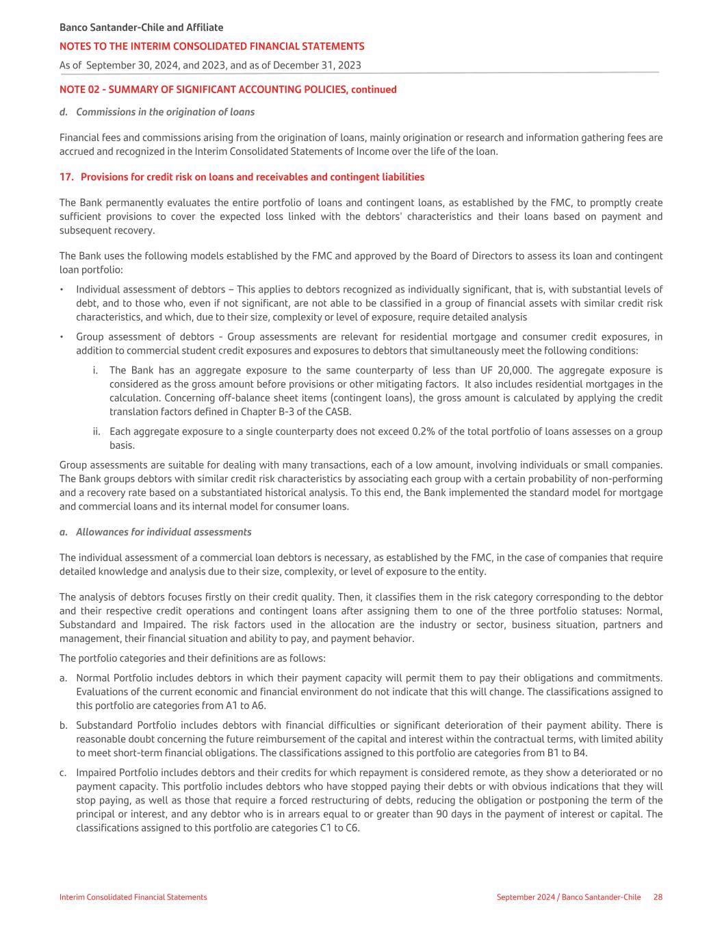 NOTE 02 - SUMMARY OF SIGNIFICANT ACCOUNTING POLICIES, continued d. Commissions in the origination of loans Financial fees and commissions arising from the origination of loans, mainly origination or research and information gathering fees are accrued and recognized in the Interim Consolidated Statements of Income over the life of the loan. 17. Provisions for credit risk on loans and receivables and contingent liabilities The Bank permanently evaluates the entire portfolio of loans and contingent loans, as established by the FMC, to promptly create sufficient provisions to cover the expected loss linked with the debtors' characteristics and their loans based on payment and subsequent recovery. The Bank uses the following models established by the FMC and approved by the Board of Directors to assess its loan and contingent loan portfolio: • Individual assessment of debtors – This applies to debtors recognized as individually significant, that is, with substantial levels of debt, and to those who, even if not significant, are not able to be classified in a group of financial assets with similar credit risk characteristics, and which, due to their size, complexity or level of exposure, require detailed analysis • Group assessment of debtors - Group assessments are relevant for residential mortgage and consumer credit exposures, in addition to commercial student credit exposures and exposures to debtors that simultaneously meet the following conditions: i. The Bank has an aggregate exposure to the same counterparty of less than UF 20,000. The aggregate exposure is considered as the gross amount before provisions or other mitigating factors. It also includes residential mortgages in the calculation. Concerning off-balance sheet items (contingent loans), the gross amount is calculated by applying the credit translation factors defined in Chapter B-3 of the CASB. ii. Each aggregate exposure to a single counterparty does not exceed 0.2% of the total portfolio of loans assesses on a group basis. Group assessments are suitable for dealing with many transactions, each of a low amount, involving individuals or small companies. The Bank groups debtors with similar credit risk characteristics by associating each group with a certain probability of non-performing and a recovery rate based on a substantiated historical analysis. To this end, the Bank implemented the standard model for mortgage and commercial loans and its internal model for consumer loans. a. Allowances for individual assessments The individual assessment of a commercial loan debtors is necessary, as established by the FMC, in the case of companies that require detailed knowledge and analysis due to their size, complexity, or level of exposure to the entity. The analysis of debtors focuses firstly on their credit quality. Then, it classifies them in the risk category corresponding to the debtor and their respective credit operations and contingent loans after assigning them to one of the three portfolio statuses: Normal, Substandard and Impaired. The risk factors used in the allocation are the industry or sector, business situation, partners and management, their financial situation and ability to pay, and payment behavior. The portfolio categories and their definitions are as follows: a. Normal Portfolio includes debtors in which their payment capacity will permit them to pay their obligations and commitments. Evaluations of the current economic and financial environment do not indicate that this will change. The classifications assigned to this portfolio are categories from A1 to A6. b. Substandard Portfolio includes debtors with financial difficulties or significant deterioration of their payment ability. There is reasonable doubt concerning the future reimbursement of the capital and interest within the contractual terms, with limited ability to meet short-term financial obligations. The classifications assigned to this portfolio are categories from B1 to B4. c. Impaired Portfolio includes debtors and their credits for which repayment is considered remote, as they show a deteriorated or no payment capacity. This portfolio includes debtors who have stopped paying their debts or with obvious indications that they will stop paying, as well as those that require a forced restructuring of debts, reducing the obligation or postponing the term of the principal or interest, and any debtor who is in arrears equal to or greater than 90 days in the payment of interest or capital. The classifications assigned to this portfolio are categories C1 to C6. Banco Santander-Chile and Affiliate NOTES TO THE INTERIM CONSOLIDATED FINANCIAL STATEMENTS As of September 30, 2024, and 2023, and as of December 31, 2023 Interim Consolidated Financial Statements September 2024 / Banco Santander-Chile 28