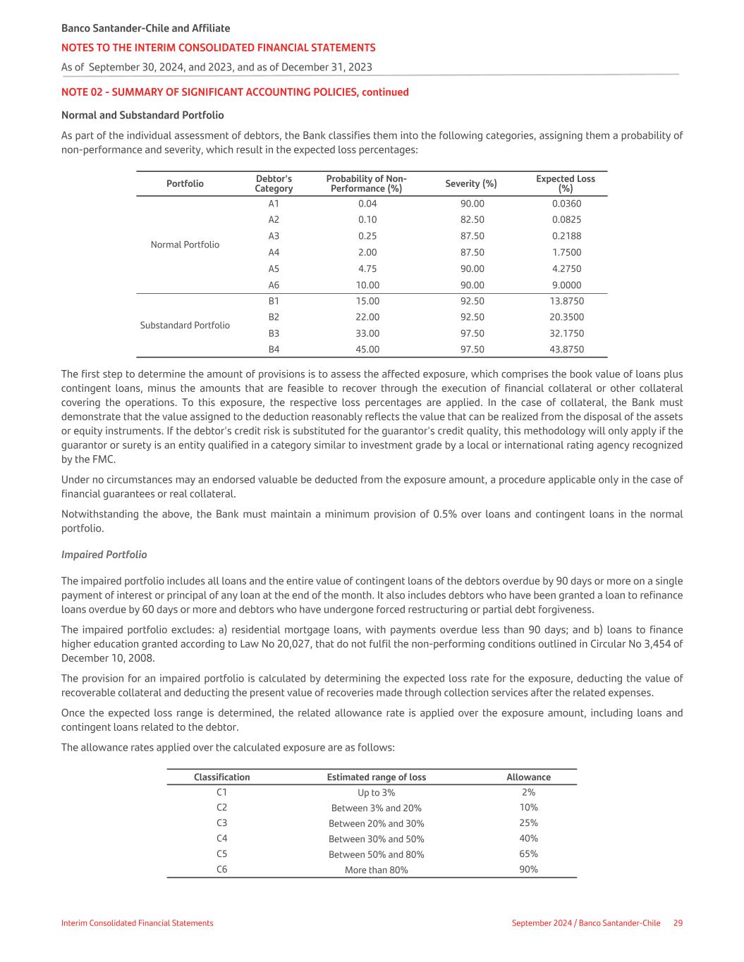 NOTE 02 - SUMMARY OF SIGNIFICANT ACCOUNTING POLICIES, continued Normal and Substandard Portfolio As part of the individual assessment of debtors, the Bank classifies them into the following categories, assigning them a probability of non-performance and severity, which result in the expected loss percentages: Portfolio Debtor's Category Probability of Non- Performance (%) Severity (%) Expected Loss (%) Normal Portfolio A1 0.04 90.00 0.0360 A2 0.10 82.50 0.0825 A3 0.25 87.50 0.2188 A4 2.00 87.50 1.7500 A5 4.75 90.00 4.2750 A6 10.00 90.00 9.0000 Substandard Portfolio B1 15.00 92.50 13.8750 B2 22.00 92.50 20.3500 B3 33.00 97.50 32.1750 B4 45.00 97.50 43.8750 The first step to determine the amount of provisions is to assess the affected exposure, which comprises the book value of loans plus contingent loans, minus the amounts that are feasible to recover through the execution of financial collateral or other collateral covering the operations. To this exposure, the respective loss percentages are applied. In the case of collateral, the Bank must demonstrate that the value assigned to the deduction reasonably reflects the value that can be realized from the disposal of the assets or equity instruments. If the debtor's credit risk is substituted for the guarantor's credit quality, this methodology will only apply if the guarantor or surety is an entity qualified in a category similar to investment grade by a local or international rating agency recognized by the FMC. Under no circumstances may an endorsed valuable be deducted from the exposure amount, a procedure applicable only in the case of financial guarantees or real collateral. Notwithstanding the above, the Bank must maintain a minimum provision of 0.5% over loans and contingent loans in the normal portfolio. Impaired Portfolio The impaired portfolio includes all loans and the entire value of contingent loans of the debtors overdue by 90 days or more on a single payment of interest or principal of any loan at the end of the month. It also includes debtors who have been granted a loan to refinance loans overdue by 60 days or more and debtors who have undergone forced restructuring or partial debt forgiveness. The impaired portfolio excludes: a) residential mortgage loans, with payments overdue less than 90 days; and b) loans to finance higher education granted according to Law No 20,027, that do not fulfil the non-performing conditions outlined in Circular No 3,454 of December 10, 2008. The provision for an impaired portfolio is calculated by determining the expected loss rate for the exposure, deducting the value of recoverable collateral and deducting the present value of recoveries made through collection services after the related expenses. Once the expected loss range is determined, the related allowance rate is applied over the exposure amount, including loans and contingent loans related to the debtor. The allowance rates applied over the calculated exposure are as follows: Classification Estimated range of loss Allowance C1 Up to 3% 2% C2 Between 3% and 20% 10% C3 Between 20% and 30% 25% C4 Between 30% and 50% 40% C5 Between 50% and 80% 65% C6 More than 80% 90% Banco Santander-Chile and Affiliate NOTES TO THE INTERIM CONSOLIDATED FINANCIAL STATEMENTS As of September 30, 2024, and 2023, and as of December 31, 2023 Interim Consolidated Financial Statements September 2024 / Banco Santander-Chile 29