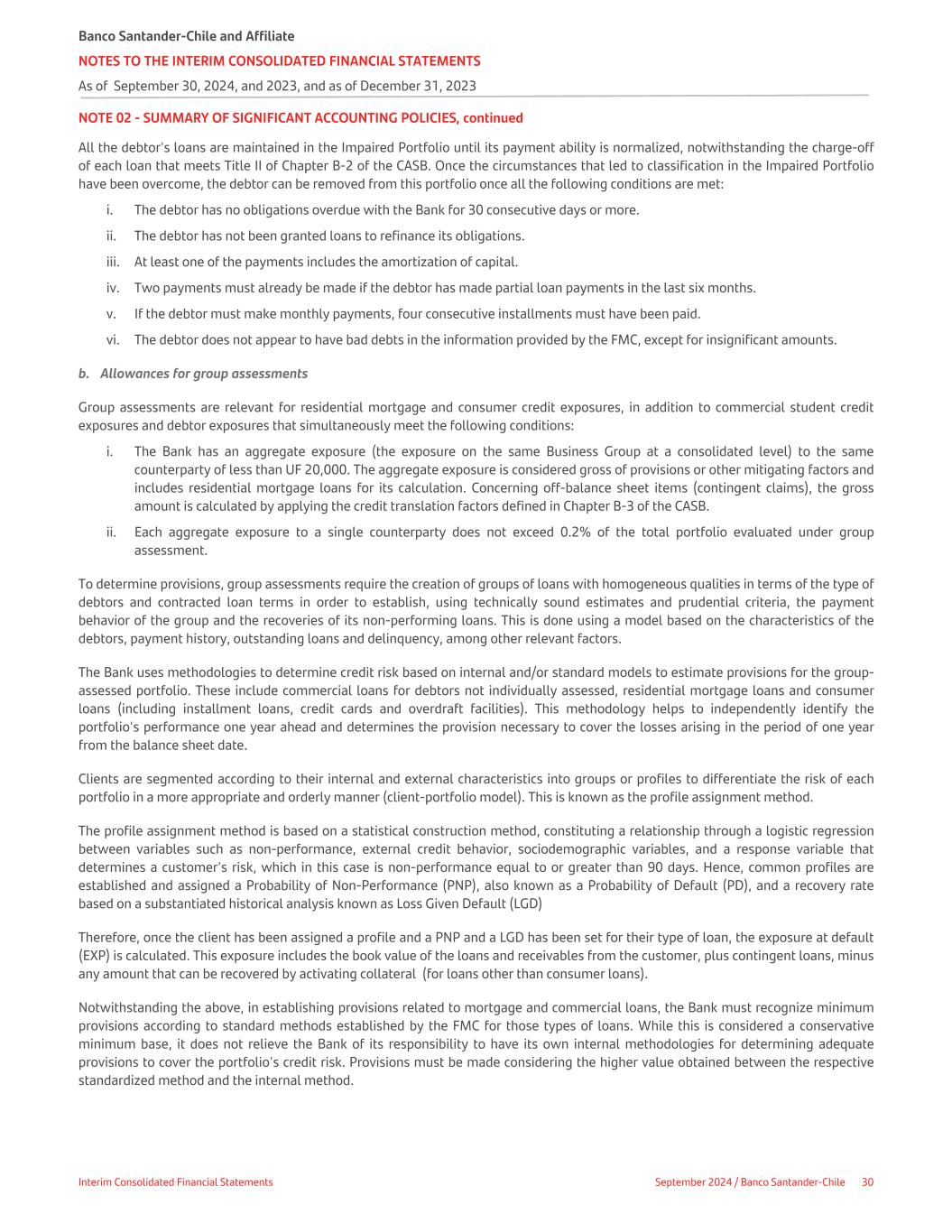 NOTE 02 - SUMMARY OF SIGNIFICANT ACCOUNTING POLICIES, continued All the debtor's loans are maintained in the Impaired Portfolio until its payment ability is normalized, notwithstanding the charge-off of each loan that meets Title II of Chapter B-2 of the CASB. Once the circumstances that led to classification in the Impaired Portfolio have been overcome, the debtor can be removed from this portfolio once all the following conditions are met: i. The debtor has no obligations overdue with the Bank for 30 consecutive days or more. ii. The debtor has not been granted loans to refinance its obligations. iii. At least one of the payments includes the amortization of capital. iv. Two payments must already be made if the debtor has made partial loan payments in the last six months. v. If the debtor must make monthly payments, four consecutive installments must have been paid. vi. The debtor does not appear to have bad debts in the information provided by the FMC, except for insignificant amounts. b. Allowances for group assessments Group assessments are relevant for residential mortgage and consumer credit exposures, in addition to commercial student credit exposures and debtor exposures that simultaneously meet the following conditions: i. The Bank has an aggregate exposure (the exposure on the same Business Group at a consolidated level) to the same counterparty of less than UF 20,000. The aggregate exposure is considered gross of provisions or other mitigating factors and includes residential mortgage loans for its calculation. Concerning off-balance sheet items (contingent claims), the gross amount is calculated by applying the credit translation factors defined in Chapter B-3 of the CASB. ii. Each aggregate exposure to a single counterparty does not exceed 0.2% of the total portfolio evaluated under group assessment. To determine provisions, group assessments require the creation of groups of loans with homogeneous qualities in terms of the type of debtors and contracted loan terms in order to establish, using technically sound estimates and prudential criteria, the payment behavior of the group and the recoveries of its non-performing loans. This is done using a model based on the characteristics of the debtors, payment history, outstanding loans and delinquency, among other relevant factors. The Bank uses methodologies to determine credit risk based on internal and/or standard models to estimate provisions for the group- assessed portfolio. These include commercial loans for debtors not individually assessed, residential mortgage loans and consumer loans (including installment loans, credit cards and overdraft facilities). This methodology helps to independently identify the portfolio's performance one year ahead and determines the provision necessary to cover the losses arising in the period of one year from the balance sheet date. Clients are segmented according to their internal and external characteristics into groups or profiles to differentiate the risk of each portfolio in a more appropriate and orderly manner (client-portfolio model). This is known as the profile assignment method. The profile assignment method is based on a statistical construction method, constituting a relationship through a logistic regression between variables such as non-performance, external credit behavior, sociodemographic variables, and a response variable that determines a customer's risk, which in this case is non-performance equal to or greater than 90 days. Hence, common profiles are established and assigned a Probability of Non-Performance (PNP), also known as a Probability of Default (PD), and a recovery rate based on a substantiated historical analysis known as Loss Given Default (LGD) Therefore, once the client has been assigned a profile and a PNP and a LGD has been set for their type of loan, the exposure at default (EXP) is calculated. This exposure includes the book value of the loans and receivables from the customer, plus contingent loans, minus any amount that can be recovered by activating collateral (for loans other than consumer loans). Notwithstanding the above, in establishing provisions related to mortgage and commercial loans, the Bank must recognize minimum provisions according to standard methods established by the FMC for those types of loans. While this is considered a conservative minimum base, it does not relieve the Bank of its responsibility to have its own internal methodologies for determining adequate provisions to cover the portfolio's credit risk. Provisions must be made considering the higher value obtained between the respective standardized method and the internal method. Banco Santander-Chile and Affiliate NOTES TO THE INTERIM CONSOLIDATED FINANCIAL STATEMENTS As of September 30, 2024, and 2023, and as of December 31, 2023 Interim Consolidated Financial Statements September 2024 / Banco Santander-Chile 30