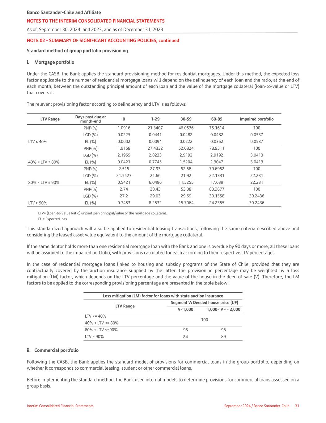 NOTE 02 - SUMMARY OF SIGNIFICANT ACCOUNTING POLICIES, continued Standard method of group portfolio provisioning i. Mortgage portfolio Under the CASB, the Bank applies the standard provisioning method for residential mortgages. Under this method, the expected loss factor applicable to the number of residential mortgage loans will depend on the delinquency of each loan and the ratio, at the end of each month, between the outstanding principal amount of each loan and the value of the mortgage collateral (loan-to-value or LTV) that covers it. The relevant provisioning factor according to delinquency and LTV is as follows: LTV Range Days past due at month-end 0 1-29 30-59 60-89 Impaired portfolio LTV ≤ 40% PNP(%) 1.0916 21.3407 46.0536 75.1614 100 LGD (%) 0.0225 0.0441 0.0482 0.0482 0.0537 EL (%) 0.0002 0.0094 0.0222 0.0362 0.0537 40% < LTV ≤ 80% PNP(%) 1.9158 27.4332 52.0824 78.9511 100 LGD (%) 2.1955 2.8233 2.9192 2.9192 3.0413 EL (%) 0.0421 0.7745 1.5204 2.3047 3.0413 80% < LTV ≤ 90% PNP(%) 2.515 27.93 52.58 79.6952 100 LGD (%) 21.5527 21.66 21.92 22.1331 22.231 EL (%) 0.5421 6.0496 11.5255 17.639 22.231 LTV > 90% PNP(%) 2.74 28.43 53.08 80.3677 100 LGD (%) 27.2 29.03 29.59 30.1558 30.2436 EL (%) 0.7453 8.2532 15.7064 24.2355 30.2436 LTV= (Loan-to-Value Ratio) unpaid loan principal/value of the mortgage collateral. EL = Expected loss This standardized approach will also be applied to residential leasing transactions, following the same criteria described above and considering the leased asset value equivalent to the amount of the mortgage collateral. If the same debtor holds more than one residential mortgage loan with the Bank and one is overdue by 90 days or more, all these loans will be assigned to the impaired portfolio, with provisions calculated for each according to their respective LTV percentages. In the case of residential mortgage loans linked to housing and subsidy programs of the State of Chile, provided that they are contractually covered by the auction insurance supplied by the latter, the provisioning percentage may be weighted by a loss mitigation (LM) factor, which depends on the LTV percentage and the value of the house in the deed of sale (V). Therefore, the LM factors to be applied to the corresponding provisioning percentage are presented in the table below: Loss mitigation (LM) factor for loans with state auction insurance LTV Range Segment V: Deeded house price (UF) V<1,000 1,000< V <= 2,000 LTV <= 40% 100 40% < LTV <= 80% 80% < LTV <=90% 95 96 LTV > 90% 84 89 ii. Commercial portfolio Following the CASB, the Bank applies the standard model of provisions for commercial loans in the group portfolio, depending on whether it corresponds to commercial leasing, student or other commercial loans. Before implementing the standard method, the Bank used internal models to determine provisions for commercial loans assessed on a group basis. Banco Santander-Chile and Affiliate NOTES TO THE INTERIM CONSOLIDATED FINANCIAL STATEMENTS As of September 30, 2024, and 2023, and as of December 31, 2023 Interim Consolidated Financial Statements September 2024 / Banco Santander-Chile 31