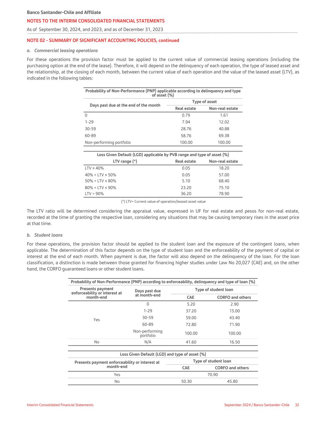 NOTE 02 - SUMMARY OF SIGNIFICANT ACCOUNTING POLICIES, continued a. Commercial leasing operations For these operations the provision factor must be applied to the current value of commercial leasing operations (including the purchasing option at the end of the lease). Therefore, it will depend on the delinquency of each operation, the type of leased asset and the relationship, at the closing of each month, between the current value of each operation and the value of the leased asset (LTV), as indicated in the following tables: Probability of Non-Performance (PNP) applicable according to delinquency and type of asset (%) Days past due at the end of the month Type of asset Real estate Non-real estate 0 0.79 1.61 1-29 7.94 12.02 30-59 28.76 40.88 60-89 58.76 69.38 Non-performing portfolio 100.00 100.00 Loss Given Default (LGD) applicable by PVB range and type of asset (%) LTV range (*) Real estate Non-real estate LTV ≤ 40% 0.05 18.20 40% < LTV ≤ 50% 0.05 57.00 50% < LTV ≤ 80% 5.10 68.40 80% < LTV ≤ 90% 23.20 75.10 LTV > 90% 36.20 78.90 (*) LTV= Current value of operation/leased asset value The LTV ratio will be determined considering the appraisal value, expressed in UF for real estate and pesos for non-real estate, recorded at the time of granting the respective loan, considering any situations that may be causing temporary rises in the asset price at that time. b. Student loans For these operations, the provision factor should be applied to the student loan and the exposure of the contingent loans, when applicable. The determination of this factor depends on the type of student loan and the enforceability of the payment of capital or interest at the end of each month. When payment is due, the factor will also depend on the delinquency of the loan. For the loan classification, a distinction is made between those granted for financing higher studies under Law No 20,027 (CAE) and, on the other hand, the CORFO guaranteed loans or other student loans. Probability of Non-Performance (PNP) according to enforceability, delinquency and type of loan (%) Presents payment enforceability or interest at month-end Days past due at month-end Type of student loan CAE CORFO and others Yes 0 5.20 2.90 1-29 37.20 15.00 30-59 59.00 43.40 60-89 72.80 71.90 Non-performing portfolio 100.00 100.00 No N/A 41.60 16.50 Loss Given Default (LGD) and type of asset (%) Presents payment enforceability or interest at month-end Type of student loan CAE CORFO and others Yes 70.90 No 50.30 45.80 Banco Santander-Chile and Affiliate NOTES TO THE INTERIM CONSOLIDATED FINANCIAL STATEMENTS As of September 30, 2024, and 2023, and as of December 31, 2023 Interim Consolidated Financial Statements September 2024 / Banco Santander-Chile 32