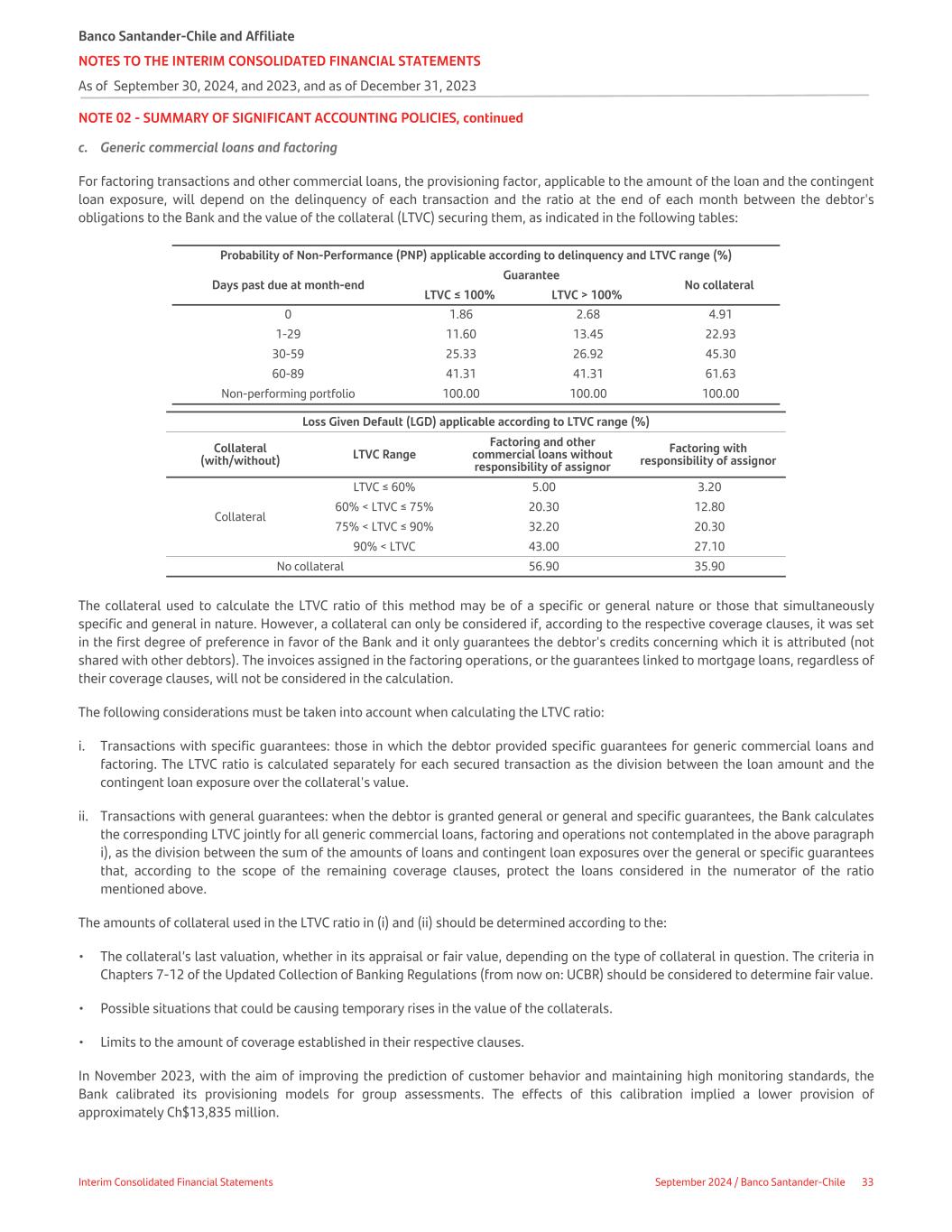 NOTE 02 - SUMMARY OF SIGNIFICANT ACCOUNTING POLICIES, continued c. Generic commercial loans and factoring For factoring transactions and other commercial loans, the provisioning factor, applicable to the amount of the loan and the contingent loan exposure, will depend on the delinquency of each transaction and the ratio at the end of each month between the debtor's obligations to the Bank and the value of the collateral (LTVC) securing them, as indicated in the following tables: Probability of Non-Performance (PNP) applicable according to delinquency and LTVC range (%) Days past due at month-end Guarantee No collateral LTVC ≤ 100% LTVC > 100% 0 1.86 2.68 4.91 1-29 11.60 13.45 22.93 30-59 25.33 26.92 45.30 60-89 41.31 41.31 61.63 Non-performing portfolio 100.00 100.00 100.00 Loss Given Default (LGD) applicable according to LTVC range (%) Collateral (with/without) LTVC Range Factoring and other commercial loans without responsibility of assignor Factoring with responsibility of assignor Collateral LTVC ≤ 60% 5.00 3.20 60% < LTVC ≤ 75% 20.30 12.80 75% < LTVC ≤ 90% 32.20 20.30 90% < LTVC 43.00 27.10 No collateral 56.90 35.90 The collateral used to calculate the LTVC ratio of this method may be of a specific or general nature or those that simultaneously specific and general in nature. However, a collateral can only be considered if, according to the respective coverage clauses, it was set in the first degree of preference in favor of the Bank and it only guarantees the debtor's credits concerning which it is attributed (not shared with other debtors). The invoices assigned in the factoring operations, or the guarantees linked to mortgage loans, regardless of their coverage clauses, will not be considered in the calculation. The following considerations must be taken into account when calculating the LTVC ratio: i. Transactions with specific guarantees: those in which the debtor provided specific guarantees for generic commercial loans and factoring. The LTVC ratio is calculated separately for each secured transaction as the division between the loan amount and the contingent loan exposure over the collateral's value. ii. Transactions with general guarantees: when the debtor is granted general or general and specific guarantees, the Bank calculates the corresponding LTVC jointly for all generic commercial loans, factoring and operations not contemplated in the above paragraph i), as the division between the sum of the amounts of loans and contingent loan exposures over the general or specific guarantees that, according to the scope of the remaining coverage clauses, protect the loans considered in the numerator of the ratio mentioned above. The amounts of collateral used in the LTVC ratio in (i) and (ii) should be determined according to the: • The collateral’s last valuation, whether in its appraisal or fair value, depending on the type of collateral in question. The criteria in Chapters 7-12 of the Updated Collection of Banking Regulations (from now on: UCBR) should be considered to determine fair value. • Possible situations that could be causing temporary rises in the value of the collaterals. • Limits to the amount of coverage established in their respective clauses. In November 2023, with the aim of improving the prediction of customer behavior and maintaining high monitoring standards, the Bank calibrated its provisioning models for group assessments. The effects of this calibration implied a lower provision of approximately Ch$13,835 million. Banco Santander-Chile and Affiliate NOTES TO THE INTERIM CONSOLIDATED FINANCIAL STATEMENTS As of September 30, 2024, and 2023, and as of December 31, 2023 Interim Consolidated Financial Statements September 2024 / Banco Santander-Chile 33