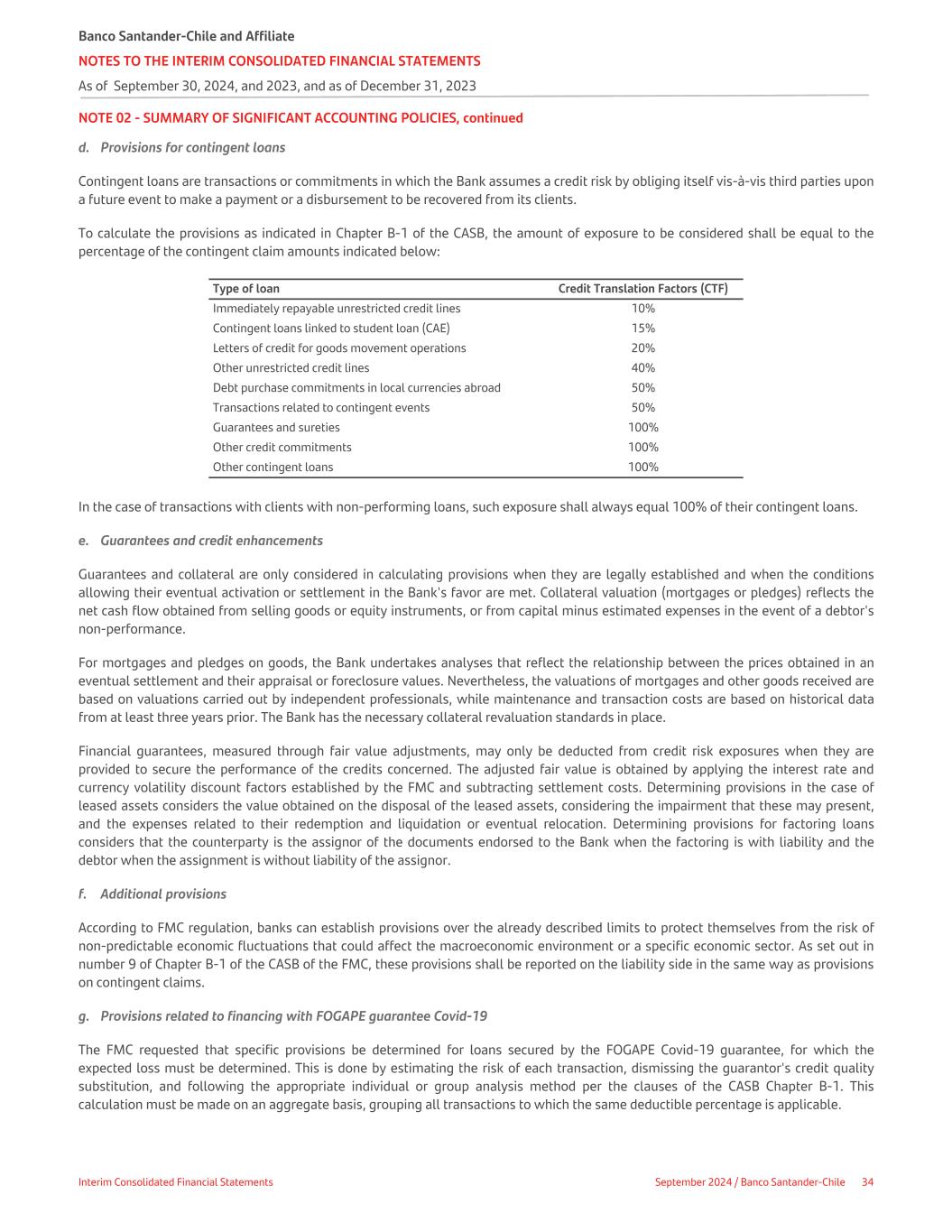 NOTE 02 - SUMMARY OF SIGNIFICANT ACCOUNTING POLICIES, continued d. Provisions for contingent loans Contingent loans are transactions or commitments in which the Bank assumes a credit risk by obliging itself vis-à-vis third parties upon a future event to make a payment or a disbursement to be recovered from its clients. To calculate the provisions as indicated in Chapter B-1 of the CASB, the amount of exposure to be considered shall be equal to the percentage of the contingent claim amounts indicated below: Type of loan Credit Translation Factors (CTF) Immediately repayable unrestricted credit lines 10% Contingent loans linked to student loan (CAE) 15% Letters of credit for goods movement operations 20% Other unrestricted credit lines 40% Debt purchase commitments in local currencies abroad 50% Transactions related to contingent events 50% Guarantees and sureties 100% Other credit commitments 100% Other contingent loans 100% In the case of transactions with clients with non-performing loans, such exposure shall always equal 100% of their contingent loans. e. Guarantees and credit enhancements Guarantees and collateral are only considered in calculating provisions when they are legally established and when the conditions allowing their eventual activation or settlement in the Bank's favor are met. Collateral valuation (mortgages or pledges) reflects the net cash flow obtained from selling goods or equity instruments, or from capital minus estimated expenses in the event of a debtor's non-performance. For mortgages and pledges on goods, the Bank undertakes analyses that reflect the relationship between the prices obtained in an eventual settlement and their appraisal or foreclosure values. Nevertheless, the valuations of mortgages and other goods received are based on valuations carried out by independent professionals, while maintenance and transaction costs are based on historical data from at least three years prior. The Bank has the necessary collateral revaluation standards in place. Financial guarantees, measured through fair value adjustments, may only be deducted from credit risk exposures when they are provided to secure the performance of the credits concerned. The adjusted fair value is obtained by applying the interest rate and currency volatility discount factors established by the FMC and subtracting settlement costs. Determining provisions in the case of leased assets considers the value obtained on the disposal of the leased assets, considering the impairment that these may present, and the expenses related to their redemption and liquidation or eventual relocation. Determining provisions for factoring loans considers that the counterparty is the assignor of the documents endorsed to the Bank when the factoring is with liability and the debtor when the assignment is without liability of the assignor. f. Additional provisions According to FMC regulation, banks can establish provisions over the already described limits to protect themselves from the risk of non-predictable economic fluctuations that could affect the macroeconomic environment or a specific economic sector. As set out in number 9 of Chapter B-1 of the CASB of the FMC, these provisions shall be reported on the liability side in the same way as provisions on contingent claims. g. Provisions related to financing with FOGAPE guarantee Covid-19 The FMC requested that specific provisions be determined for loans secured by the FOGAPE Covid-19 guarantee, for which the expected loss must be determined. This is done by estimating the risk of each transaction, dismissing the guarantor's credit quality substitution, and following the appropriate individual or group analysis method per the clauses of the CASB Chapter B-1. This calculation must be made on an aggregate basis, grouping all transactions to which the same deductible percentage is applicable. Banco Santander-Chile and Affiliate NOTES TO THE INTERIM CONSOLIDATED FINANCIAL STATEMENTS As of September 30, 2024, and 2023, and as of December 31, 2023 Interim Consolidated Financial Statements September 2024 / Banco Santander-Chile 34