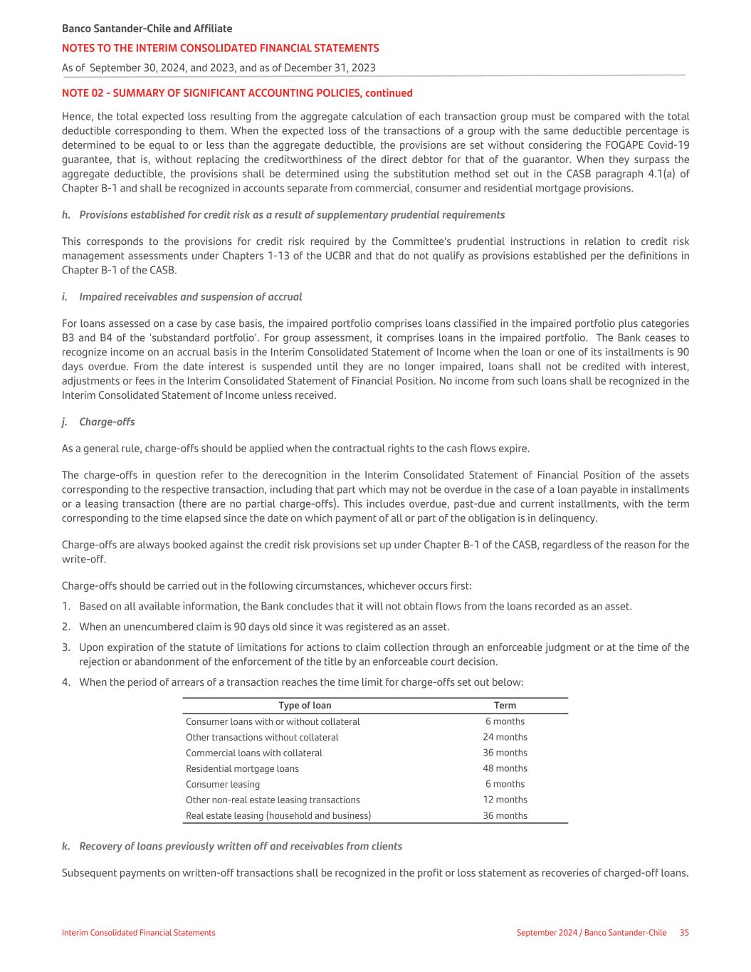 NOTE 02 - SUMMARY OF SIGNIFICANT ACCOUNTING POLICIES, continued Hence, the total expected loss resulting from the aggregate calculation of each transaction group must be compared with the total deductible corresponding to them. When the expected loss of the transactions of a group with the same deductible percentage is determined to be equal to or less than the aggregate deductible, the provisions are set without considering the FOGAPE Covid-19 guarantee, that is, without replacing the creditworthiness of the direct debtor for that of the guarantor. When they surpass the aggregate deductible, the provisions shall be determined using the substitution method set out in the CASB paragraph 4.1(a) of Chapter B-1 and shall be recognized in accounts separate from commercial, consumer and residential mortgage provisions. h. Provisions established for credit risk as a result of supplementary prudential requirements This corresponds to the provisions for credit risk required by the Committee’s prudential instructions in relation to credit risk management assessments under Chapters 1-13 of the UCBR and that do not qualify as provisions established per the definitions in Chapter B-1 of the CASB. i. Impaired receivables and suspension of accrual For loans assessed on a case by case basis, the impaired portfolio comprises loans classified in the impaired portfolio plus categories B3 and B4 of the 'substandard portfolio'. For group assessment, it comprises loans in the impaired portfolio. The Bank ceases to recognize income on an accrual basis in the Interim Consolidated Statement of Income when the loan or one of its installments is 90 days overdue. From the date interest is suspended until they are no longer impaired, loans shall not be credited with interest, adjustments or fees in the Interim Consolidated Statement of Financial Position. No income from such loans shall be recognized in the Interim Consolidated Statement of Income unless received. j. Charge-offs As a general rule, charge-offs should be applied when the contractual rights to the cash flows expire. The charge-offs in question refer to the derecognition in the Interim Consolidated Statement of Financial Position of the assets corresponding to the respective transaction, including that part which may not be overdue in the case of a loan payable in installments or a leasing transaction (there are no partial charge-offs). This includes overdue, past-due and current installments, with the term corresponding to the time elapsed since the date on which payment of all or part of the obligation is in delinquency. Charge-offs are always booked against the credit risk provisions set up under Chapter B-1 of the CASB, regardless of the reason for the write-off. Charge-offs should be carried out in the following circumstances, whichever occurs first: 1. Based on all available information, the Bank concludes that it will not obtain flows from the loans recorded as an asset. 2. When an unencumbered claim is 90 days old since it was registered as an asset. 3. Upon expiration of the statute of limitations for actions to claim collection through an enforceable judgment or at the time of the rejection or abandonment of the enforcement of the title by an enforceable court decision. 4. When the period of arrears of a transaction reaches the time limit for charge-offs set out below: Type of loan Term Consumer loans with or without collateral 6 months Other transactions without collateral 24 months Commercial loans with collateral 36 months Residential mortgage loans 48 months Consumer leasing 6 months Other non-real estate leasing transactions 12 months Real estate leasing (household and business) 36 months k. Recovery of loans previously written off and receivables from clients Subsequent payments on written-off transactions shall be recognized in the profit or loss statement as recoveries of charged-off loans. Banco Santander-Chile and Affiliate NOTES TO THE INTERIM CONSOLIDATED FINANCIAL STATEMENTS As of September 30, 2024, and 2023, and as of December 31, 2023 Interim Consolidated Financial Statements September 2024 / Banco Santander-Chile 35