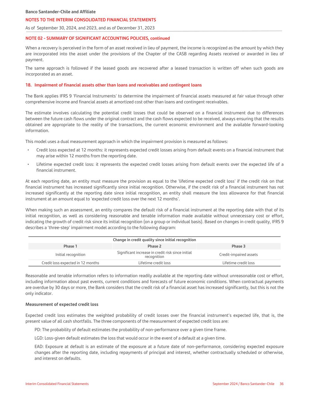 NOTE 02 - SUMMARY OF SIGNIFICANT ACCOUNTING POLICIES, continued When a recovery is perceived in the form of an asset received in lieu of payment, the income is recognized as the amount by which they are incorporated into the asset under the provisions of the Chapter of the CASB regarding Assets received or awarded in lieu of payment. The same approach is followed if the leased goods are recovered after a leased transaction is written off when such goods are incorporated as an asset. 18. Impairment of financial assets other than loans and receivables and contingent loans The Bank applies IFRS 9 'Financial Instruments' to determine the impairment of financial assets measured at fair value through other comprehensive income and financial assets at amortized cost other than loans and contingent receivables. The estimate involves calculating the potential credit losses that could be observed on a financial instrument due to differences between the future cash flows under the original contract and the cash flows expected to be received, always ensuring that the results obtained are appropriate to the reality of the transactions, the current economic environment and the available forward-looking information. This model uses a dual measurement approach in which the impairment provision is measured as follows: • Credit loss expected at 12 months: it represents expected credit losses arising from default events on a financial instrument that may arise within 12 months from the reporting date. • Lifetime expected credit loss: it represents the expected credit losses arising from default events over the expected life of a financial instrument. At each reporting date, an entity must measure the provision as equal to the 'lifetime expected credit loss' if the credit risk on that financial instrument has increased significantly since initial recognition. Otherwise, if the credit risk of a financial instrument has not increased significantly at the reporting date since initial recognition, an entity shall measure the loss allowance for that financial instrument at an amount equal to 'expected credit loss over the next 12 months'. When making such an assessment, an entity compares the default risk of a financial instrument at the reporting date with that of its initial recognition, as well as considering reasonable and tenable information made available without unnecessary cost or effort, indicating the growth of credit risk since its initial recognition (on a group or individual basis). Based on changes in credit quality, IFRS 9 describes a 'three-step' impairment model according to the following diagram: Change in credit quality since initial recognition Phase 1 Phase 2 Phase 3 Initial recognition Significant increase in credit risk since initial recognition Credit-impaired assets Credit loss expected in 12 months Lifetime credit loss Lifetime credit loss Reasonable and tenable information refers to information readily available at the reporting date without unreasonable cost or effort, including information about past events, current conditions and forecasts of future economic conditions. When contractual payments are overdue by 30 days or more, the Bank considers that the credit risk of a financial asset has increased significantly, but this is not the only indicator. Measurement of expected credit loss Expected credit loss estimates the weighted probability of credit losses over the financial instrument's expected life, that is, the present value of all cash shortfalls. The three components of the measurement of expected credit loss are: PD: The probability of default estimates the probability of non-performance over a given time frame. LGD: Loss-given default estimates the loss that would occur in the event of a default at a given time. EAD: Exposure at default is an estimate of the exposure at a future date of non-performance, considering expected exposure changes after the reporting date, including repayments of principal and interest, whether contractually scheduled or otherwise, and interest on defaults. Banco Santander-Chile and Affiliate NOTES TO THE INTERIM CONSOLIDATED FINANCIAL STATEMENTS As of September 30, 2024, and 2023, and as of December 31, 2023 Interim Consolidated Financial Statements September 2024 / Banco Santander-Chile 36