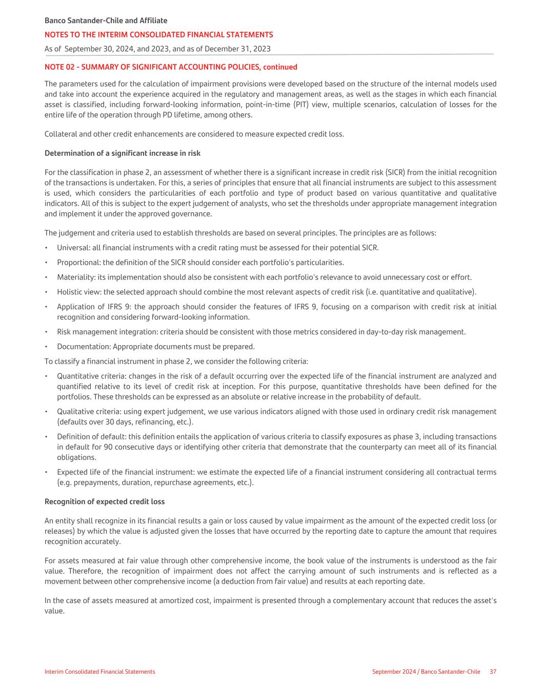 NOTE 02 - SUMMARY OF SIGNIFICANT ACCOUNTING POLICIES, continued The parameters used for the calculation of impairment provisions were developed based on the structure of the internal models used and take into account the experience acquired in the regulatory and management areas, as well as the stages in which each financial asset is classified, including forward-looking information, point-in-time (PIT) view, multiple scenarios, calculation of losses for the entire life of the operation through PD lifetime, among others. Collateral and other credit enhancements are considered to measure expected credit loss. Determination of a significant increase in risk For the classification in phase 2, an assessment of whether there is a significant increase in credit risk (SICR) from the initial recognition of the transactions is undertaken. For this, a series of principles that ensure that all financial instruments are subject to this assessment is used, which considers the particularities of each portfolio and type of product based on various quantitative and qualitative indicators. All of this is subject to the expert judgement of analysts, who set the thresholds under appropriate management integration and implement it under the approved governance. The judgement and criteria used to establish thresholds are based on several principles. The principles are as follows: • Universal: all financial instruments with a credit rating must be assessed for their potential SICR. • Proportional: the definition of the SICR should consider each portfolio's particularities. • Materiality: its implementation should also be consistent with each portfolio's relevance to avoid unnecessary cost or effort. • Holistic view: the selected approach should combine the most relevant aspects of credit risk (i.e. quantitative and qualitative). • Application of IFRS 9: the approach should consider the features of IFRS 9, focusing on a comparison with credit risk at initial recognition and considering forward-looking information. • Risk management integration: criteria should be consistent with those metrics considered in day-to-day risk management. • Documentation: Appropriate documents must be prepared. To classify a financial instrument in phase 2, we consider the following criteria: • Quantitative criteria: changes in the risk of a default occurring over the expected life of the financial instrument are analyzed and quantified relative to its level of credit risk at inception. For this purpose, quantitative thresholds have been defined for the portfolios. These thresholds can be expressed as an absolute or relative increase in the probability of default. • Qualitative criteria: using expert judgement, we use various indicators aligned with those used in ordinary credit risk management (defaults over 30 days, refinancing, etc.). • Definition of default: this definition entails the application of various criteria to classify exposures as phase 3, including transactions in default for 90 consecutive days or identifying other criteria that demonstrate that the counterparty can meet all of its financial obligations. • Expected life of the financial instrument: we estimate the expected life of a financial instrument considering all contractual terms (e.g. prepayments, duration, repurchase agreements, etc.). Recognition of expected credit loss An entity shall recognize in its financial results a gain or loss caused by value impairment as the amount of the expected credit loss (or releases) by which the value is adjusted given the losses that have occurred by the reporting date to capture the amount that requires recognition accurately. For assets measured at fair value through other comprehensive income, the book value of the instruments is understood as the fair value. Therefore, the recognition of impairment does not affect the carrying amount of such instruments and is reflected as a movement between other comprehensive income (a deduction from fair value) and results at each reporting date. In the case of assets measured at amortized cost, impairment is presented through a complementary account that reduces the asset's value. Banco Santander-Chile and Affiliate NOTES TO THE INTERIM CONSOLIDATED FINANCIAL STATEMENTS As of September 30, 2024, and 2023, and as of December 31, 2023 Interim Consolidated Financial Statements September 2024 / Banco Santander-Chile 37