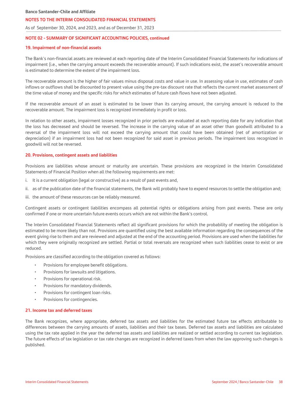 NOTE 02 - SUMMARY OF SIGNIFICANT ACCOUNTING POLICIES, continued 19. Impairment of non-financial assets The Bank's non-financial assets are reviewed at each reporting date of the Interim Consolidated Financial Statements for indications of impairment (i.e., when the carrying amount exceeds the recoverable amount). If such indications exist, the asset's recoverable amount is estimated to determine the extent of the impairment loss. The recoverable amount is the higher of fair values minus disposal costs and value in use. In assessing value in use, estimates of cash inflows or outflows shall be discounted to present value using the pre-tax discount rate that reflects the current market assessment of the time value of money and the specific risks for which estimates of future cash flows have not been adjusted. If the recoverable amount of an asset is estimated to be lower than its carrying amount, the carrying amount is reduced to the recoverable amount. The impairment loss is recognized immediately in profit or loss. In relation to other assets, impairment losses recognized in prior periods are evaluated at each reporting date for any indication that the loss has decreased and should be reversed. The increase in the carrying value of an asset other than goodwill attributed to a reversal of the impairment loss will not exceed the carrying amount that could have been obtained (net of amortization or depreciation) if an impairment loss had not been recognized for said asset in previous periods. The impairment loss recognized in goodwill will not be reversed. 20. Provisions, contingent assets and liabilities Provisions are liabilities whose amount or maturity are uncertain. These provisions are recognized in the Interim Consolidated Statements of Financial Position when all the following requirements are met: i. It is a current obligation (legal or constructive) as a result of past events and, ii. as of the publication date of the financial statements, the Bank will probably have to expend resources to settle the obligation and; iii. the amount of these resources can be reliably measured. Contingent assets or contingent liabilities encompass all potential rights or obligations arising from past events. These are only confirmed if one or more uncertain future events occurs which are not within the Bank's control. The Interim Consolidated Financial Statements reflect all significant provisions for which the probability of meeting the obligation is estimated to be more likely than not. Provisions are quantified using the best available information regarding the consequences of the event giving rise to them and are reviewed and adjusted at the end of the accounting period. Provisions are used when the liabilities for which they were originally recognized are settled. Partial or total reversals are recognized when such liabilities cease to exist or are reduced. Provisions are classified according to the obligation covered as follows: • Provisions for employee benefit obligations. • Provisions for lawsuits and litigations. • Provisions for operational risk. • Provisions for mandatory dividends. • Provisions for contingent loan risks. • Provisions for contingencies. 21. Income tax and deferred taxes The Bank recognizes, where appropriate, deferred tax assets and liabilities for the estimated future tax effects attributable to differences between the carrying amounts of assets, liabilities and their tax bases. Deferred tax assets and liabilities are calculated using the tax rate applied in the year the deferred tax assets and liabilities are realized or settled according to current tax legislation. The future effects of tax legislation or tax rate changes are recognized in deferred taxes from when the law approving such changes is published. Banco Santander-Chile and Affiliate NOTES TO THE INTERIM CONSOLIDATED FINANCIAL STATEMENTS As of September 30, 2024, and 2023, and as of December 31, 2023 Interim Consolidated Financial Statements September 2024 / Banco Santander-Chile 38
