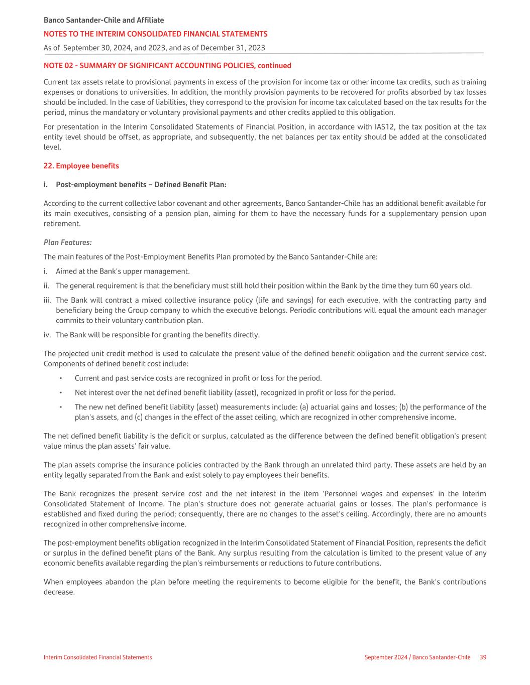 NOTE 02 - SUMMARY OF SIGNIFICANT ACCOUNTING POLICIES, continued Current tax assets relate to provisional payments in excess of the provision for income tax or other income tax credits, such as training expenses or donations to universities. In addition, the monthly provision payments to be recovered for profits absorbed by tax losses should be included. In the case of liabilities, they correspond to the provision for income tax calculated based on the tax results for the period, minus the mandatory or voluntary provisional payments and other credits applied to this obligation. For presentation in the Interim Consolidated Statements of Financial Position, in accordance with IAS12, the tax position at the tax entity level should be offset, as appropriate, and subsequently, the net balances per tax entity should be added at the consolidated level. 22. Employee benefits i. Post-employment benefits – Defined Benefit Plan: According to the current collective labor covenant and other agreements, Banco Santander-Chile has an additional benefit available for its main executives, consisting of a pension plan, aiming for them to have the necessary funds for a supplementary pension upon retirement. Plan Features: The main features of the Post-Employment Benefits Plan promoted by the Banco Santander-Chile are: i. Aimed at the Bank's upper management. ii. The general requirement is that the beneficiary must still hold their position within the Bank by the time they turn 60 years old. iii. The Bank will contract a mixed collective insurance policy (life and savings) for each executive, with the contracting party and beneficiary being the Group company to which the executive belongs. Periodic contributions will equal the amount each manager commits to their voluntary contribution plan. iv. The Bank will be responsible for granting the benefits directly. The projected unit credit method is used to calculate the present value of the defined benefit obligation and the current service cost. Components of defined benefit cost include: • Current and past service costs are recognized in profit or loss for the period. • Net interest over the net defined benefit liability (asset), recognized in profit or loss for the period. • The new net defined benefit liability (asset) measurements include: (a) actuarial gains and losses; (b) the performance of the plan's assets, and (c) changes in the effect of the asset ceiling, which are recognized in other comprehensive income. The net defined benefit liability is the deficit or surplus, calculated as the difference between the defined benefit obligation's present value minus the plan assets' fair value. The plan assets comprise the insurance policies contracted by the Bank through an unrelated third party. These assets are held by an entity legally separated from the Bank and exist solely to pay employees their benefits. The Bank recognizes the present service cost and the net interest in the item 'Personnel wages and expenses' in the Interim Consolidated Statement of Income. The plan's structure does not generate actuarial gains or losses. The plan's performance is established and fixed during the period; consequently, there are no changes to the asset's ceiling. Accordingly, there are no amounts recognized in other comprehensive income. The post-employment benefits obligation recognized in the Interim Consolidated Statement of Financial Position, represents the deficit or surplus in the defined benefit plans of the Bank. Any surplus resulting from the calculation is limited to the present value of any economic benefits available regarding the plan's reimbursements or reductions to future contributions. When employees abandon the plan before meeting the requirements to become eligible for the benefit, the Bank's contributions decrease. Banco Santander-Chile and Affiliate NOTES TO THE INTERIM CONSOLIDATED FINANCIAL STATEMENTS As of September 30, 2024, and 2023, and as of December 31, 2023 Interim Consolidated Financial Statements September 2024 / Banco Santander-Chile 39
