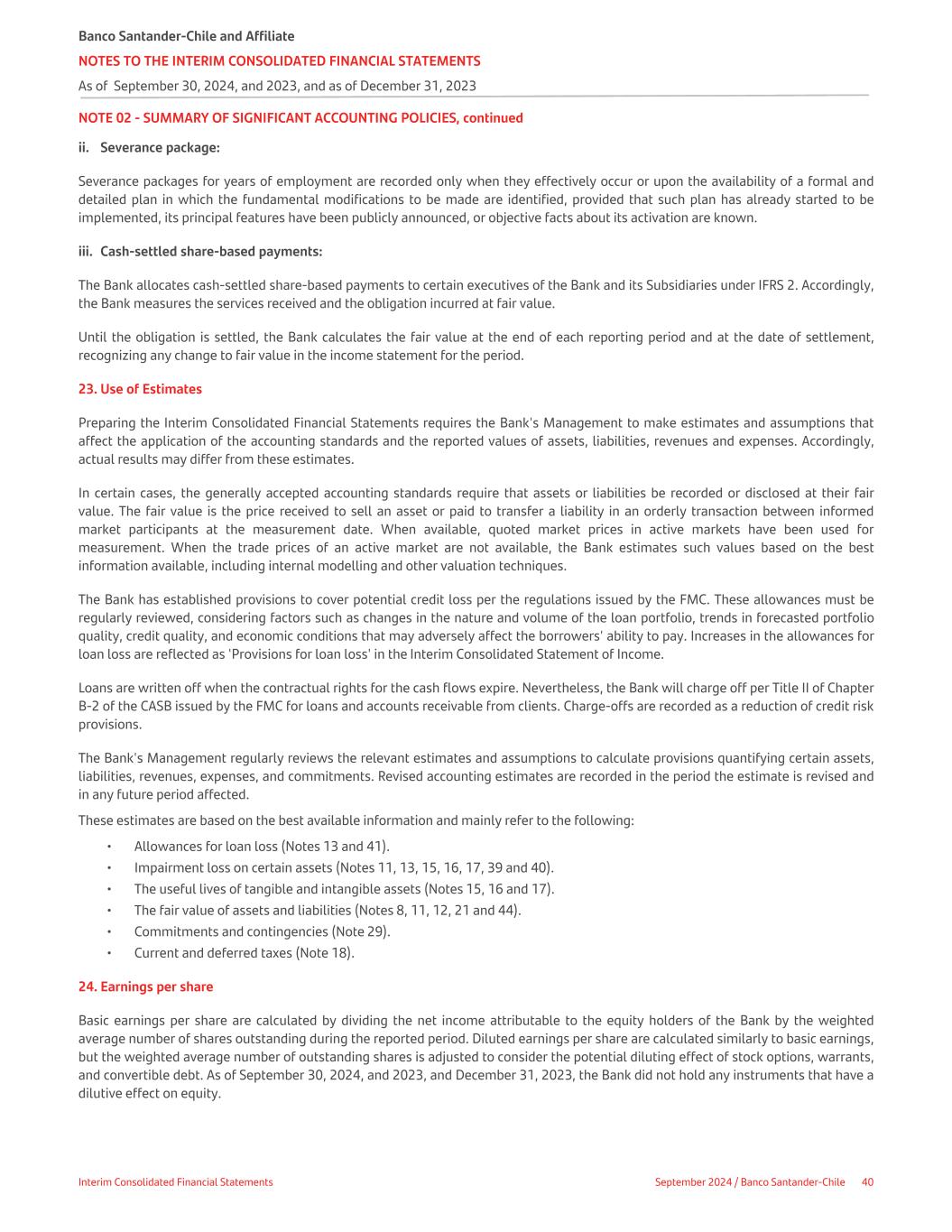NOTE 02 - SUMMARY OF SIGNIFICANT ACCOUNTING POLICIES, continued ii. Severance package: Severance packages for years of employment are recorded only when they effectively occur or upon the availability of a formal and detailed plan in which the fundamental modifications to be made are identified, provided that such plan has already started to be implemented, its principal features have been publicly announced, or objective facts about its activation are known. iii. Cash-settled share-based payments: The Bank allocates cash-settled share-based payments to certain executives of the Bank and its Subsidiaries under IFRS 2. Accordingly, the Bank measures the services received and the obligation incurred at fair value. Until the obligation is settled, the Bank calculates the fair value at the end of each reporting period and at the date of settlement, recognizing any change to fair value in the income statement for the period. 23. Use of Estimates Preparing the Interim Consolidated Financial Statements requires the Bank's Management to make estimates and assumptions that affect the application of the accounting standards and the reported values of assets, liabilities, revenues and expenses. Accordingly, actual results may differ from these estimates. In certain cases, the generally accepted accounting standards require that assets or liabilities be recorded or disclosed at their fair value. The fair value is the price received to sell an asset or paid to transfer a liability in an orderly transaction between informed market participants at the measurement date. When available, quoted market prices in active markets have been used for measurement. When the trade prices of an active market are not available, the Bank estimates such values based on the best information available, including internal modelling and other valuation techniques. The Bank has established provisions to cover potential credit loss per the regulations issued by the FMC. These allowances must be regularly reviewed, considering factors such as changes in the nature and volume of the loan portfolio, trends in forecasted portfolio quality, credit quality, and economic conditions that may adversely affect the borrowers' ability to pay. Increases in the allowances for loan loss are reflected as 'Provisions for loan loss' in the Interim Consolidated Statement of Income. Loans are written off when the contractual rights for the cash flows expire. Nevertheless, the Bank will charge off per Title II of Chapter B-2 of the CASB issued by the FMC for loans and accounts receivable from clients. Charge-offs are recorded as a reduction of credit risk provisions. The Bank's Management regularly reviews the relevant estimates and assumptions to calculate provisions quantifying certain assets, liabilities, revenues, expenses, and commitments. Revised accounting estimates are recorded in the period the estimate is revised and in any future period affected. These estimates are based on the best available information and mainly refer to the following: • Allowances for loan loss (Notes 13 and 41). • Impairment loss on certain assets (Notes 11, 13, 15, 16, 17, 39 and 40). • The useful lives of tangible and intangible assets (Notes 15, 16 and 17). • The fair value of assets and liabilities (Notes 8, 11, 12, 21 and 44). • Commitments and contingencies (Note 29). • Current and deferred taxes (Note 18). 24. Earnings per share Basic earnings per share are calculated by dividing the net income attributable to the equity holders of the Bank by the weighted average number of shares outstanding during the reported period. Diluted earnings per share are calculated similarly to basic earnings, but the weighted average number of outstanding shares is adjusted to consider the potential diluting effect of stock options, warrants, and convertible debt. As of September 30, 2024, and 2023, and December 31, 2023, the Bank did not hold any instruments that have a dilutive effect on equity. Banco Santander-Chile and Affiliate NOTES TO THE INTERIM CONSOLIDATED FINANCIAL STATEMENTS As of September 30, 2024, and 2023, and as of December 31, 2023 Interim Consolidated Financial Statements September 2024 / Banco Santander-Chile 40