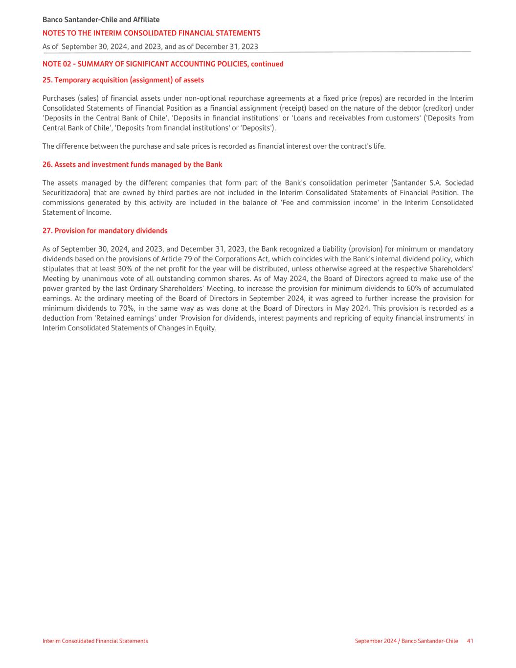 NOTE 02 - SUMMARY OF SIGNIFICANT ACCOUNTING POLICIES, continued 25. Temporary acquisition (assignment) of assets Purchases (sales) of financial assets under non-optional repurchase agreements at a fixed price (repos) are recorded in the Interim Consolidated Statements of Financial Position as a financial assignment (receipt) based on the nature of the debtor (creditor) under 'Deposits in the Central Bank of Chile', 'Deposits in financial institutions' or 'Loans and receivables from customers' ('Deposits from Central Bank of Chile', 'Deposits from financial institutions' or 'Deposits'). The difference between the purchase and sale prices is recorded as financial interest over the contract's life. 26. Assets and investment funds managed by the Bank The assets managed by the different companies that form part of the Bank's consolidation perimeter (Santander S.A. Sociedad Securitizadora) that are owned by third parties are not included in the Interim Consolidated Statements of Financial Position. The commissions generated by this activity are included in the balance of 'Fee and commission income' in the Interim Consolidated Statement of Income. 27. Provision for mandatory dividends As of September 30, 2024, and 2023, and December 31, 2023, the Bank recognized a liability (provision) for minimum or mandatory dividends based on the provisions of Article 79 of the Corporations Act, which coincides with the Bank's internal dividend policy, which stipulates that at least 30% of the net profit for the year will be distributed, unless otherwise agreed at the respective Shareholders' Meeting by unanimous vote of all outstanding common shares. As of May 2024, the Board of Directors agreed to make use of the power granted by the last Ordinary Shareholders' Meeting, to increase the provision for minimum dividends to 60% of accumulated earnings. At the ordinary meeting of the Board of Directors in September 2024, it was agreed to further increase the provision for minimum dividends to 70%, in the same way as was done at the Board of Directors in May 2024. This provision is recorded as a deduction from 'Retained earnings' under 'Provision for dividends, interest payments and repricing of equity financial instruments' in Interim Consolidated Statements of Changes in Equity. Banco Santander-Chile and Affiliate NOTES TO THE INTERIM CONSOLIDATED FINANCIAL STATEMENTS As of September 30, 2024, and 2023, and as of December 31, 2023 Interim Consolidated Financial Statements September 2024 / Banco Santander-Chile 41