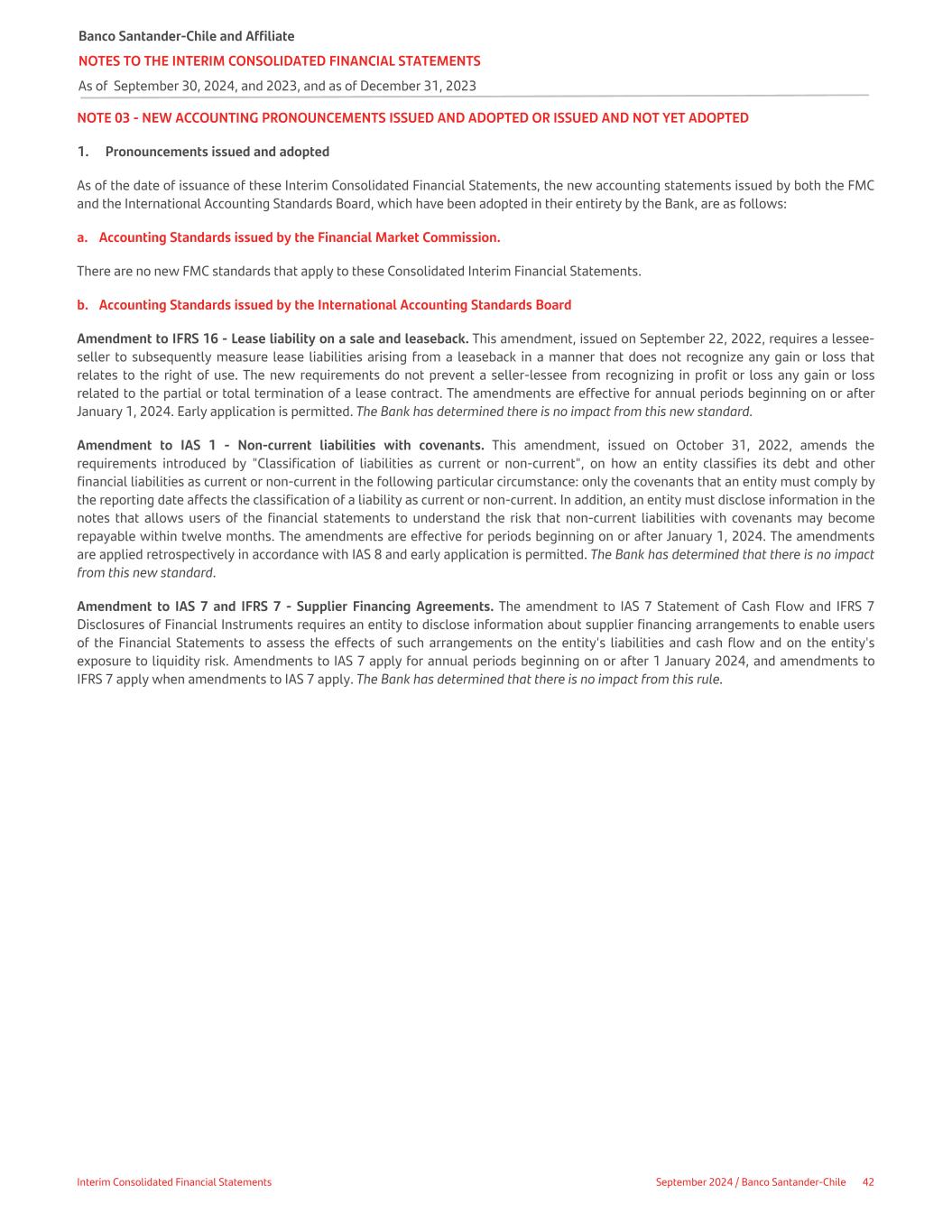 NOTE 03 - NEW ACCOUNTING PRONOUNCEMENTS ISSUED AND ADOPTED OR ISSUED AND NOT YET ADOPTED 1. Pronouncements issued and adopted As of the date of issuance of these Interim Consolidated Financial Statements, the new accounting statements issued by both the FMC and the International Accounting Standards Board, which have been adopted in their entirety by the Bank, are as follows: a. Accounting Standards issued by the Financial Market Commission. There are no new FMC standards that apply to these Consolidated Interim Financial Statements. b. Accounting Standards issued by the International Accounting Standards Board Amendment to IFRS 16 - Lease liability on a sale and leaseback. This amendment, issued on September 22, 2022, requires a lessee- seller to subsequently measure lease liabilities arising from a leaseback in a manner that does not recognize any gain or loss that relates to the right of use. The new requirements do not prevent a seller-lessee from recognizing in profit or loss any gain or loss related to the partial or total termination of a lease contract. The amendments are effective for annual periods beginning on or after January 1, 2024. Early application is permitted. The Bank has determined there is no impact from this new standard. Amendment to IAS 1 - Non-current liabilities with covenants. This amendment, issued on October 31, 2022, amends the requirements introduced by "Classification of liabilities as current or non-current", on how an entity classifies its debt and other financial liabilities as current or non-current in the following particular circumstance: only the covenants that an entity must comply by the reporting date affects the classification of a liability as current or non-current. In addition, an entity must disclose information in the notes that allows users of the financial statements to understand the risk that non-current liabilities with covenants may become repayable within twelve months. The amendments are effective for periods beginning on or after January 1, 2024. The amendments are applied retrospectively in accordance with IAS 8 and early application is permitted. The Bank has determined that there is no impact from this new standard. Amendment to IAS 7 and IFRS 7 - Supplier Financing Agreements. The amendment to IAS 7 Statement of Cash Flow and IFRS 7 Disclosures of Financial Instruments requires an entity to disclose information about supplier financing arrangements to enable users of the Financial Statements to assess the effects of such arrangements on the entity's liabilities and cash flow and on the entity's exposure to liquidity risk. Amendments to IAS 7 apply for annual periods beginning on or after 1 January 2024, and amendments to IFRS 7 apply when amendments to IAS 7 apply. The Bank has determined that there is no impact from this rule. Banco Santander-Chile and Affiliate NOTES TO THE INTERIM CONSOLIDATED FINANCIAL STATEMENTS As of September 30, 2024, and 2023, and as of December 31, 2023 Interim Consolidated Financial Statements September 2024 / Banco Santander-Chile 42