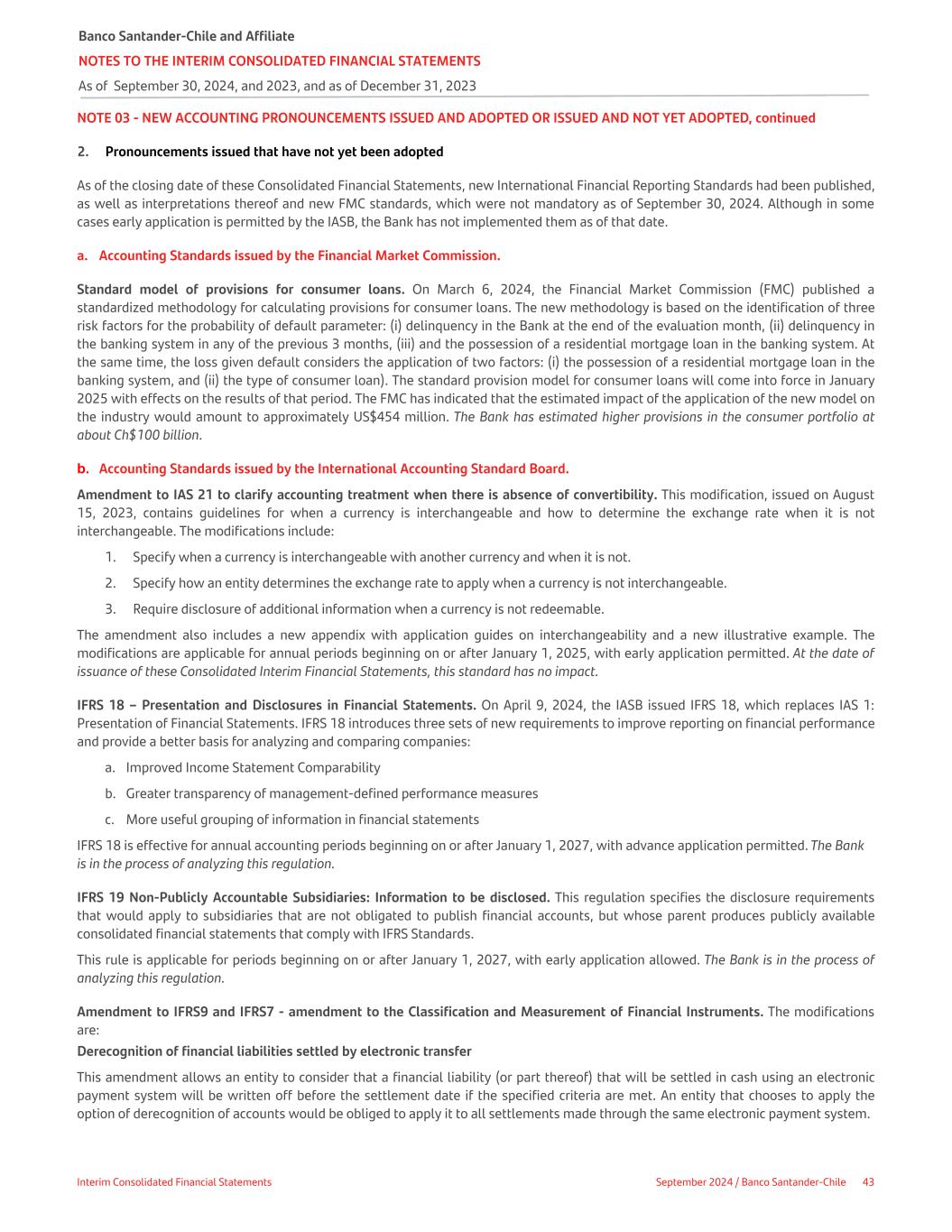 NOTE 03 - NEW ACCOUNTING PRONOUNCEMENTS ISSUED AND ADOPTED OR ISSUED AND NOT YET ADOPTED, continued 2. Pronouncements issued that have not yet been adopted As of the closing date of these Consolidated Financial Statements, new International Financial Reporting Standards had been published, as well as interpretations thereof and new FMC standards, which were not mandatory as of September 30, 2024. Although in some cases early application is permitted by the IASB, the Bank has not implemented them as of that date. a. Accounting Standards issued by the Financial Market Commission. Standard model of provisions for consumer loans. On March 6, 2024, the Financial Market Commission (FMC) published a standardized methodology for calculating provisions for consumer loans. The new methodology is based on the identification of three risk factors for the probability of default parameter: (i) delinquency in the Bank at the end of the evaluation month, (ii) delinquency in the banking system in any of the previous 3 months, (iii) and the possession of a residential mortgage loan in the banking system. At the same time, the loss given default considers the application of two factors: (i) the possession of a residential mortgage loan in the banking system, and (ii) the type of consumer loan). The standard provision model for consumer loans will come into force in January 2025 with effects on the results of that period. The FMC has indicated that the estimated impact of the application of the new model on the industry would amount to approximately US$454 million. The Bank has estimated higher provisions in the consumer portfolio at about Ch$100 billion. b. Accounting Standards issued by the International Accounting Standard Board. Amendment to IAS 21 to clarify accounting treatment when there is absence of convertibility. This modification, issued on August 15, 2023, contains guidelines for when a currency is interchangeable and how to determine the exchange rate when it is not interchangeable. The modifications include: 1. Specify when a currency is interchangeable with another currency and when it is not. 2. Specify how an entity determines the exchange rate to apply when a currency is not interchangeable. 3. Require disclosure of additional information when a currency is not redeemable. The amendment also includes a new appendix with application guides on interchangeability and a new illustrative example. The modifications are applicable for annual periods beginning on or after January 1, 2025, with early application permitted. At the date of issuance of these Consolidated Interim Financial Statements, this standard has no impact. IFRS 18 – Presentation and Disclosures in Financial Statements. On April 9, 2024, the IASB issued IFRS 18, which replaces IAS 1: Presentation of Financial Statements. IFRS 18 introduces three sets of new requirements to improve reporting on financial performance and provide a better basis for analyzing and comparing companies: a. Improved Income Statement Comparability b. Greater transparency of management-defined performance measures c. More useful grouping of information in financial statements IFRS 18 is effective for annual accounting periods beginning on or after January 1, 2027, with advance application permitted. The Bank is in the process of analyzing this regulation. IFRS 19 Non-Publicly Accountable Subsidiaries: Information to be disclosed. This regulation specifies the disclosure requirements that would apply to subsidiaries that are not obligated to publish financial accounts, but whose parent produces publicly available consolidated financial statements that comply with IFRS Standards. This rule is applicable for periods beginning on or after January 1, 2027, with early application allowed. The Bank is in the process of analyzing this regulation. Amendment to IFRS9 and IFRS7 - amendment to the Classification and Measurement of Financial Instruments. The modifications are: Derecognition of financial liabilities settled by electronic transfer This amendment allows an entity to consider that a financial liability (or part thereof) that will be settled in cash using an electronic payment system will be written off before the settlement date if the specified criteria are met. An entity that chooses to apply the option of derecognition of accounts would be obliged to apply it to all settlements made through the same electronic payment system. Banco Santander-Chile and Affiliate NOTES TO THE INTERIM CONSOLIDATED FINANCIAL STATEMENTS As of September 30, 2024, and 2023, and as of December 31, 2023 Interim Consolidated Financial Statements September 2024 / Banco Santander-Chile 43