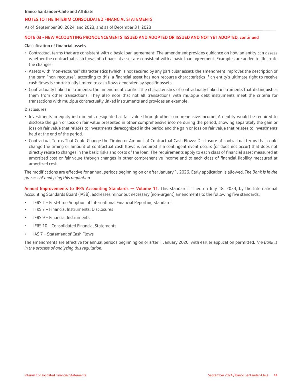 NOTE 03 - NEW ACCOUNTING PRONOUNCEMENTS ISSUED AND ADOPTED OR ISSUED AND NOT YET ADOPTED, continued Classification of financial assets • Contractual terms that are consistent with a basic loan agreement: The amendment provides guidance on how an entity can assess whether the contractual cash flows of a financial asset are consistent with a basic loan agreement. Examples are added to illustrate the changes. • Assets with "non-recourse" characteristics (which is not secured by any particular asset): the amendment improves the description of the term "non-recourse", according to this, a financial asset has non-recourse characteristics if an entity's ultimate right to receive cash flows is contractually limited to cash flows generated by specific assets. • Contractually linked instruments: the amendment clarifies the characteristics of contractually linked instruments that distinguishes them from other transactions. They also note that not all transactions with multiple debt instruments meet the criteria for transactions with multiple contractually linked instruments and provides an example. Disclosures • Investments in equity instruments designated at fair value through other comprehensive income: An entity would be required to disclose the gain or loss on fair value presented in other comprehensive income during the period, showing separately the gain or loss on fair value that relates to investments derecognized in the period and the gain or loss on fair value that relates to investments held at the end of the period. • Contractual Terms That Could Change the Timing or Amount of Contractual Cash Flows: Disclosure of contractual terms that could change the timing or amount of contractual cash flows is required if a contingent event occurs (or does not occur) that does not directly relate to changes in the basic risks and costs of the loan. The requirements apply to each class of financial asset measured at amortized cost or fair value through changes in other comprehensive income and to each class of financial liability measured at amortized cost. The modifications are effective for annual periods beginning on or after January 1, 2026. Early application is allowed. The Bank is in the process of analyzing this regulation. Annual Improvements to IFRS Accounting Standards — Volume 11. This standard, issued on July 18, 2024, by the International Accounting Standards Board (IASB), addresses minor but necessary (non-urgent) amendments to the following five standards: • IFRS 1 – First-time Adoption of International Financial Reporting Standards • IFRS 7 – Financial Instruments: Disclosures • IFRS 9 – Financial Instruments • IFRS 10 – Consolidated Financial Statements • IAS 7 – Statement of Cash Flows The amendments are effective for annual periods beginning on or after 1 January 2026, with earlier application permitted. The Bank is in the process of analyzing this regulation. Banco Santander-Chile and Affiliate NOTES TO THE INTERIM CONSOLIDATED FINANCIAL STATEMENTS As of September 30, 2024, and 2023, and as of December 31, 2023 Interim Consolidated Financial Statements September 2024 / Banco Santander-Chile 44