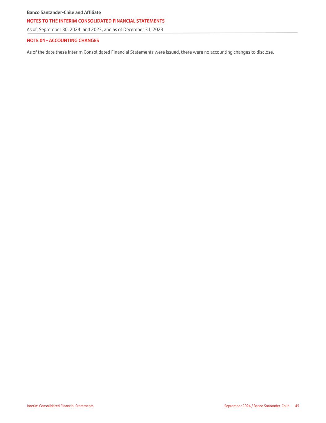 NOTE 04 - ACCOUNTING CHANGES As of the date these Interim Consolidated Financial Statements were issued, there were no accounting changes to disclose. Banco Santander-Chile and Affiliate NOTES TO THE INTERIM CONSOLIDATED FINANCIAL STATEMENTS As of September 30, 2024, and 2023, and as of December 31, 2023 Interim Consolidated Financial Statements September 2024 / Banco Santander-Chile 45