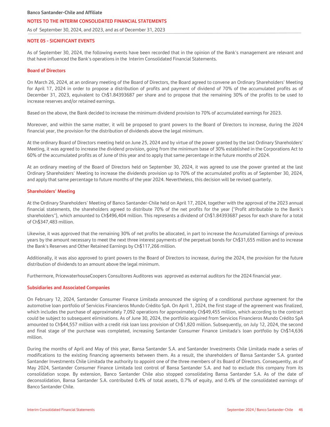 NOTE 05 - SIGNIFICANT EVENTS As of September 30, 2024, the following events have been recorded that in the opinion of the Bank's management are relevant and that have influenced the Bank's operations in the Interim Consolidated Financial Statements. Board of Directors On March 26, 2024, at an ordinary meeting of the Board of Directors, the Board agreed to convene an Ordinary Shareholders' Meeting for April 17, 2024 in order to propose a distribution of profits and payment of dividend of 70% of the accumulated profits as of December 31, 2023, equivalent to Ch$1.84393687 per share and to propose that the remaining 30% of the profits to be used to increase reserves and/or retained earnings. Based on the above, the Bank decided to increase the minimum dividend provision to 70% of accumulated earnings for 2023. Moreover, and within the same matter, it will be proposed to grant powers to the Board of Directors to increase, during the 2024 financial year, the provision for the distribution of dividends above the legal minimum. At the ordinary Board of Directors meeting held on June 25, 2024 and by virtue of the power granted by the last Ordinary Shareholders' Meeting, it was agreed to increase the dividend provision, going from the minimum base of 30% established in the Corporations Act to 60% of the accumulated profits as of June of this year and to apply that same percentage in the future months of 2024. At an ordinary meeting of the Board of Directors held on September 30, 2024, it was agreed to use the power granted at the last Ordinary Shareholders' Meeting to increase the dividends provision up to 70% of the accumulated profits as of September 30, 2024, and apply that same percentage to future months of the year 2024. Nevertheless, this decision will be revised quarterly. Shareholders' Meeting At the Ordinary Shareholders' Meeting of Banco Santander-Chile held on April 17, 2024, together with the approval of the 2023 annual financial statements, the shareholders agreed to distribute 70% of the net profits for the year ("Profit attributable to the Bank's shareholders"), which amounted to Ch$496,404 million. This represents a dividend of Ch$1.84393687 pesos for each share for a total of Ch$347,483 million. Likewise, it was approved that the remaining 30% of net profits be allocated, in part to increase the Accumulated Earnings of previous years by the amount necessary to meet the next three interest payments of the perpetual bonds for Ch$31,655 million and to increase the Bank's Reserves and Other Retained Earnings by Ch$117,266 million. Additionally, it was also approved to grant powers to the Board of Directors to increase, during the 2024, the provision for the future distribution of dividends to an amount above the legal minimum. Furthermore, PricewaterhouseCoopers Consultores Auditores was approved as external auditors for the 2024 financial year. Subsidiaries and Associated Companies On February 12, 2024, Santander Consumer Finance Limitada announced the signing of a conditional purchase agreement for the automotive loan portfolio of Servicios Financieros Mundo Crédito SpA. On April 1, 2024, the first stage of the agreement was finalized, which includes the purchase of approximately 7,092 operations for approximately Ch$49,455 million, which according to the contract could be subject to subsequent eliminations. As of June 30, 2024, the portfolio acquired from Servicios Financieros Mundo Crédito SpA amounted to Ch$44,557 million with a credit risk loan loss provision of Ch$1,820 million. Subsequently, on July 12, 2024, the second and final stage of the purchase was completed, increasing Santander Consumer Finance Limitada's loan portfolio by Ch$14,636 million. During the months of April and May of this year, Bansa Santander S.A. and Santander Investments Chile Limitada made a series of modifications to the existing financing agreements between them. As a result, the shareholders of Bansa Santander S.A. granted Santander Investments Chile Limitada the authority to appoint one of the three members of its Board of Directors. Consequently, as of May 2024, Santander Consumer Finance Limitada lost control of Bansa Santander S.A. and had to exclude this company from its consolidation scope. By extension, Banco Santander Chile also stopped consolidating Bansa Santander S.A. As of the date of deconsolidation, Bansa Santander S.A. contributed 0.4% of total assets, 0.7% of equity, and 0.4% of the consolidated earnings of Banco Santander Chile. Banco Santander-Chile and Affiliate NOTES TO THE INTERIM CONSOLIDATED FINANCIAL STATEMENTS As of September 30, 2024, and 2023, and as of December 31, 2023 Interim Consolidated Financial Statements September 2024 / Banco Santander-Chile 46