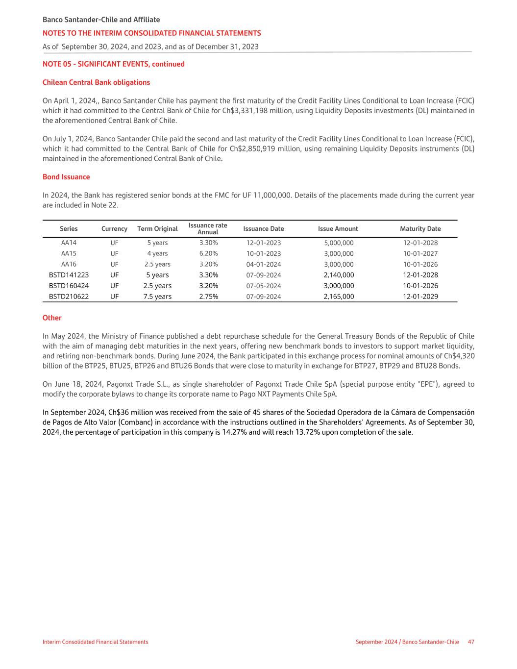 NOTE 05 - SIGNIFICANT EVENTS, continued Chilean Central Bank obligations On April 1, 2024,, Banco Santander Chile has payment the first maturity of the Credit Facility Lines Conditional to Loan Increase (FCIC) which it had committed to the Central Bank of Chile for Ch$3,331,198 million, using Liquidity Deposits investments (DL) maintained in the aforementioned Central Bank of Chile. On July 1, 2024, Banco Santander Chile paid the second and last maturity of the Credit Facility Lines Conditional to Loan Increase (FCIC), which it had committed to the Central Bank of Chile for Ch$2,850,919 million, using remaining Liquidity Deposits instruments (DL) maintained in the aforementioned Central Bank of Chile. Bond Issuance In 2024, the Bank has registered senior bonds at the FMC for UF 11,000,000. Details of the placements made during the current year are included in Note 22. Series Currency Term Original Issuance rate Annual Issuance Date Issue Amount Maturity Date AA14 UF 5 years 3.30% 12-01-2023 5,000,000 12-01-2028 AA15 UF 4 years 6.20% 10-01-2023 3,000,000 10-01-2027 AA16 UF 2.5 years 3.20% 04-01-2024 3,000,000 10-01-2026 BSTD141223 UF 5 years 3.30% 07-09-2024 2,140,000 12-01-2028 BSTD160424 UF 2.5 years 3.20% 07-05-2024 3,000,000 10-01-2026 BSTD210622 UF 7.5 years 2.75% 07-09-2024 2,165,000 12-01-2029 Other In May 2024, the Ministry of Finance published a debt repurchase schedule for the General Treasury Bonds of the Republic of Chile with the aim of managing debt maturities in the next years, offering new benchmark bonds to investors to support market liquidity, and retiring non-benchmark bonds. During June 2024, the Bank participated in this exchange process for nominal amounts of Ch$4,320 billion of the BTP25, BTU25, BTP26 and BTU26 Bonds that were close to maturity in exchange for BTP27, BTP29 and BTU28 Bonds. On June 18, 2024, Pagonxt Trade S.L., as single shareholder of Pagonxt Trade Chile SpA (special purpose entity "EPE"), agreed to modify the corporate bylaws to change its corporate name to Pago NXT Payments Chile SpA. In September 2024, Ch$36 million was received from the sale of 45 shares of the Sociedad Operadora de la Cámara de Compensación de Pagos de Alto Valor (Combanc) in accordance with the instructions outlined in the Shareholders' Agreements. As of September 30, 2024, the percentage of participation in this company is 14.27% and will reach 13.72% upon completion of the sale. Banco Santander-Chile and Affiliate NOTES TO THE INTERIM CONSOLIDATED FINANCIAL STATEMENTS As of September 30, 2024, and 2023, and as of December 31, 2023 Interim Consolidated Financial Statements September 2024 / Banco Santander-Chile 47