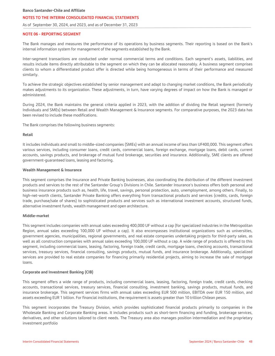 NOTE 06 - REPORTING SEGMENT The Bank manages and measures the performance of its operations by business segments. Their reporting is based on the Bank's internal information system for management of the segments established by the Bank. Inter-segment transactions are conducted under normal commercial terms and conditions. Each segment's assets, liabilities, and results include items directly attributable to the segment on which they can be allocated reasonably. A business segment comprises clients to whom a differentiated product offer is directed while being homogeneous in terms of their performance and measured similarly. To achieve the strategic objectives established by senior management and adapt to changing market conditions, the Bank periodically makes adjustments to its organization. These adjustments, in turn, have varying degrees of impact on how the Bank is managed or administered. During 2024, the Bank maintains the general criteria applied in 2023, with the addition of dividing the Retail segment (formerly Individuals and SMEs) between Retail and Wealth Management & Insurance segments. For comparative purposes, the 2023 data has been revised to include these modifications. The Bank comprises the following business segments: Retail It includes individuals and small to middle-sized companies (SMEs) with an annual income of less than UF400,000. This segment offers various services, including consumer loans, credit cards, commercial loans, foreign exchange, mortgage loans, debit cards, current accounts, savings products, and brokerage of mutual fund brokerage, securities and insurance. Additionally, SME clients are offered government-guaranteed loans, leasing and factoring. Wealth Management & Insurance This segment comprises the Insurance and Private Banking businesses, also coordinating the distribution of the different investment products and services to the rest of the Santander Group's Divisions in Chile. Santander Insurance's business offers both personal and business insurance products such as, health, life, travel, savings, personal protection, auto, unemployment, among others. Finally, to high-net-worth clients, Santander Private Banking offers everything from transactional products and services (credits, cards, foreign trade, purchase/sale of shares) to sophisticated products and services such as international investment accounts, structured funds, alternative investment funds, wealth management and open architecture. Middle-market This segment includes companies with annual sales exceeding 400,000 UF without a cap (for specialized industries in the Metropolitan Region, annual sales exceeding 100,000 UF without a cap). It also encompasses institutional organizations such as universities, government agencies, municipalities, regional governments, and real estate companies undertaking projects for third-party sales, as well as all construction companies with annual sales exceeding 100,000 UF without a cap. A wide range of products is offered to this segment, including commercial loans, leasing, factoring, foreign trade, credit cards, mortgage loans, checking accounts, transactional services, treasury services, financial consulting, savings products, mutual funds, and insurance brokerage. Additionally, specialized services are provided to real estate companies for financing primarily residential projects, aiming to increase the sale of mortgage loans. Corporate and Investment Banking (CIB) This segment offers a wide range of products, including commercial loans, leasing, factoring, foreign trade, credit cards, checking accounts, transactional services, treasury services, financial consulting, investment banking, savings products, mutual funds, and insurance brokerage. This segment services firms with annual sales exceeding EUR 500 million, EBITDA over EUR 150 million, and assets exceeding EUR 1 billion. For financial institutions, the requirement is assets greater than 10 trillion Chilean pesos. This segment incorporates the Treasury Division, which provides sophisticated financial products primarily to companies in the Wholesale Banking and Corporate Banking areas. It includes products such as short-term financing and funding, brokerage services, derivatives, and other solutions tailored to client needs. The Treasury area also manages position intermediation and the proprietary investment portfolio Banco Santander-Chile and Affiliate NOTES TO THE INTERIM CONSOLIDATED FINANCIAL STATEMENTS As of September 30, 2024, and 2023, and as of December 31, 2023 Interim Consolidated Financial Statements September 2024 / Banco Santander-Chile 48