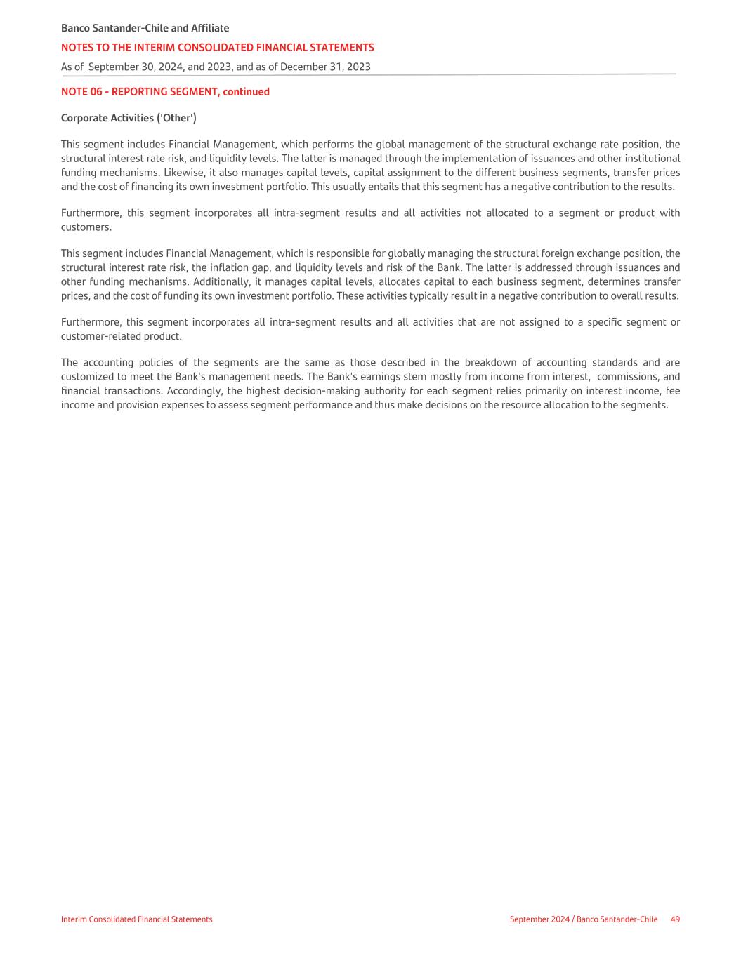 NOTE 06 - REPORTING SEGMENT, continued Corporate Activities ('Other') This segment includes Financial Management, which performs the global management of the structural exchange rate position, the structural interest rate risk, and liquidity levels. The latter is managed through the implementation of issuances and other institutional funding mechanisms. Likewise, it also manages capital levels, capital assignment to the different business segments, transfer prices and the cost of financing its own investment portfolio. This usually entails that this segment has a negative contribution to the results. Furthermore, this segment incorporates all intra-segment results and all activities not allocated to a segment or product with customers. This segment includes Financial Management, which is responsible for globally managing the structural foreign exchange position, the structural interest rate risk, the inflation gap, and liquidity levels and risk of the Bank. The latter is addressed through issuances and other funding mechanisms. Additionally, it manages capital levels, allocates capital to each business segment, determines transfer prices, and the cost of funding its own investment portfolio. These activities typically result in a negative contribution to overall results. Furthermore, this segment incorporates all intra-segment results and all activities that are not assigned to a specific segment or customer-related product. The accounting policies of the segments are the same as those described in the breakdown of accounting standards and are customized to meet the Bank's management needs. The Bank's earnings stem mostly from income from interest, commissions, and financial transactions. Accordingly, the highest decision-making authority for each segment relies primarily on interest income, fee income and provision expenses to assess segment performance and thus make decisions on the resource allocation to the segments. Banco Santander-Chile and Affiliate NOTES TO THE INTERIM CONSOLIDATED FINANCIAL STATEMENTS As of September 30, 2024, and 2023, and as of December 31, 2023 Interim Consolidated Financial Statements September 2024 / Banco Santander-Chile 49