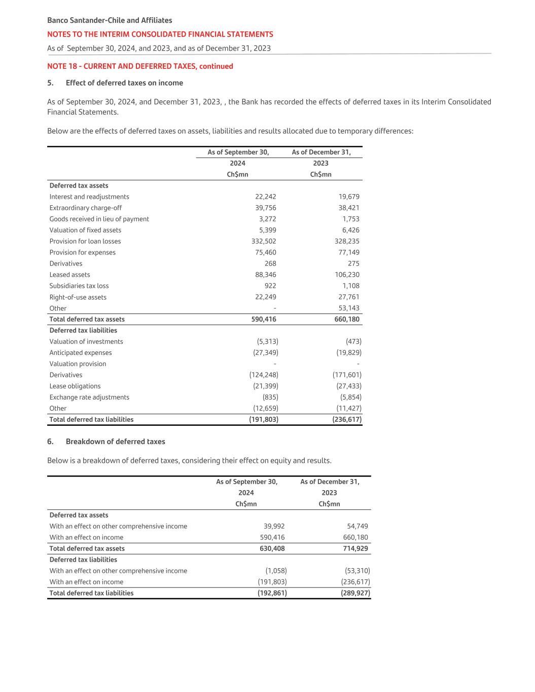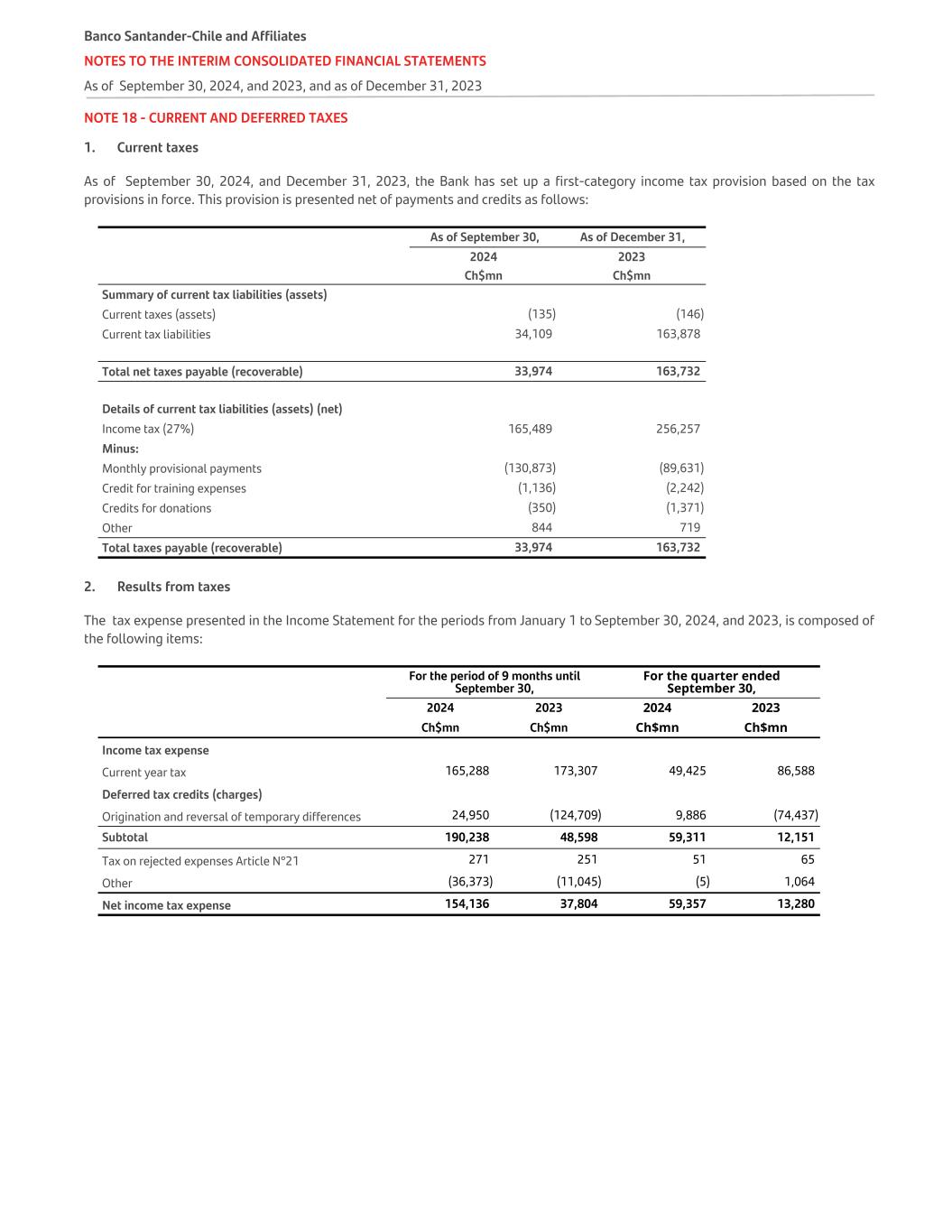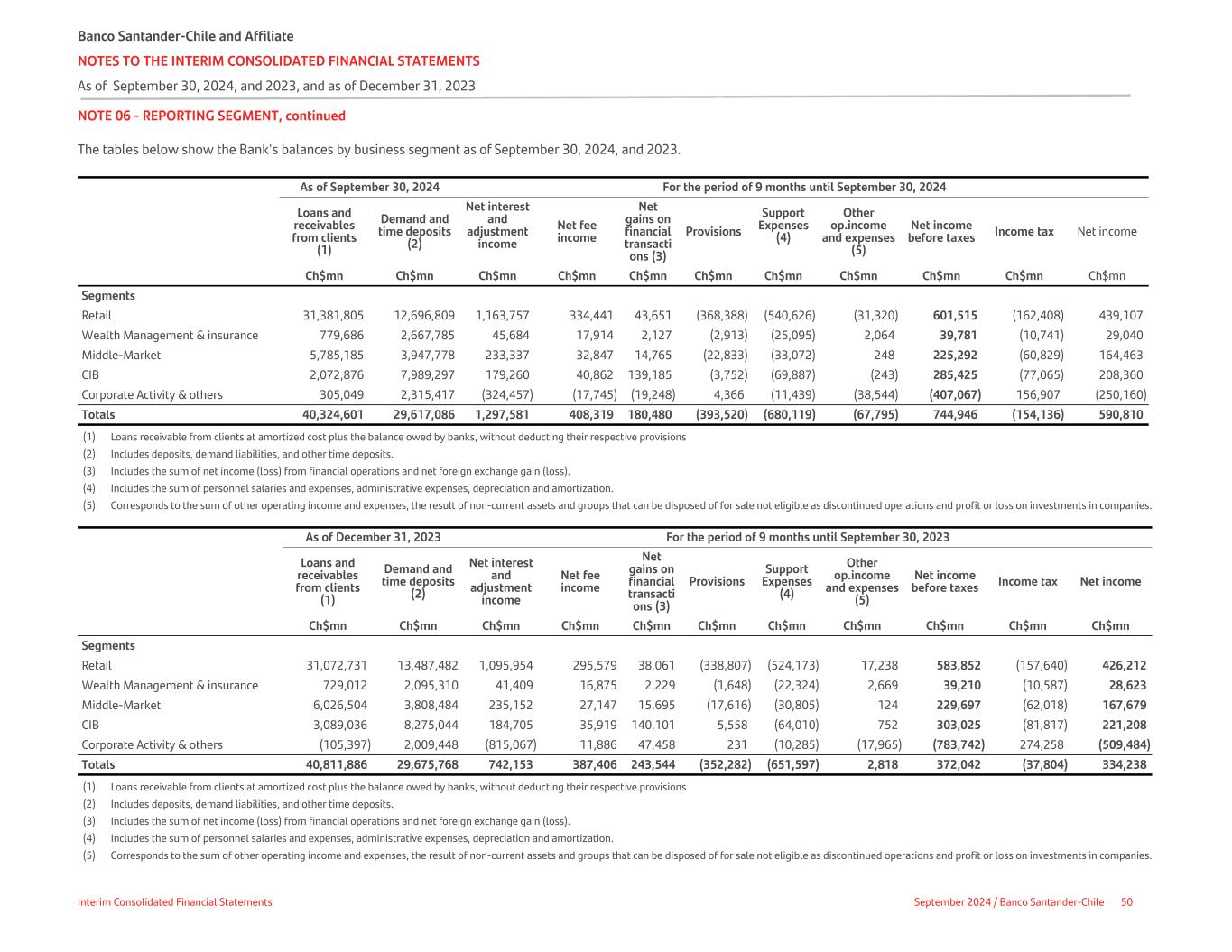 NOTE 06 - REPORTING SEGMENT, continued The tables below show the Bank's balances by business segment as of September 30, 2024, and 2023. As of September 30, 2024 For the period of 9 months until September 30, 2024 Loans and receivables from clients (1) Demand and time deposits (2) Net interest and adjustment income Net fee income Net gains on financial transacti ons (3) Provisions Support Expenses (4) Other op.income and expenses (5) Net income before taxes Income tax Net income Ch$mn Ch$mn Ch$mn Ch$mn Ch$mn Ch$mn Ch$mn Ch$mn Ch$mn Ch$mn Ch$mn Segments Retail 31,381,805 12,696,809 1,163,757 334,441 43,651 (368,388) (540,626) (31,320) 601,515 (162,408) 439,107 Wealth Management & insurance 779,686 2,667,785 45,684 17,914 2,127 (2,913) (25,095) 2,064 39,781 (10,741) 29,040 Middle-Market 5,785,185 3,947,778 233,337 32,847 14,765 (22,833) (33,072) 248 225,292 (60,829) 164,463 CIB 2,072,876 7,989,297 179,260 40,862 139,185 (3,752) (69,887) (243) 285,425 (77,065) 208,360 Corporate Activity & others 305,049 2,315,417 (324,457) (17,745) (19,248) 4,366 (11,439) (38,544) (407,067) 156,907 (250,160) Totals 40,324,601 29,617,086 1,297,581 408,319 180,480 (393,520) (680,119) (67,795) 744,946 (154,136) 590,810 (1) Loans receivable from clients at amortized cost plus the balance owed by banks, without deducting their respective provisions (2) Includes deposits, demand liabilities, and other time deposits. (3) Includes the sum of net income (loss) from financial operations and net foreign exchange gain (loss). (4) Includes the sum of personnel salaries and expenses, administrative expenses, depreciation and amortization. (5) Corresponds to the sum of other operating income and expenses, the result of non-current assets and groups that can be disposed of for sale not eligible as discontinued operations and profit or loss on investments in companies. As of December 31, 2023 For the period of 9 months until September 30, 2023 Loans and receivables from clients (1) Demand and time deposits (2) Net interest and adjustment income Net fee income Net gains on financial transacti ons (3) Provisions Support Expenses (4) Other op.income and expenses (5) Net income before taxes Income tax Net income Ch$mn Ch$mn Ch$mn Ch$mn Ch$mn Ch$mn Ch$mn Ch$mn Ch$mn Ch$mn Ch$mn Segments Retail 31,072,731 13,487,482 1,095,954 295,579 38,061 (338,807) (524,173) 17,238 583,852 (157,640) 426,212 Wealth Management & insurance 729,012 2,095,310 41,409 16,875 2,229 (1,648) (22,324) 2,669 39,210 (10,587) 28,623 Middle-Market 6,026,504 3,808,484 235,152 27,147 15,695 (17,616) (30,805) 124 229,697 (62,018) 167,679 CIB 3,089,036 8,275,044 184,705 35,919 140,101 5,558 (64,010) 752 303,025 (81,817) 221,208 Corporate Activity & others (105,397) 2,009,448 (815,067) 11,886 47,458 231 (10,285) (17,965) (783,742) 274,258 (509,484) Totals 40,811,886 29,675,768 742,153 387,406 243,544 (352,282) (651,597) 2,818 372,042 (37,804) 334,238 (1) Loans receivable from clients at amortized cost plus the balance owed by banks, without deducting their respective provisions (2) Includes deposits, demand liabilities, and other time deposits. (3) Includes the sum of net income (loss) from financial operations and net foreign exchange gain (loss). (4) Includes the sum of personnel salaries and expenses, administrative expenses, depreciation and amortization. (5) Corresponds to the sum of other operating income and expenses, the result of non-current assets and groups that can be disposed of for sale not eligible as discontinued operations and profit or loss on investments in companies. Banco Santander-Chile and Affiliate NOTES TO THE INTERIM CONSOLIDATED FINANCIAL STATEMENTS As of September 30, 2024, and 2023, and as of December 31, 2023 Interim Consolidated Financial Statements September 2024 / Banco Santander-Chile 50