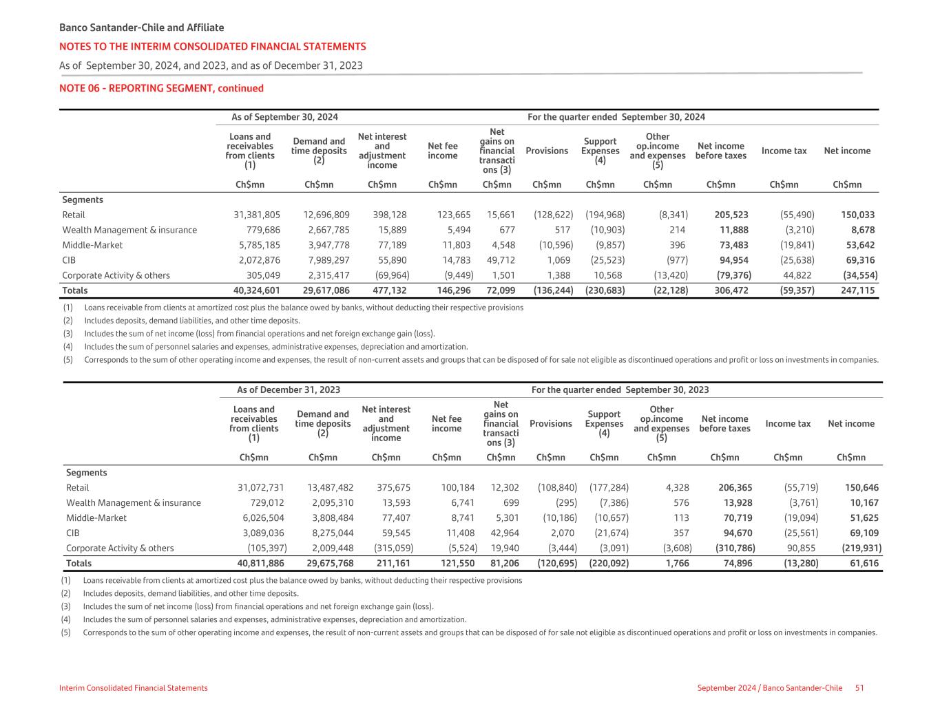 NOTE 06 - REPORTING SEGMENT, continued As of September 30, 2024 For the quarter ended September 30, 2024 Loans and receivables from clients (1) Demand and time deposits (2) Net interest and adjustment income Net fee income Net gains on financial transacti ons (3) Provisions Support Expenses (4) Other op.income and expenses (5) Net income before taxes Income tax Net income Ch$mn Ch$mn Ch$mn Ch$mn Ch$mn Ch$mn Ch$mn Ch$mn Ch$mn Ch$mn Ch$mn Segments Retail 31,381,805 12,696,809 398,128 123,665 15,661 (128,622) (194,968) (8,341) 205,523 (55,490) 150,033 Wealth Management & insurance 779,686 2,667,785 15,889 5,494 677 517 (10,903) 214 11,888 (3,210) 8,678 Middle-Market 5,785,185 3,947,778 77,189 11,803 4,548 (10,596) (9,857) 396 73,483 (19,841) 53,642 CIB 2,072,876 7,989,297 55,890 14,783 49,712 1,069 (25,523) (977) 94,954 (25,638) 69,316 Corporate Activity & others 305,049 2,315,417 (69,964) (9,449) 1,501 1,388 10,568 (13,420) (79,376) 44,822 (34,554) Totals 40,324,601 29,617,086 477,132 146,296 72,099 (136,244) (230,683) (22,128) 306,472 (59,357) 247,115 (1) Loans receivable from clients at amortized cost plus the balance owed by banks, without deducting their respective provisions (2) Includes deposits, demand liabilities, and other time deposits. (3) Includes the sum of net income (loss) from financial operations and net foreign exchange gain (loss). (4) Includes the sum of personnel salaries and expenses, administrative expenses, depreciation and amortization. (5) Corresponds to the sum of other operating income and expenses, the result of non-current assets and groups that can be disposed of for sale not eligible as discontinued operations and profit or loss on investments in companies. As of December 31, 2023 For the quarter ended September 30, 2023 Loans and receivables from clients (1) Demand and time deposits (2) Net interest and adjustment income Net fee income Net gains on financial transacti ons (3) Provisions Support Expenses (4) Other op.income and expenses (5) Net income before taxes Income tax Net income Ch$mn Ch$mn Ch$mn Ch$mn Ch$mn Ch$mn Ch$mn Ch$mn Ch$mn Ch$mn Ch$mn Segments Retail 31,072,731 13,487,482 375,675 100,184 12,302 (108,840) (177,284) 4,328 206,365 (55,719) 150,646 Wealth Management & insurance 729,012 2,095,310 13,593 6,741 699 (295) (7,386) 576 13,928 (3,761) 10,167 Middle-Market 6,026,504 3,808,484 77,407 8,741 5,301 (10,186) (10,657) 113 70,719 (19,094) 51,625 CIB 3,089,036 8,275,044 59,545 11,408 42,964 2,070 (21,674) 357 94,670 (25,561) 69,109 Corporate Activity & others (105,397) 2,009,448 (315,059) (5,524) 19,940 (3,444) (3,091) (3,608) (310,786) 90,855 (219,931) Totals 40,811,886 29,675,768 211,161 121,550 81,206 (120,695) (220,092) 1,766 74,896 (13,280) 61,616 (1) Loans receivable from clients at amortized cost plus the balance owed by banks, without deducting their respective provisions (2) Includes deposits, demand liabilities, and other time deposits. (3) Includes the sum of net income (loss) from financial operations and net foreign exchange gain (loss). (4) Includes the sum of personnel salaries and expenses, administrative expenses, depreciation and amortization. (5) Corresponds to the sum of other operating income and expenses, the result of non-current assets and groups that can be disposed of for sale not eligible as discontinued operations and profit or loss on investments in companies. Banco Santander-Chile and Affiliate NOTES TO THE INTERIM CONSOLIDATED FINANCIAL STATEMENTS As of September 30, 2024, and 2023, and as of December 31, 2023 Interim Consolidated Financial Statements September 2024 / Banco Santander-Chile 51